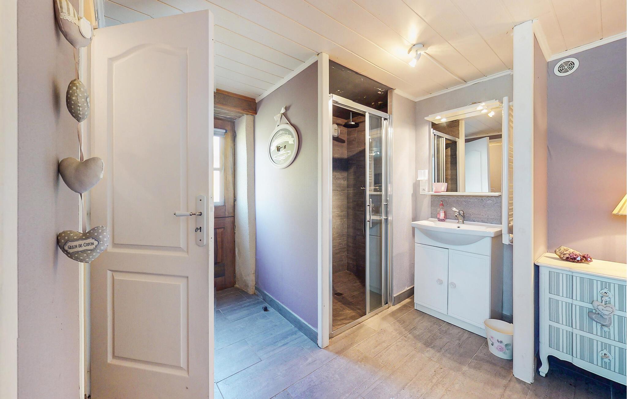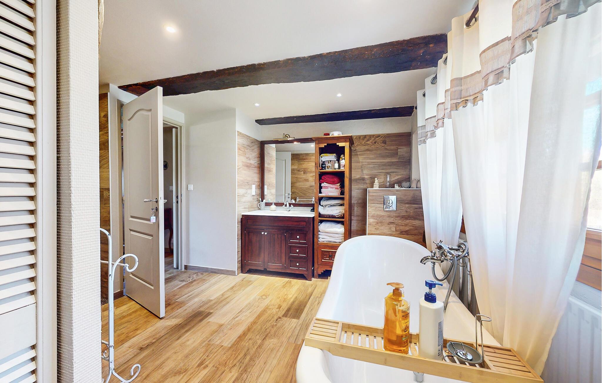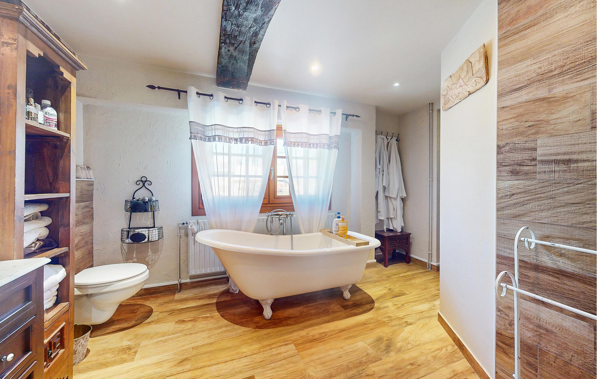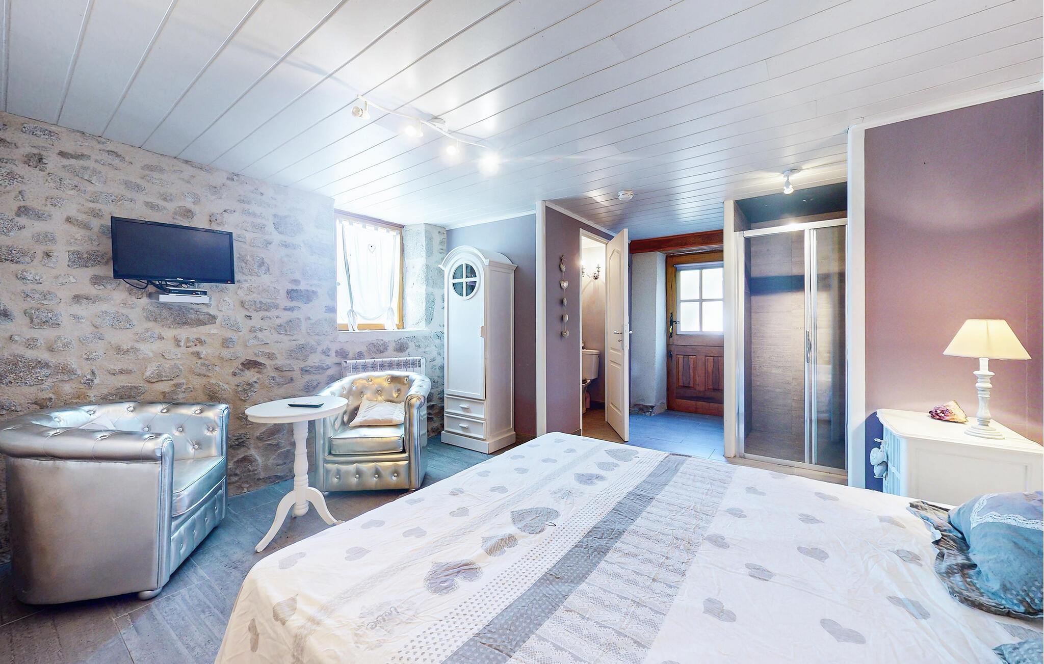 Dette traditionelle stenhus tilbyder ren afslapning omgivet af naturen. Nyd hyggelige timer i opholdsstuen med synlige bjælker, naturstensvægge og komfortable sofaer. Udnyt den stilfulde spisestue med udsigt over de grønne områder eller tilbring hyggelige aftener foran pejsen. Tilbered jeres måltider i det rummelige køkken, og nyd morgenmaden her om morgenen.