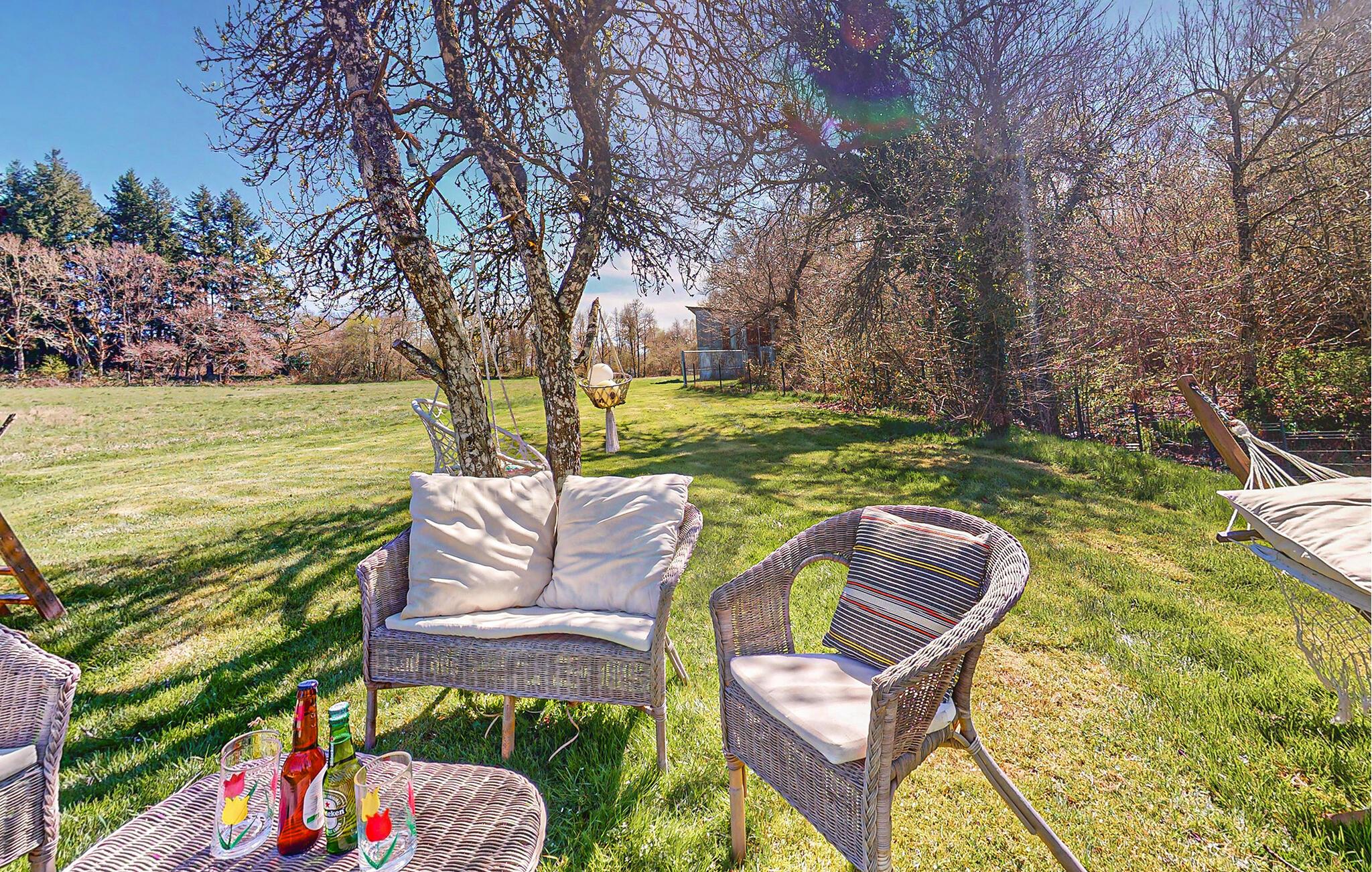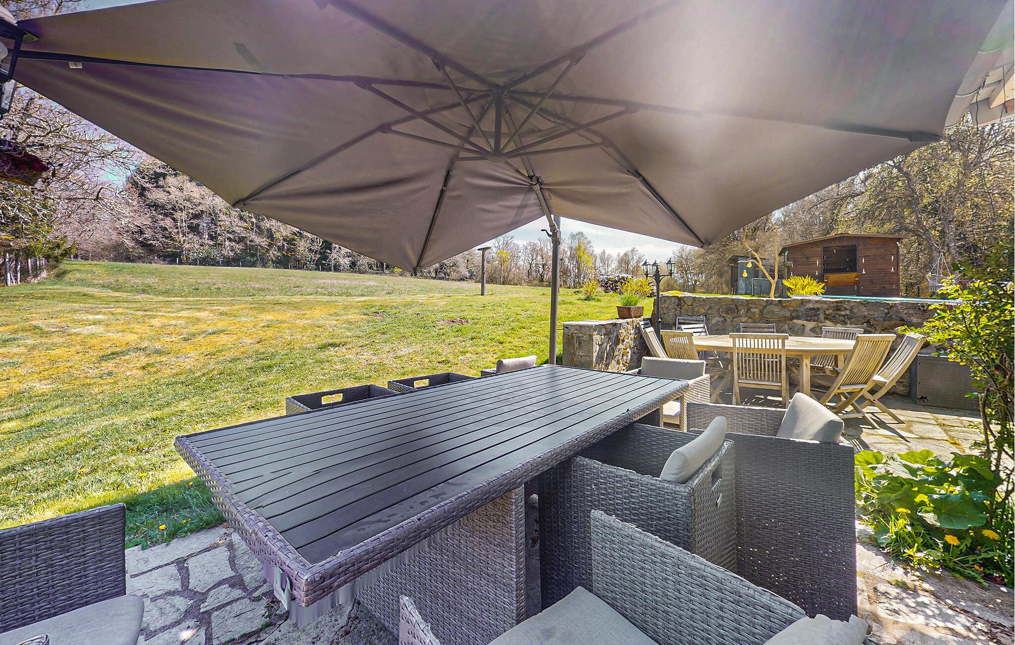 Træd ud på den smukke terrasse, og sæt jer godt til rette ved havebordet under parasollen. Svøm i jeres lille pool eller slap af på de stillede liggestole. Den rummelige have med enge, træer og hyggelige siddeområder lægger op til at blive hængende. Brug grillpladsen til fælles måltider under stjernerne.