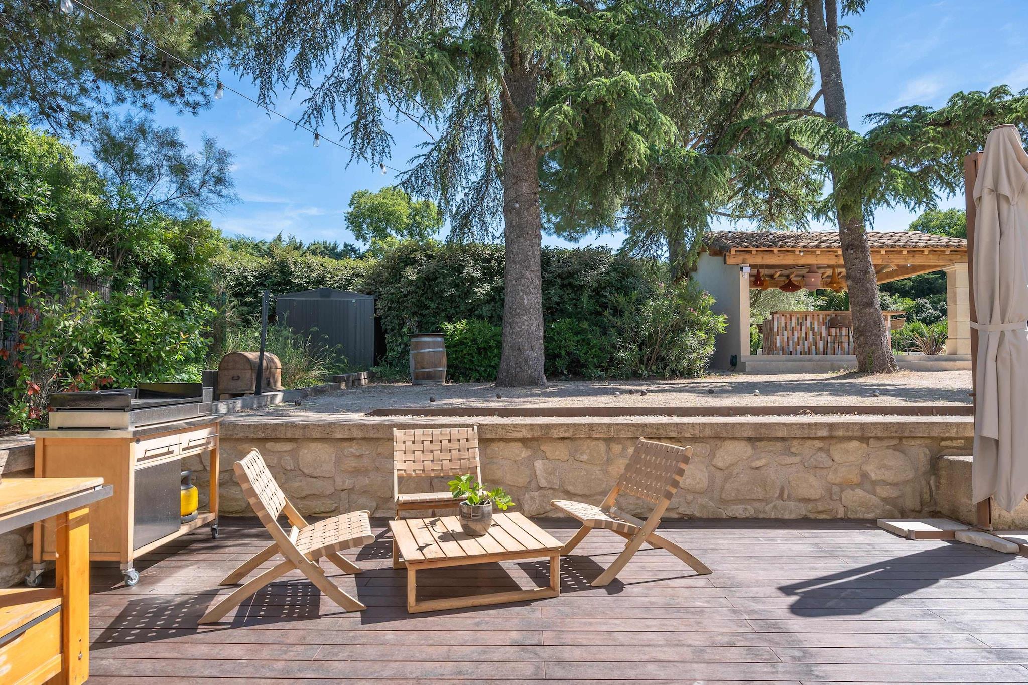 Velkommen til din provencalske flugt - denne villa ligger tæt på hjertet af Alpilles, nær Saint-Rémy-de-Provence, med olivenlunde, skyggefulde gårdhaver og landlig ro overalt. Det er et sted, hvor du kan bytte byens støj ud med fauna, smalle gyder ud med åben himmel og suse til rolige morgener. Villaens layout er ret ligetil - stueetagen består af en stor stue med tv, en lille stue med en lænestol og pejs, et kontorområde, en spisestue med plads til mindst et dusin gæster, et fuldt udstyret åbent køkken og to soveværelser møbleret med dobbeltsenge. Når du går op ad trappen til første sal, træder du ind i en lille stue, perfekt til spil og tv, og der er yderligere 4 suiter installeret med en dobbeltseng hver eller to enkeltsenge i det fjerde soveværelse. Alle soveværelser har et tilhørende badeværelse, aircondition og en afslappet indretning overalt, hvilket giver et moderne præg til rustikke omgivelser. For ekstra bekvemmelighed får du et bryggers til bagage og forsyninger. Udenfor finder du villaens perle: en privat pool, ideel til at køle af efter middagssolen eller til at slappe af med venner, mens du nipper til en kold drink. En skyggefuld terrasse indbyder til aftengrillfester, afslappede måltider eller stille eftermiddage under træerne. Det omkringliggende grønt skaber en fredelig og afsides atmosfære, selvom du er tæt på byens faciliteter. Herfra er du godt placeret til at udforske Saint-Rémys historiske centrum, lokale caféer og provencalske charme. De nærliggende bakker og stier i Alpilles tilbyder vandre- eller cykelruter gennem naturen og vinmarker - perfekt til en dag udenfor. Museer, romerske ruiner ved Glanum og kunst- og kulturarvssteder ligger inden for rækkevidde og blander kultur med landlig ro.