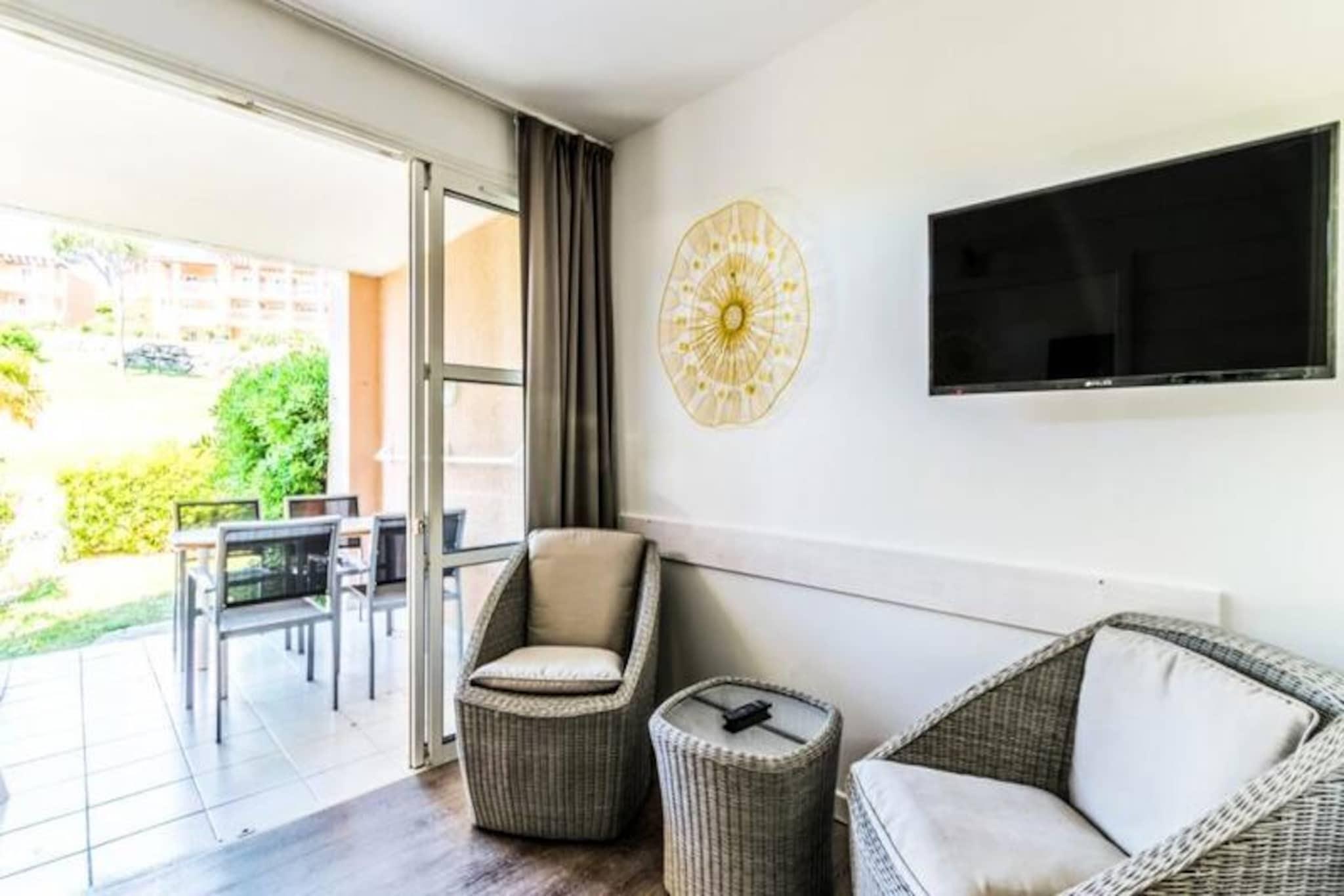 Denne charmerende lejlighed på 28 m² tilbyder et hyggeligt opholdsrum med en sovesofa og et kabineområde med to sammenklappelige køjesenge. Soveværelset har en komfortabel dobbeltseng, og lejligheden er kæledyrsvenlig, hvilket sikrer et indbydende miljø for dine lodne venner. Nyd en privat møbleret terrasse med en have og golfudsigt sammen med moderne bekvemmeligheder såsom et tv, underjordisk parkering og rigelig opbevaringsplads til din bekvemmelighed. Beliggende kun 1 km fra Agay Bay og Dramont Beach, er denne lejlighed perfekt beliggende for strandelskere. Området byder på en række nærliggende attraktioner, herunder lokale caféer, butikker og markeder. Det Lille Tog, der kører fra 08.04 til 30.09, giver nem adgang til stranden, hvilket gør det ideelt for dem, der søger en afslappende strandferie. Boligen omfatter også en børneklub og en teenageklub, med forskellige aktiviteter for at holde unge gæster underholdt. Lejligheden har et veludstyret køkkenområde åbent til stuen, perfekt til at tilberede måltider. Det moderne brusebadeværelse er udstyret med bruseniche og separat toilet. Yderligere faciliteter inkluderer en møbleret terrasse med bord og stole, en liggestol og en valgfri slutrengøring, hvilket giver ekstra komfort og fleksibilitet under dit ophold.