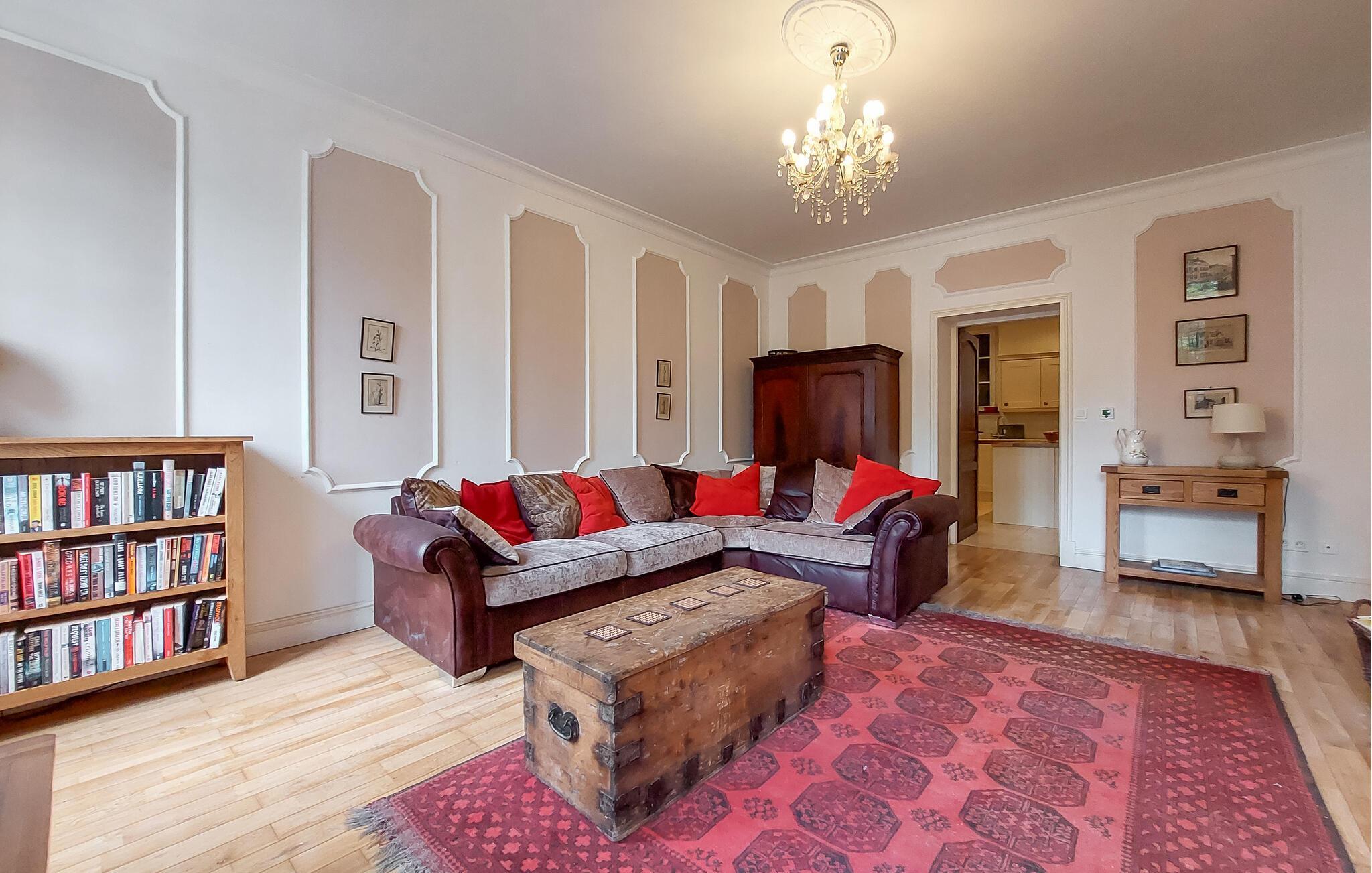 Træd ind i det store interiør og slap af i den elegante stue med pejs, komfortable sofaer og stemningsfuld belysning. Højt til loftet og dekorative elementer understreger husets særlige karakter. Brug bogkrogen eller tilbring aftenerne sammen med at se tv. Lav mad i det store køkken med køkkenø og rigelig bordplads. Den tilstødende spiseplads tilbyder rigelig plads til fælles måltider.