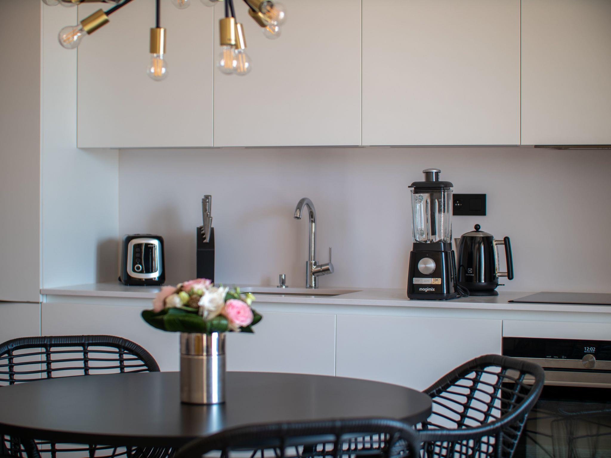 The flat benefits from full air conditioning, ensuring a cool and comfortable environment on hot summer days. For those who prefer to prepare their own meals, convenience is provided by a kitchen equipped with induction hob, coffee maker, dishwasher and electric kettle. What's more, a bathroom combining shower and bath offers flexibility and relaxation to suit every visitor.