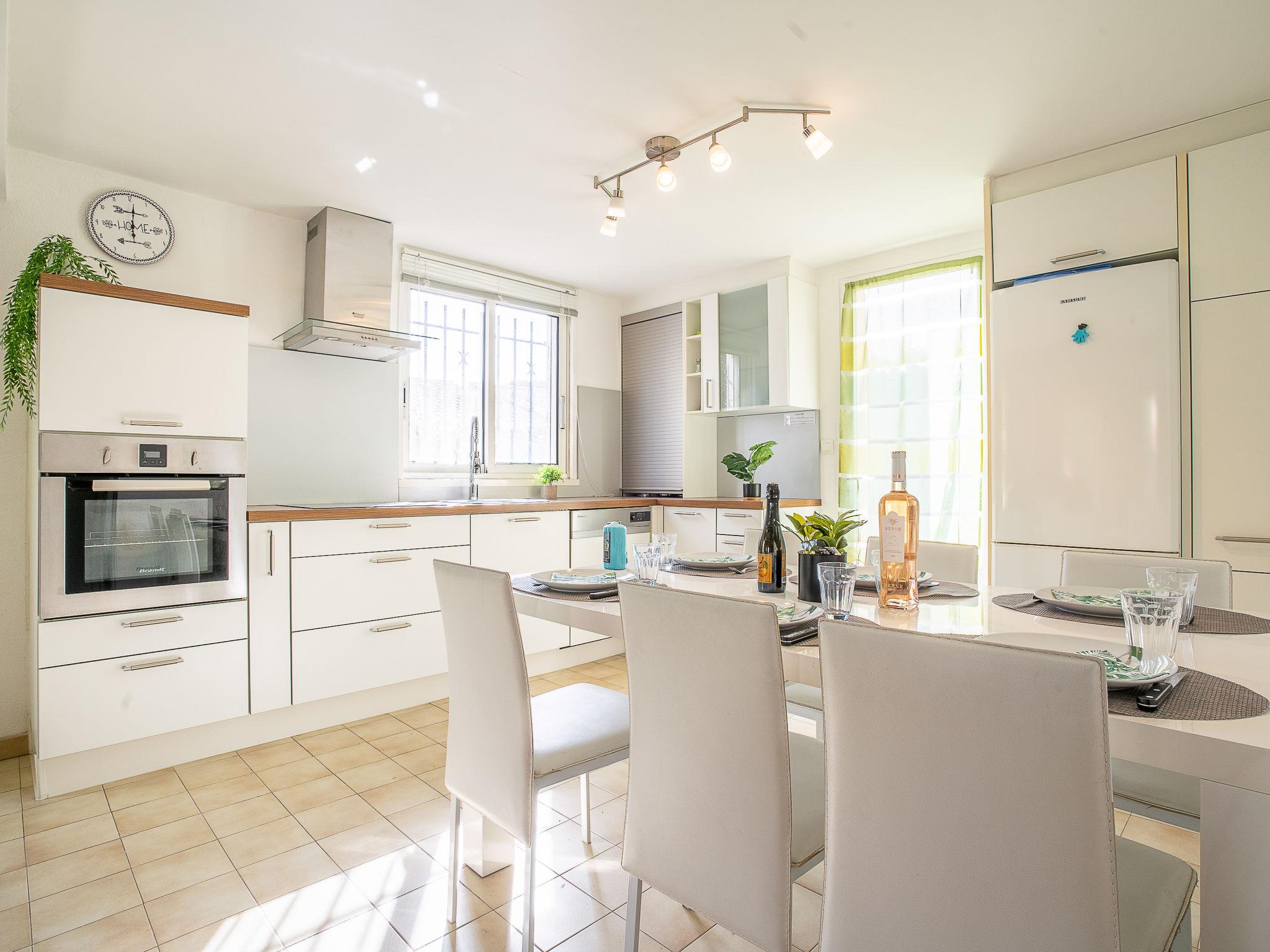 4-room house 110 m2 on 2 levels. Practical and beautiful furnishings: living/dining room with TV (flat screen). Exit to the terrace. 1 room with 1 french bed (140 cm, length 190 cm), bath/WC and fan. Open kitchen (oven, dishwasher, 4 ceramic glass hob hotplates, microwave, electric coffee machine) with dining table. Exit to the garden. Sep. WC. Upper floor: 1 room with 2 beds (90 cm, length 190 cm), fan. 1 room with 2 beds (90 cm, length 190 cm), fan. Shower/WC. Small terrace 15 m2, large garden. Terrace furniture. Facilities: washing machine, iron. Internet (WiFi, extra). Parking at the house. Please note: non-smoking house. 1 small pet/ dog allowed. Smoke alarm. As part of the water restriction measures linked to drought in some of our departments, please note that the rental swimming pool may be closed by prefectural decree.