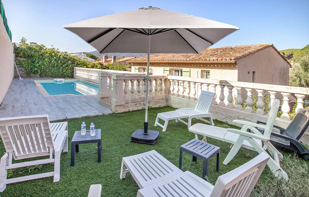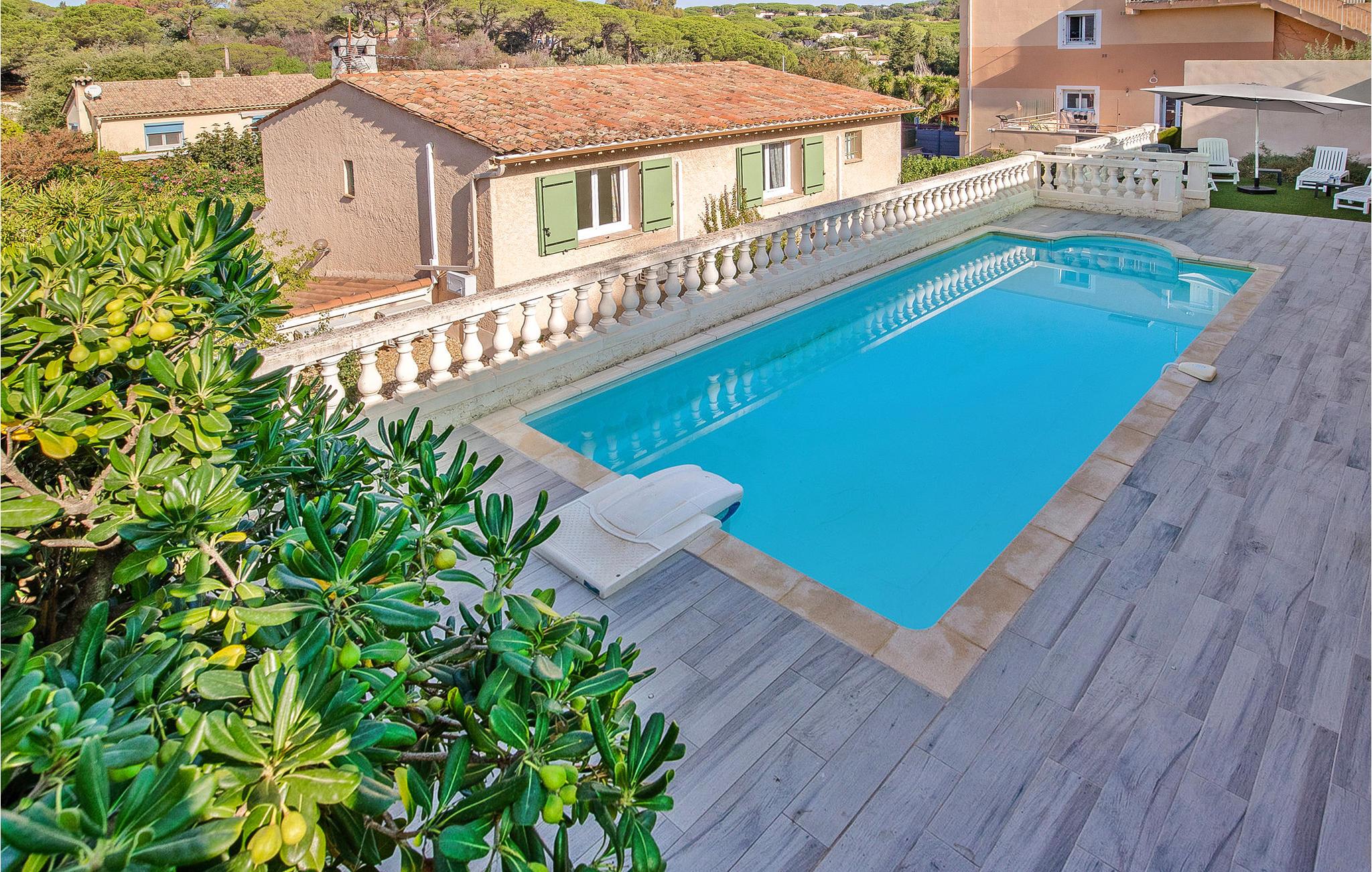 Dette skønne feriehus i Provences varme farver har egen swimmingpool og ligger i et boligområde i Sainte-Maxime, kun en km fra de nærmeste strande ved Middelhavet. Husets store rum, samt den lyse og moderne indretning er også udstyret med klimaanlæg som især er dejlig når sommerens varme for alvor lægger sig. I huset er der god plads til ti feriegæster, der kan se frem til en stor have og en 20 m² stor overdækket terrasse hvor I kan hygge jer mens maden bliver færdig på grillen. Der er 17 km til Saint-Tropez som er legeplads for jetsettere fra hele verden med en charmerende lille havn og den berømte strand Pampelonne. Besøg byens citadel med museum for søfarts- og lokalhistorie og gå en tur på Cap Camarat. Gå heller ikke glip af museet Musée de la Tour Carrée eller hjemstavnsmusset i Sainte-Maxime. Her er noget at se og opleve og aktivitetsmuligheder for alle: golf, ridning, tennis eller udflugter til fods eller på mountain-bike. Tag ungerne med en tur i badelandet Aqualand, som absolut ikke kun er for børn. Husets terrasse ligger lidt forskudt og der er adgang til poolen via nogle trin.