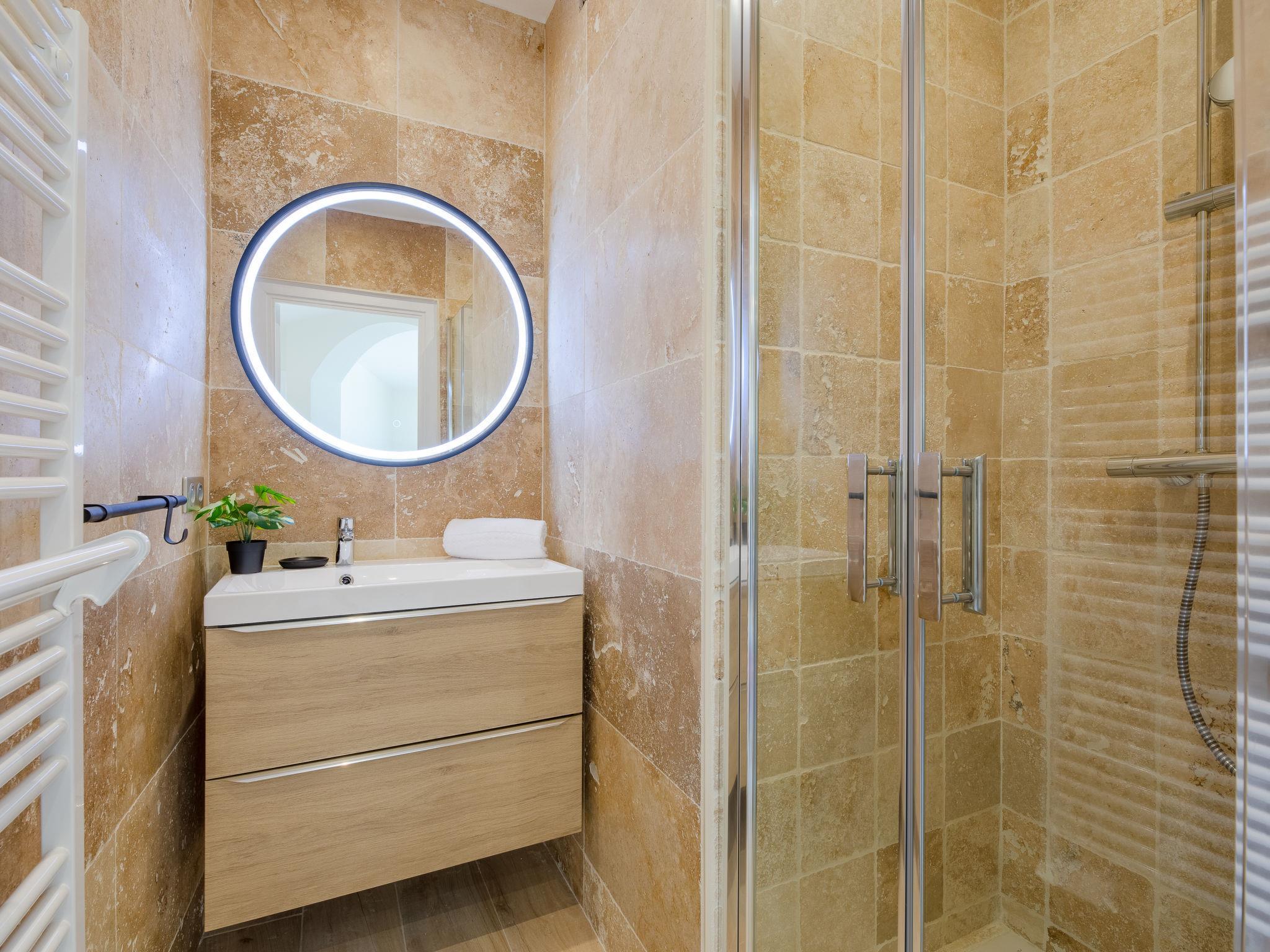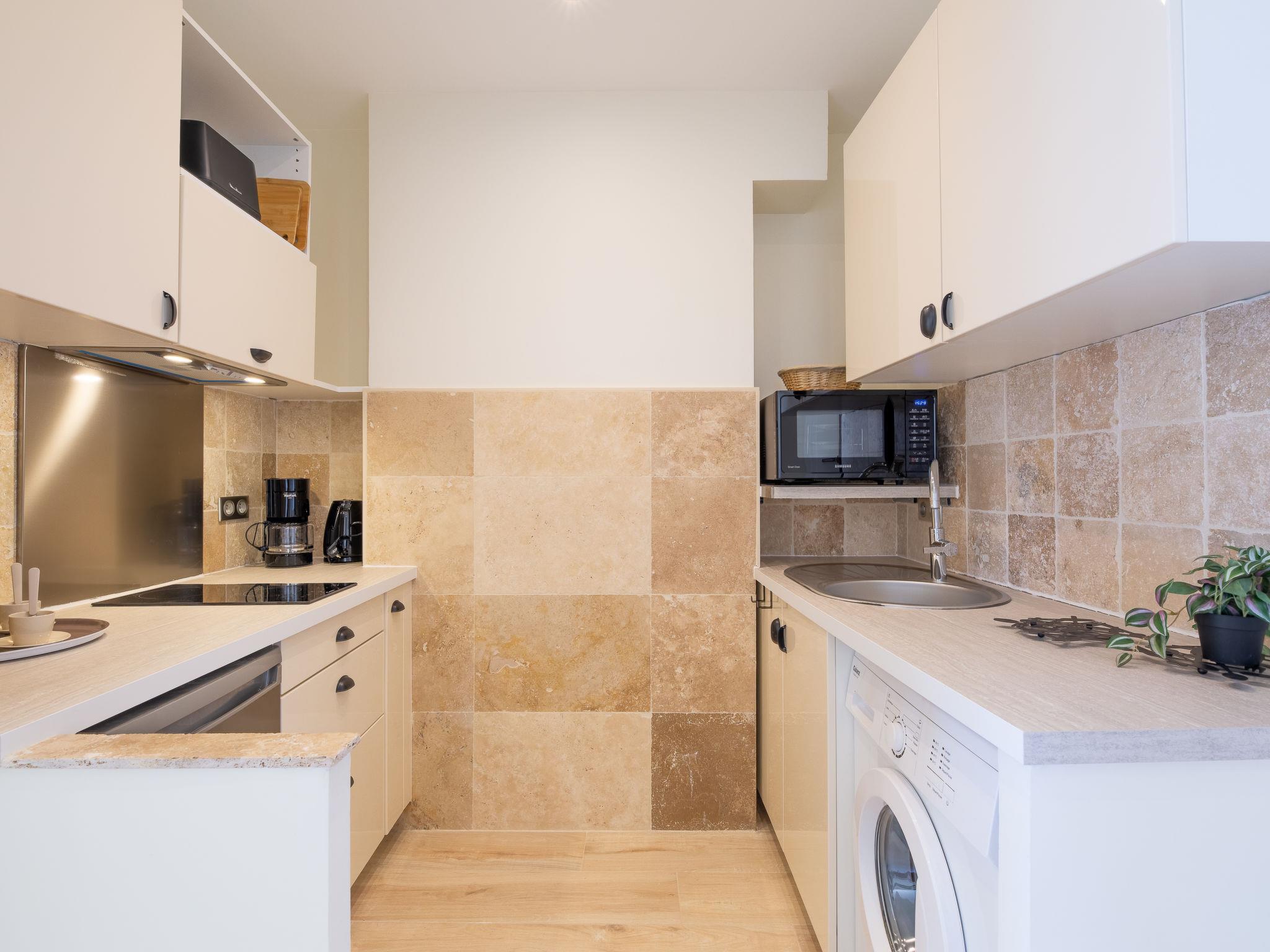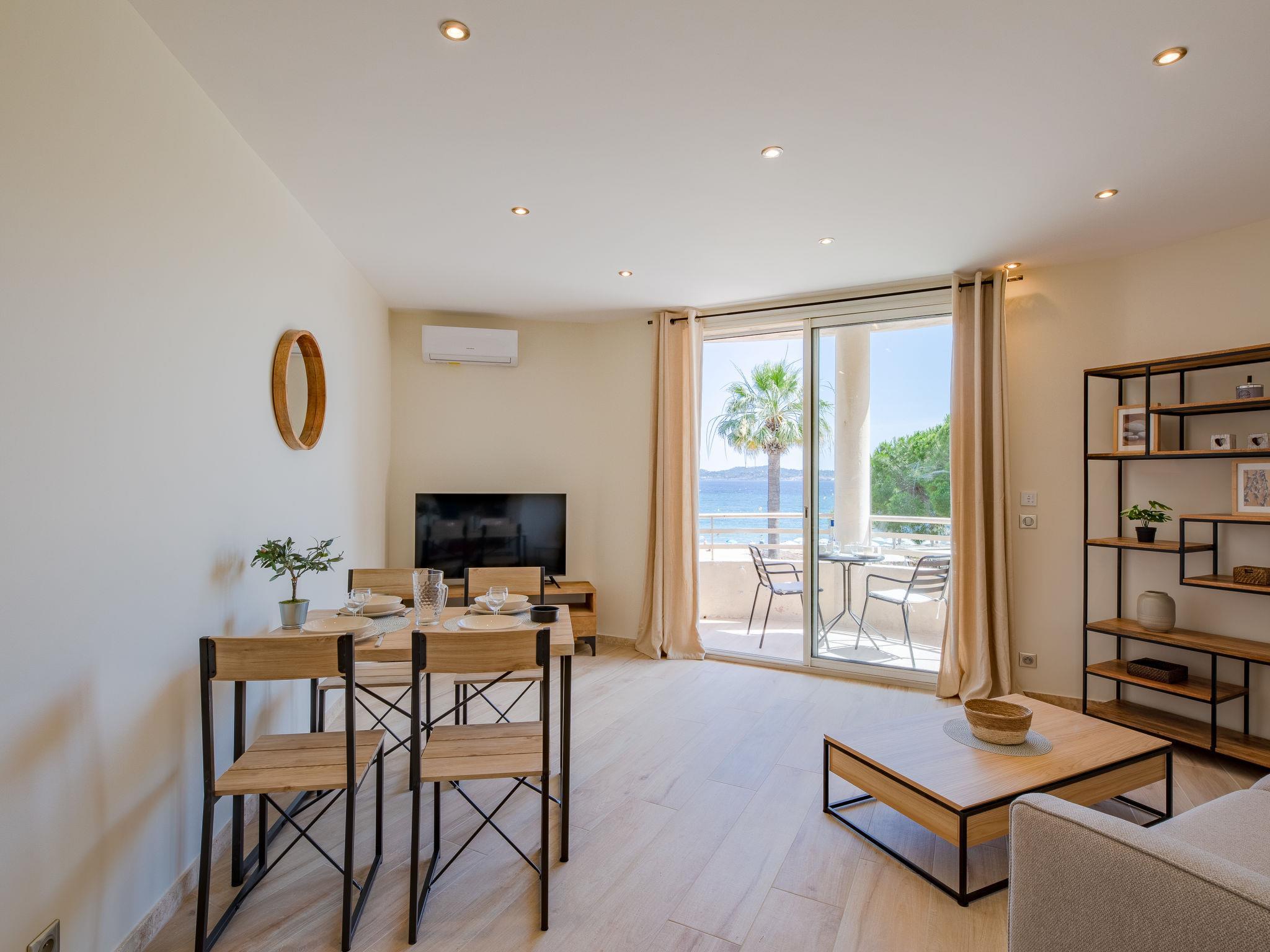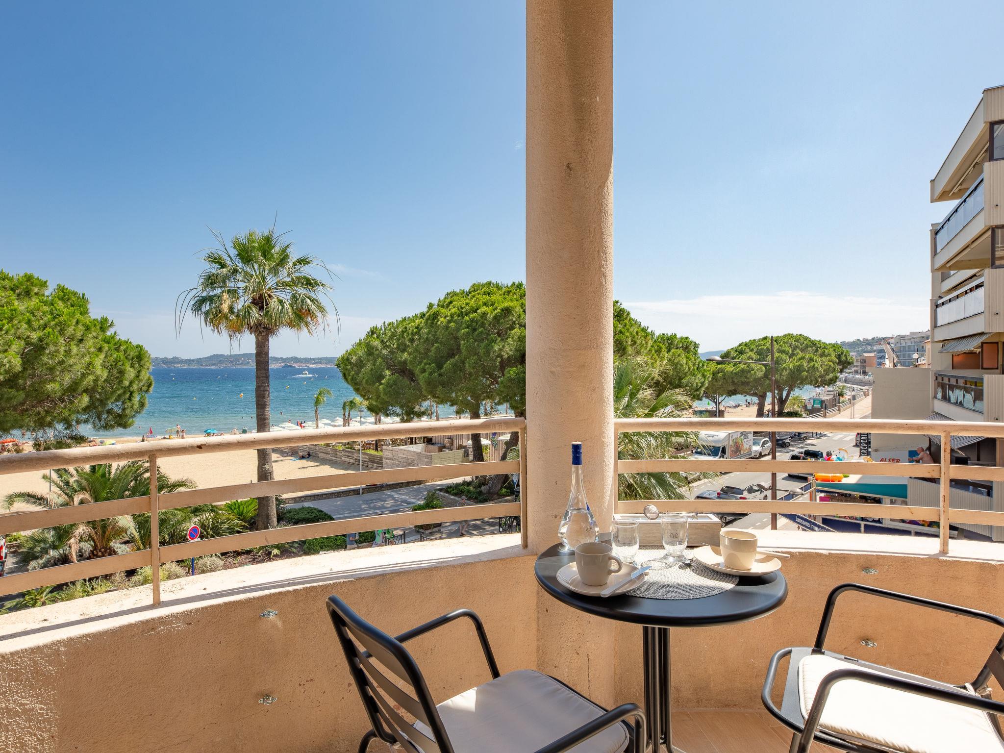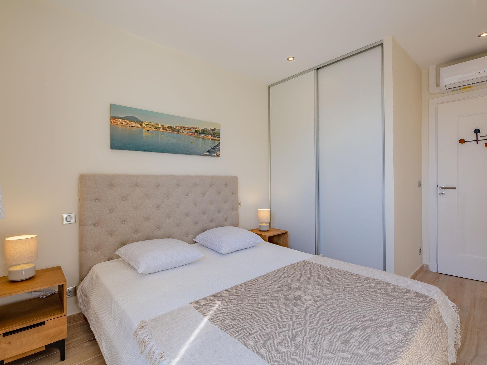 2-room apartment 46 m2 on 2nd floor, south-west facing position. Bright, fully renovated in 2023, beautiful furnishings: entrance hall. Living/dining room with 1 double sofabed (1 x 160 cm, length 195 cm), TV (flat screen), air conditioning. Exit to the balcony. 1 room with 1 french bed (1 x 160 cm, length 200 cm), air conditioning. Open kitchen (2 ceramic glass hob hotplates, toaster, kettle, electric coffee machine, combination microwave). Shower, sep. WC. Air-conditioning. Small balcony 5 m2, south facing position and west facing position. Balcony furniture. Very beautiful view of the sea. Facilities: washing machine. Internet (WiFi, free). Please note: non-smokers only, no parking. Smoke alarm, no lift. Offer by a commercial proprietor according to Art. 155, IV, CGI 83115004874HT