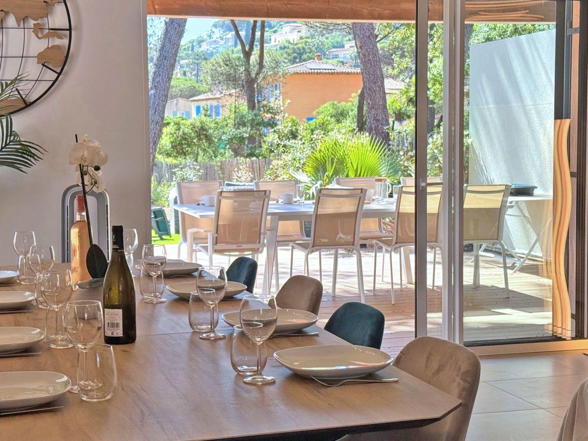 - Beautiful air-conditioned living room with access to the garden and swimming pool, lounge with sofa bed (160) and armchair for all guests, large TV screen and dining area with extendable table.