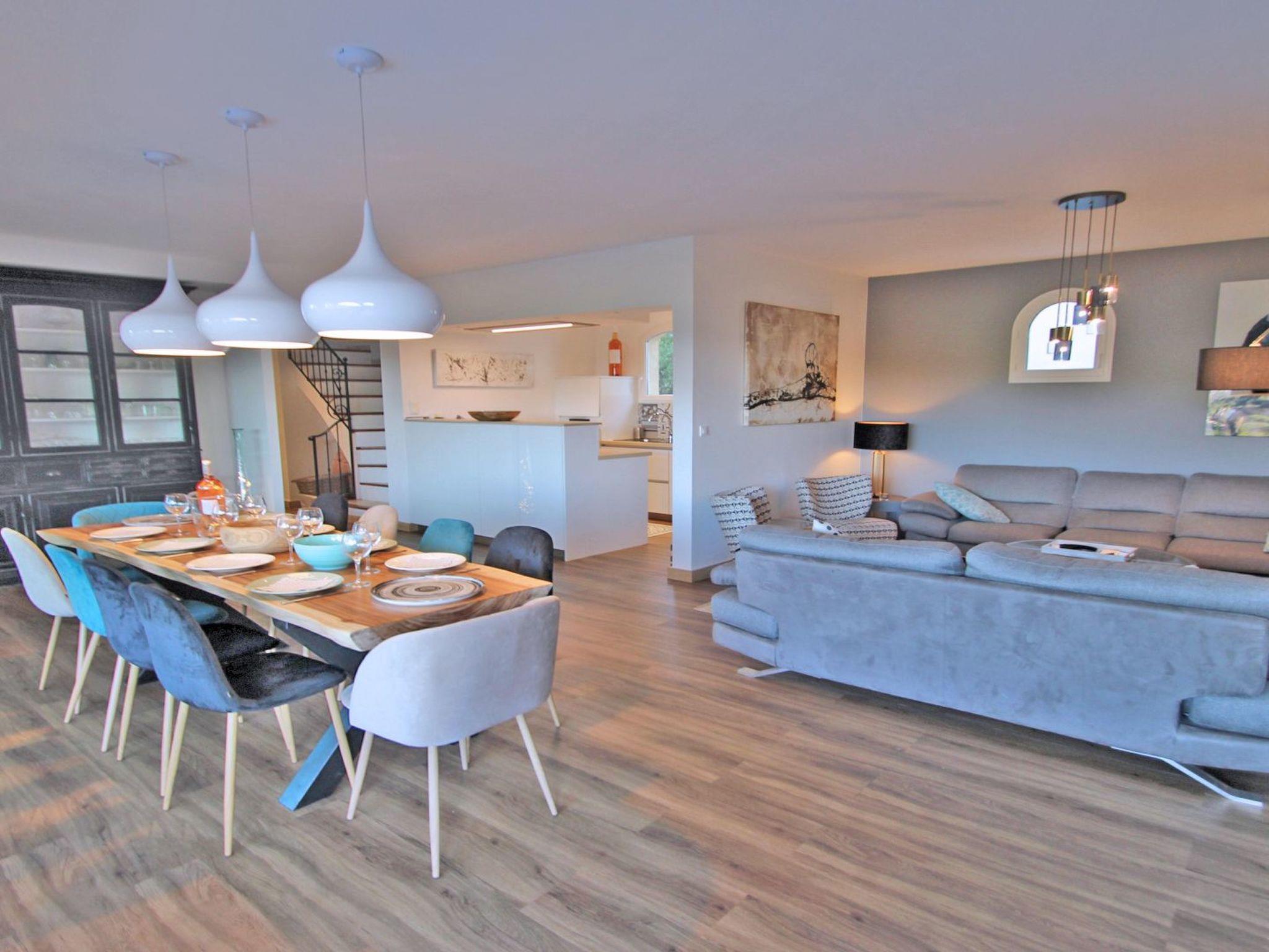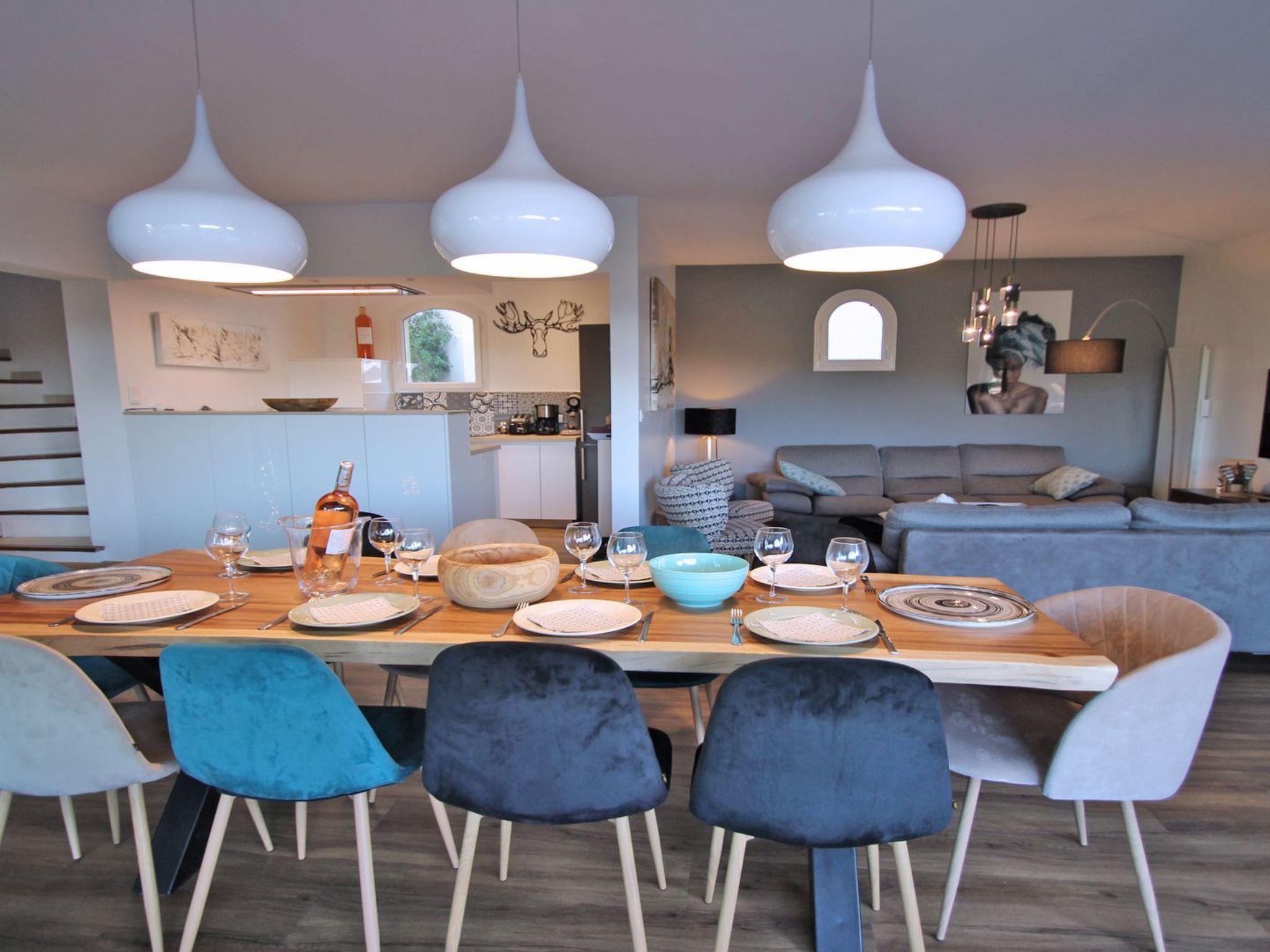 - Beautiful living room with access to the outside, divided into 3 areas, lounge with 2 sofas that can accommodate all guests, large screen TV and bluetooth speaker, dining area for 8 people and the American kitchen very well equipped (fridge, freezer, hob, extractor fan, dishwasher, oven, microwave, various dishes).