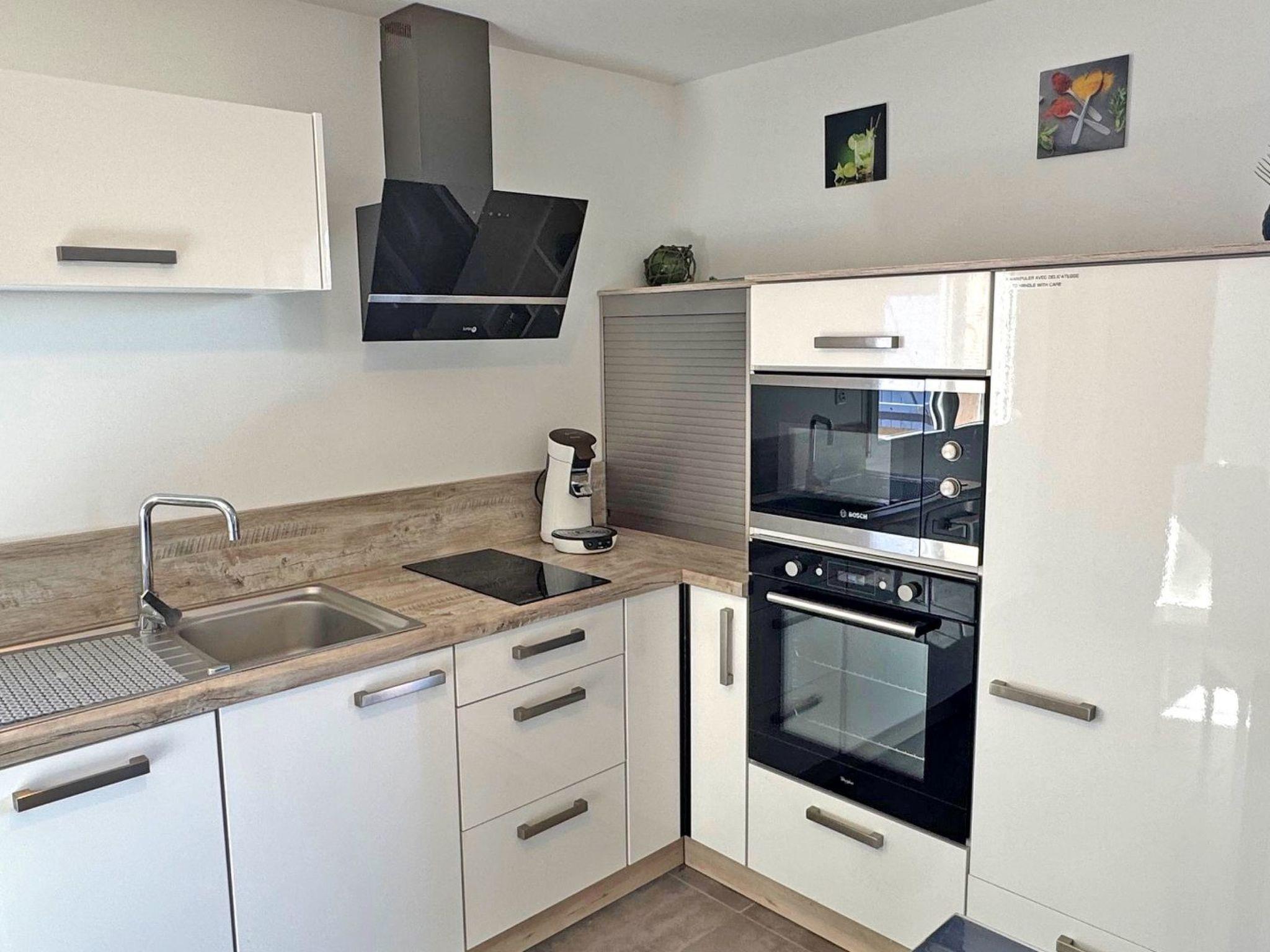 - Air-conditioned living room with rapido sofa bed (140 cm), table and chairs, TV unit with flat-screen TV, fully-equipped open-plan kitchen (fridge, freezer, 2-ring induction hob, dishwasher, oven, microwave, crockery and cutlery),