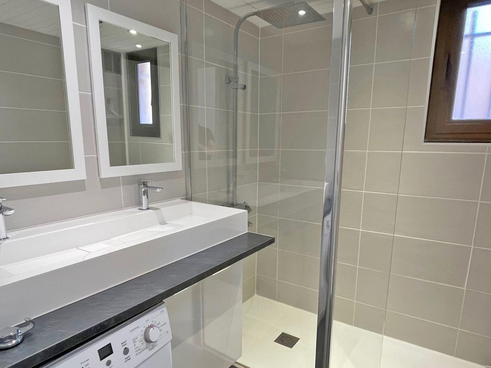 - Bathroom with shower, vanity unit and washing machine
