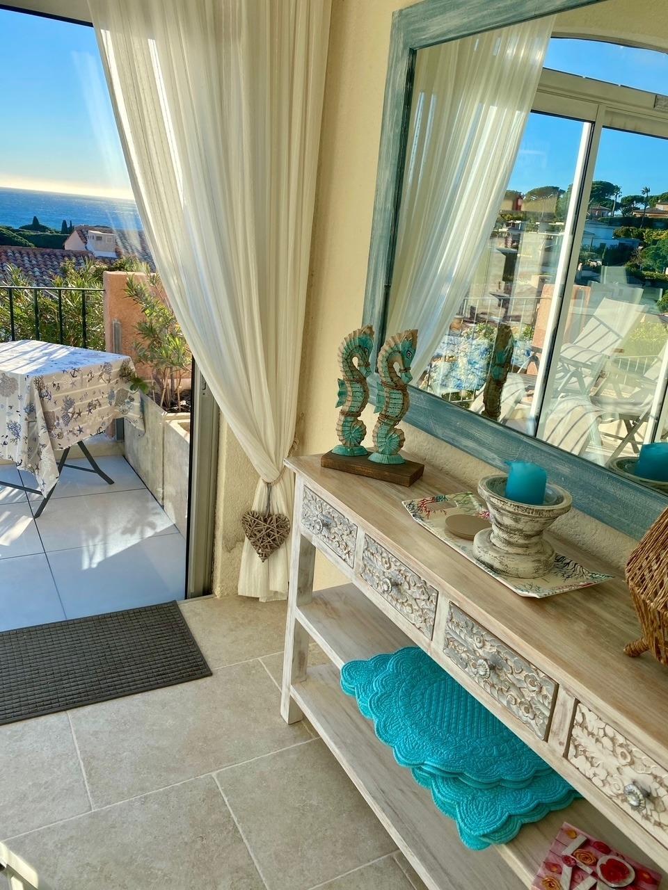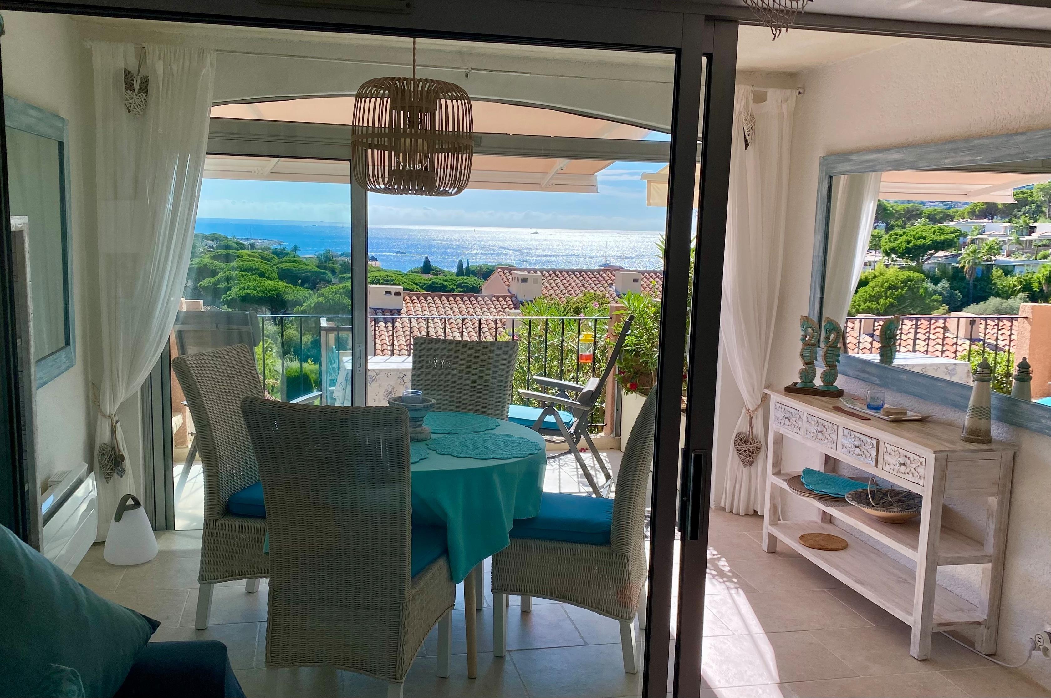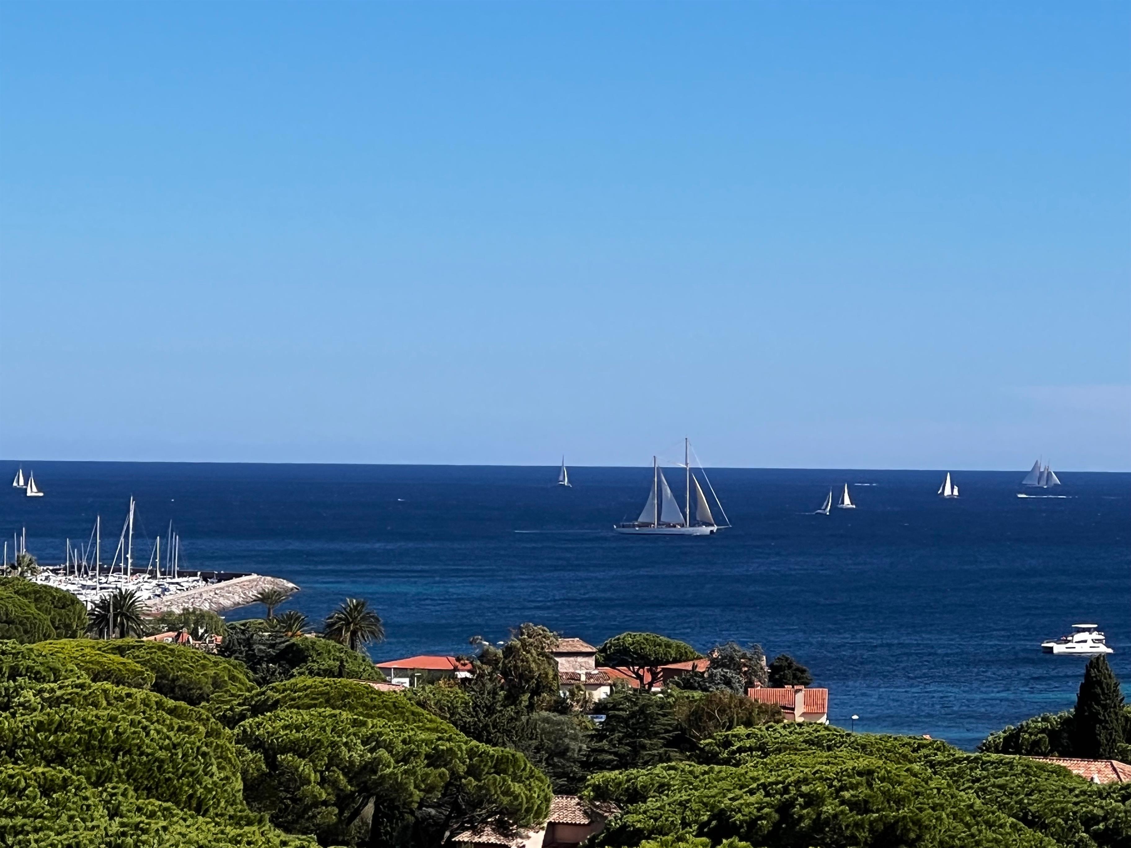 Klimatisierte Wohnung mit grossem Meerblick auf den Golf von Saint-Tropez im geschlossene Domaine de la croisette mit Schwimmbad ca. 400m vom Strand.