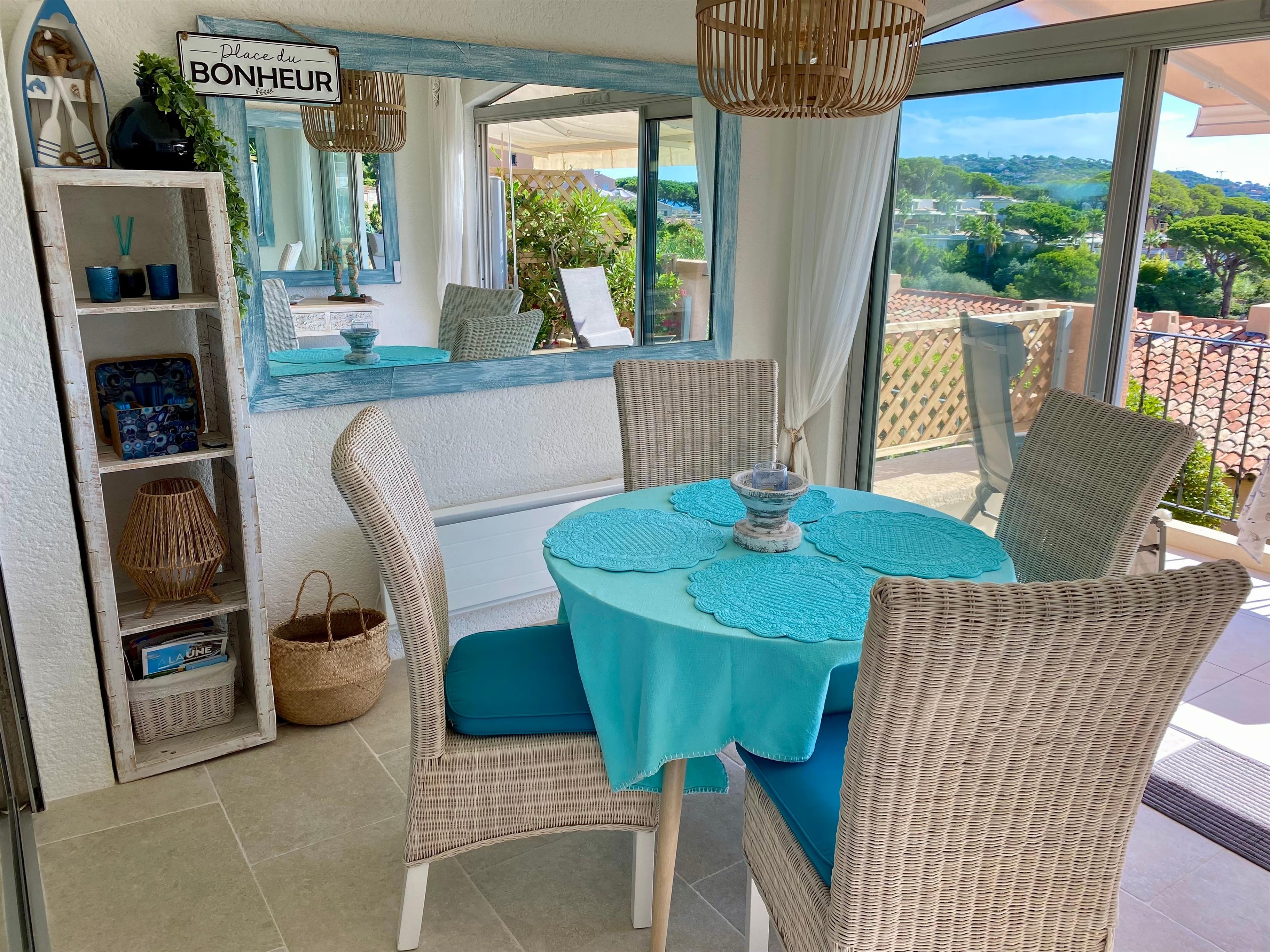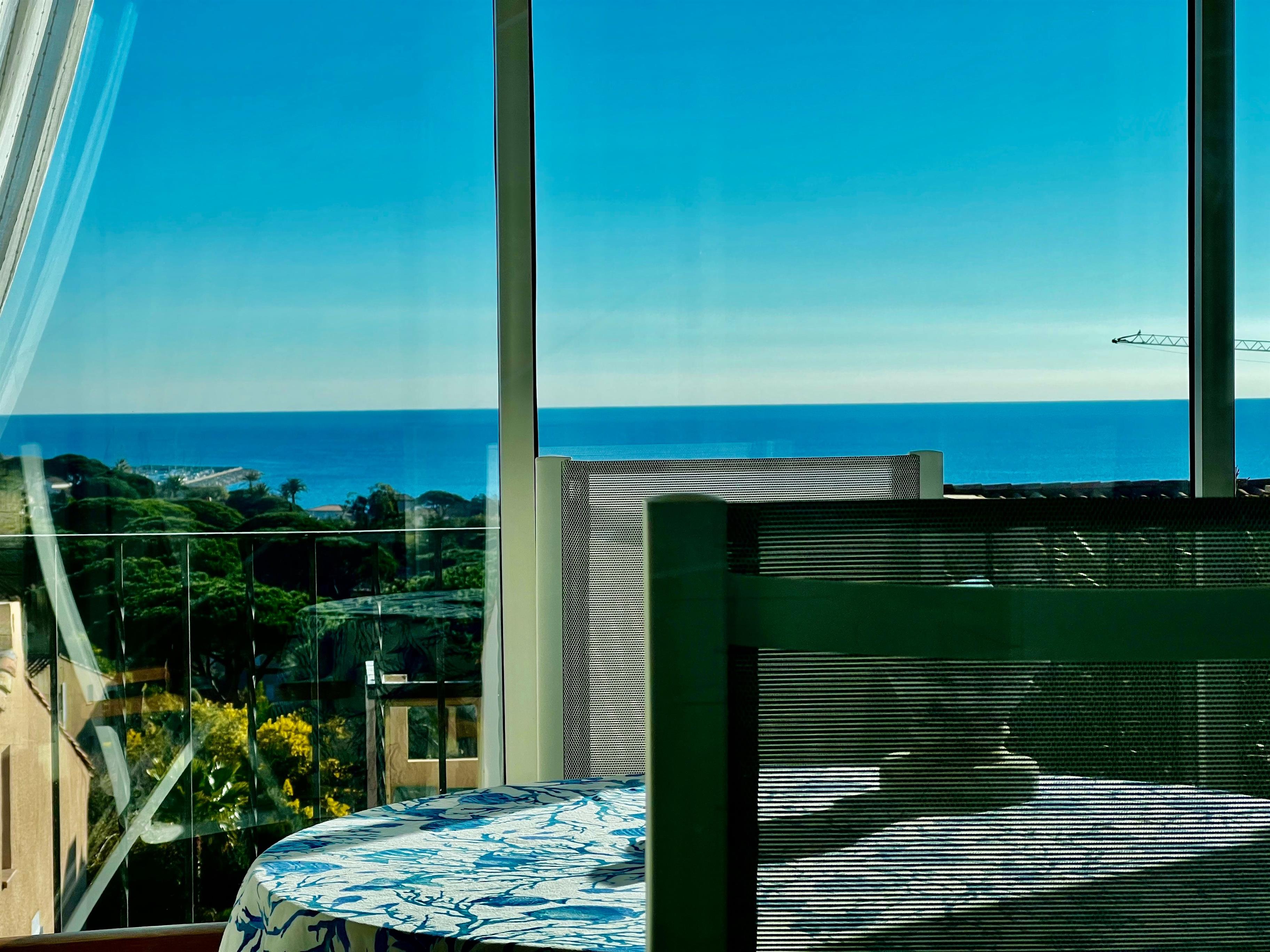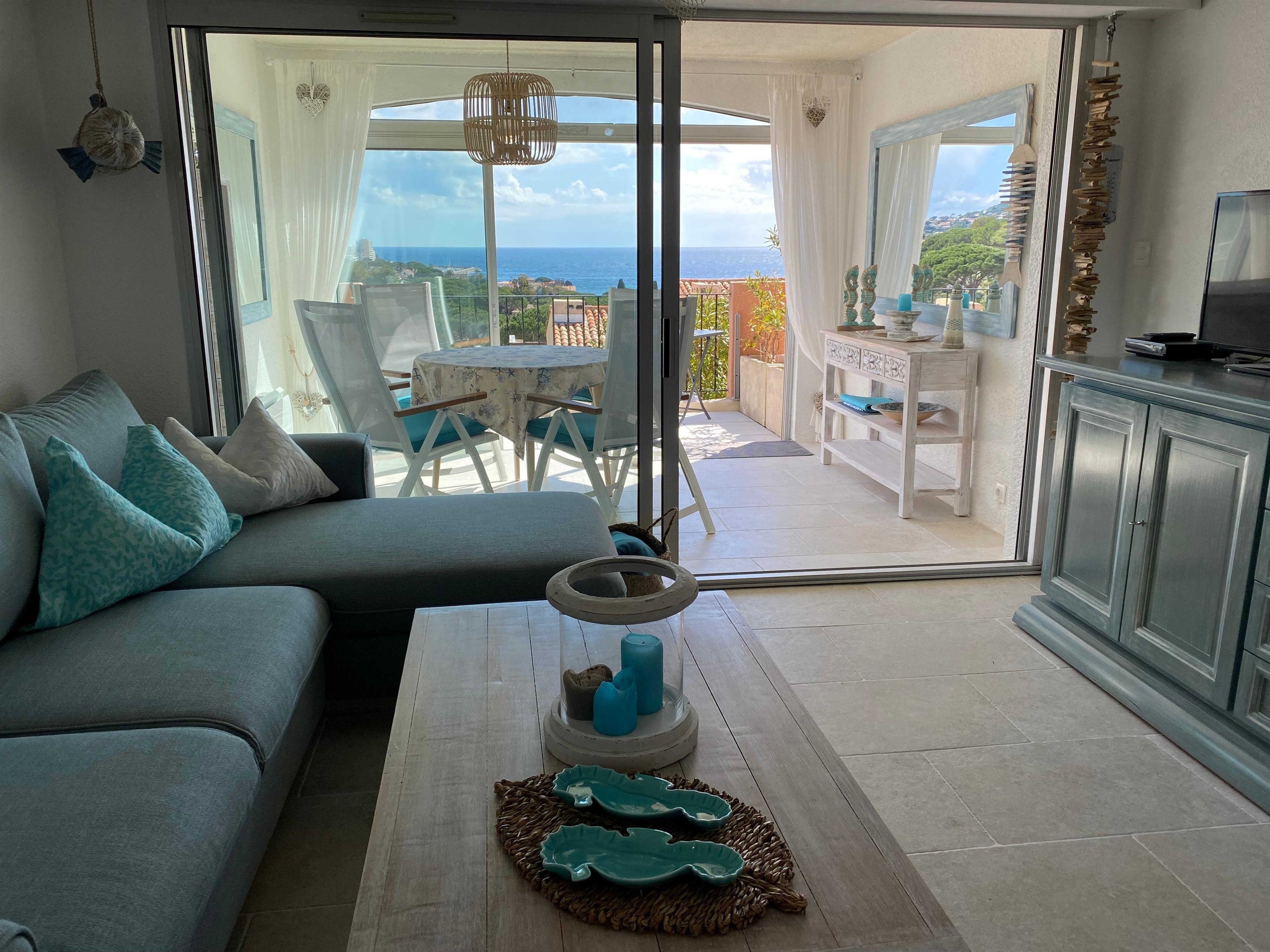 Klimatisierte Wohnung mit grossem Meerblick auf den Golf von Saint-Tropez im geschlossene Domaine de la croisette mit Schwimmbad ca. 400m vom Strand.