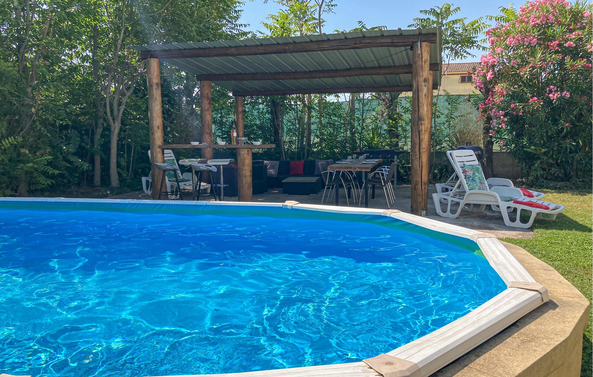 Nyd solen på den hyggelige terrasse og køl efterfølgende af i den opstillede pool. Om aftenen kan I tilberede lækre måltider på grillen. Huset er lyst indrettet med komfortable og velholdte møbler.