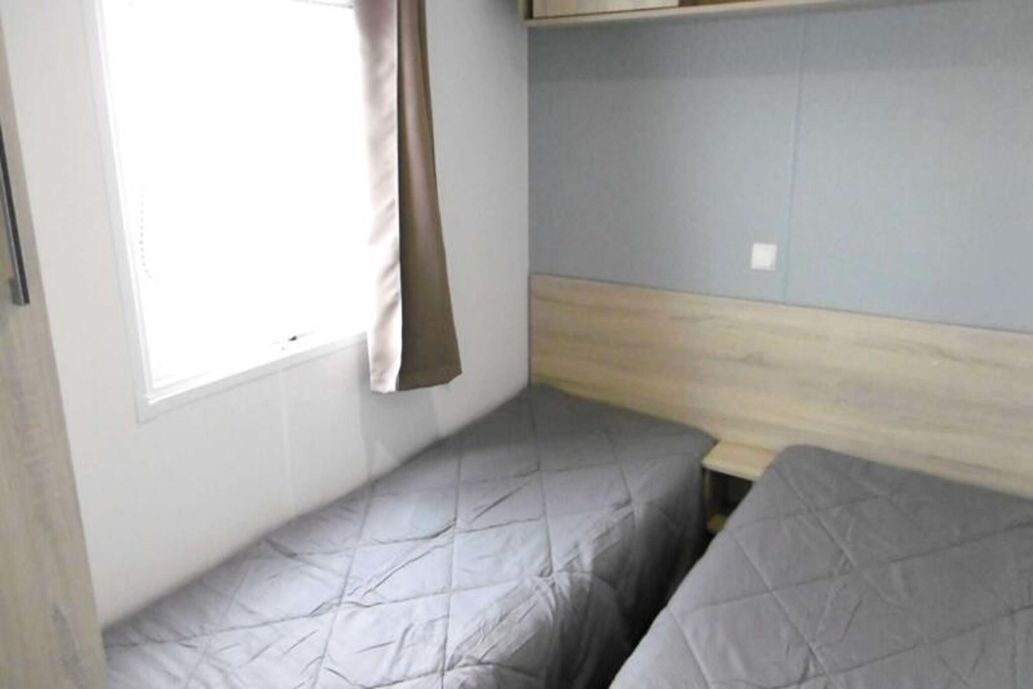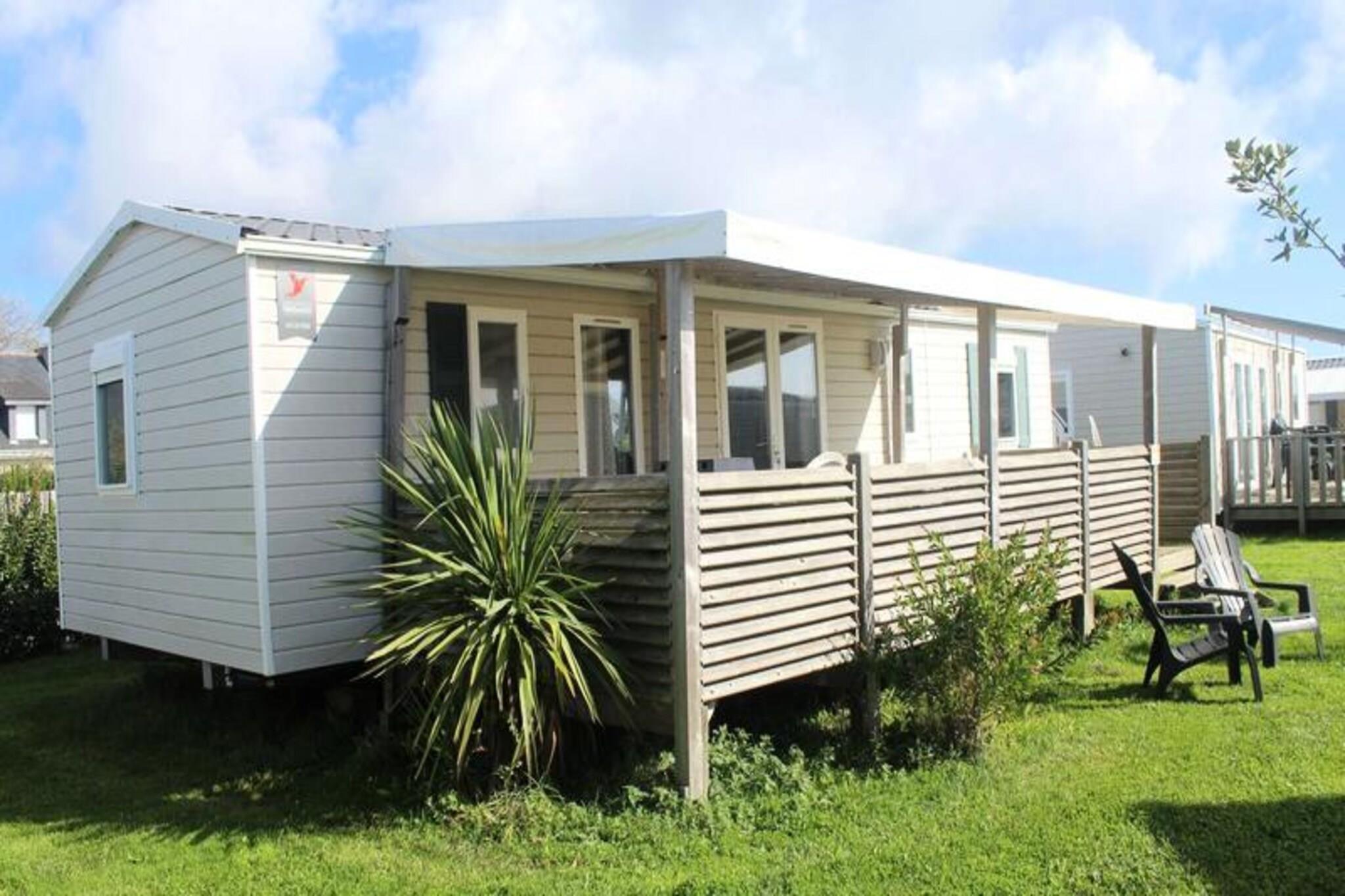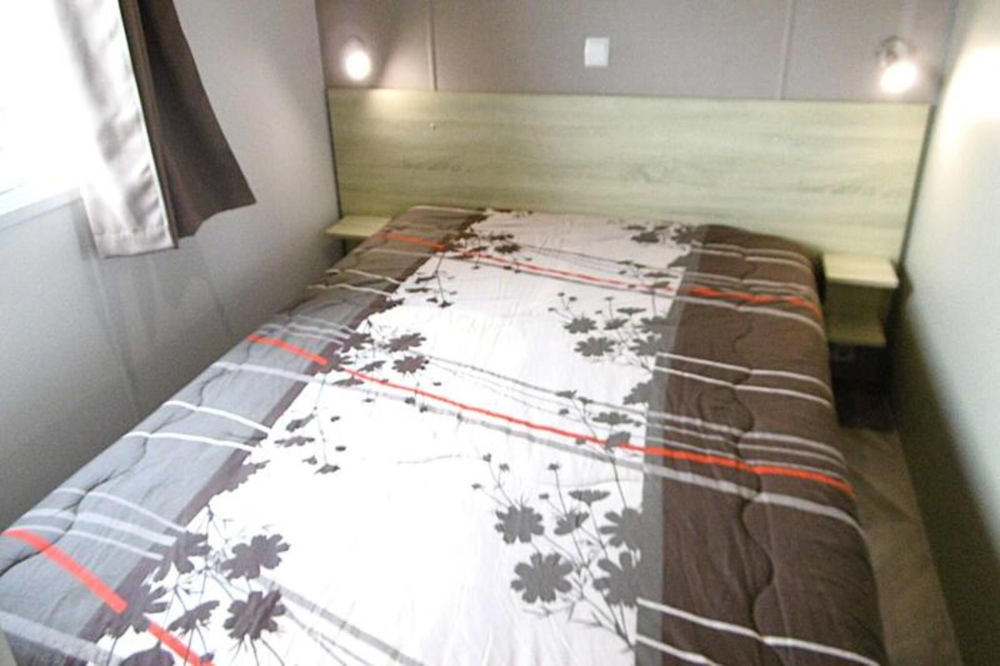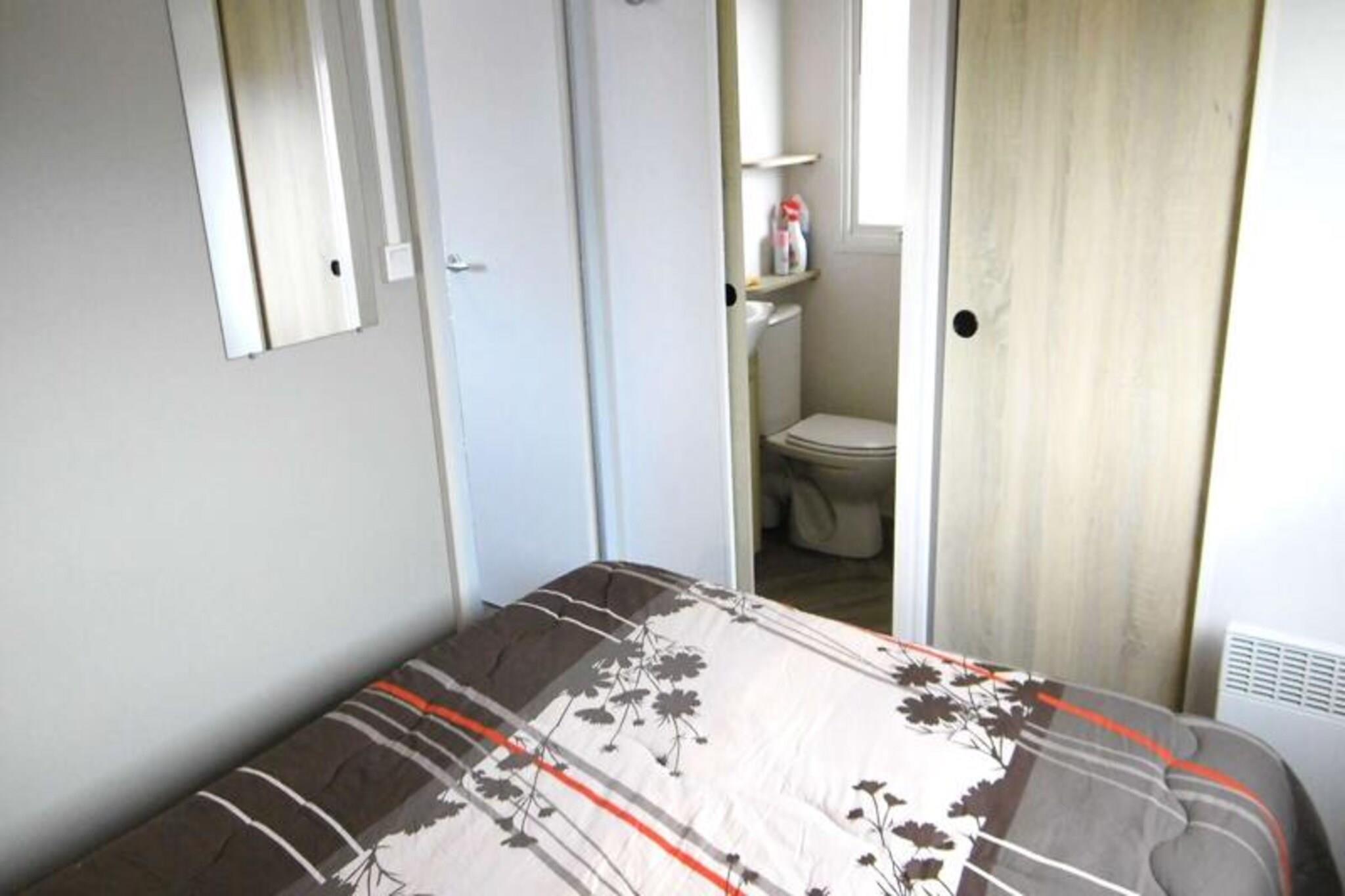På Atlanterhavets fredfyldte bredder tilbyder dette charmerende 40 m² store mobilhome Trigano Intuition 40 en dejlig flugt i hjertet af St Jacques. Beliggende på en gågadecampingplads med direkte adgang til havet, inviterer denne ejendom dig til at slappe af midt i Bretagnes naturlige skønhed. Uanset om du søger rolige morgener ved havet eller sjove eftermiddage i campingpladsens vandland, lover denne destination en mindeværdig ferie. Indenfor er mobilhomet omhyggeligt designet til at rumme op til seks gæster. Den hyggelige stue med en komfortabel sofa fører til et fuldt udstyret tekøkken, perfekt til at tilberede frisk lokal fisk og skaldyr. Soveværelset har en dobbeltseng og et ensuite badeværelse, mens to ekstra soveværelser hver har to enkeltsenge. Et andet badeværelse og separat toilet sikrer bekvemmelighed for familier eller grupper. Moderne bekvemmeligheder såsom køleskab, mikrobølgeovn og kaffemaskine giver alle hjemmets bekvemmeligheder. Gå udenfor på den rummelige 18,5 m² store terrasse, hvor 15 m² er overdækket til nydelse året rundt. Slap af med en god bog på havemøblerne eller nyd et lækkert måltid tilberedt på gasgrillen. Selve campingpladsen kan prale af en opvarmet pool med rutsjebane, en spa med jacuzzi og sauna samt en række aktiviteter, herunder yoga, fitnesshold og børne- og teenageklubber i sommermånederne. Med sin idylliske beliggenhed, direkte adgang til stranden og et væld af faciliteter på stedet er dette mobilehome det perfekte valg for dem, der søger en blanding af afslapning og eventyr. Fra at udforske den barske kystlinje til at nyde den pulserende campingpladsatmosfære venter din bretonske flugt.