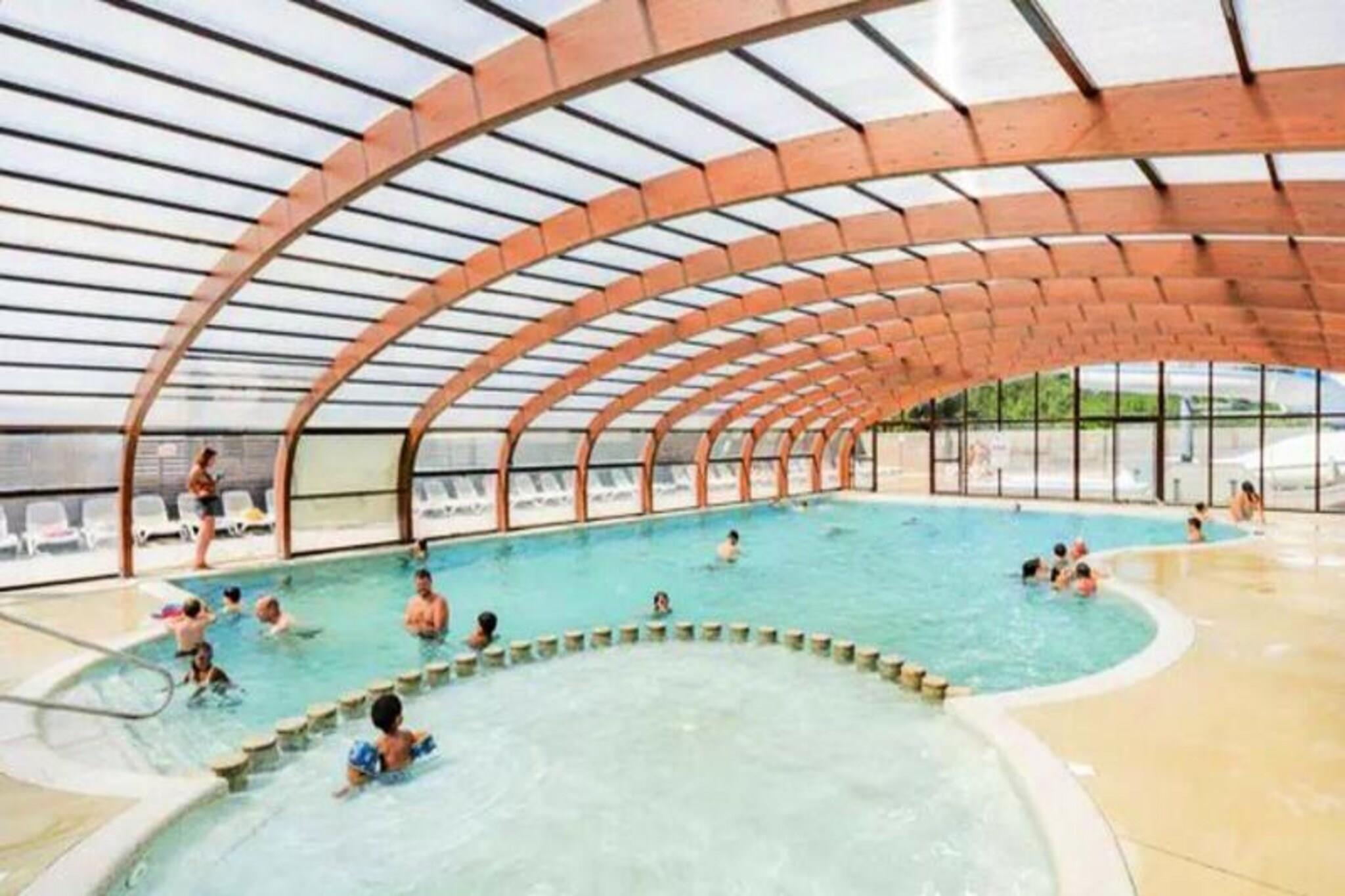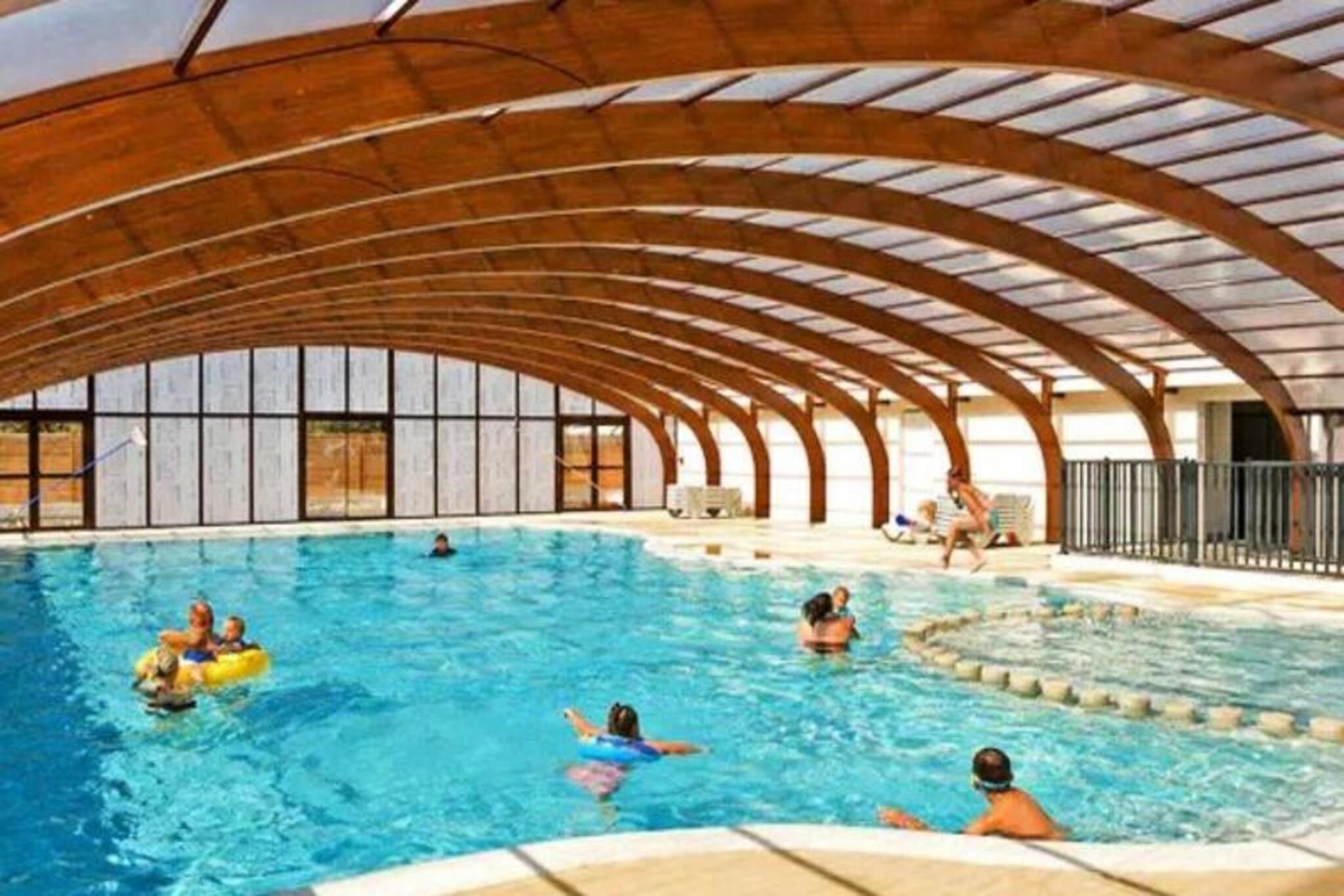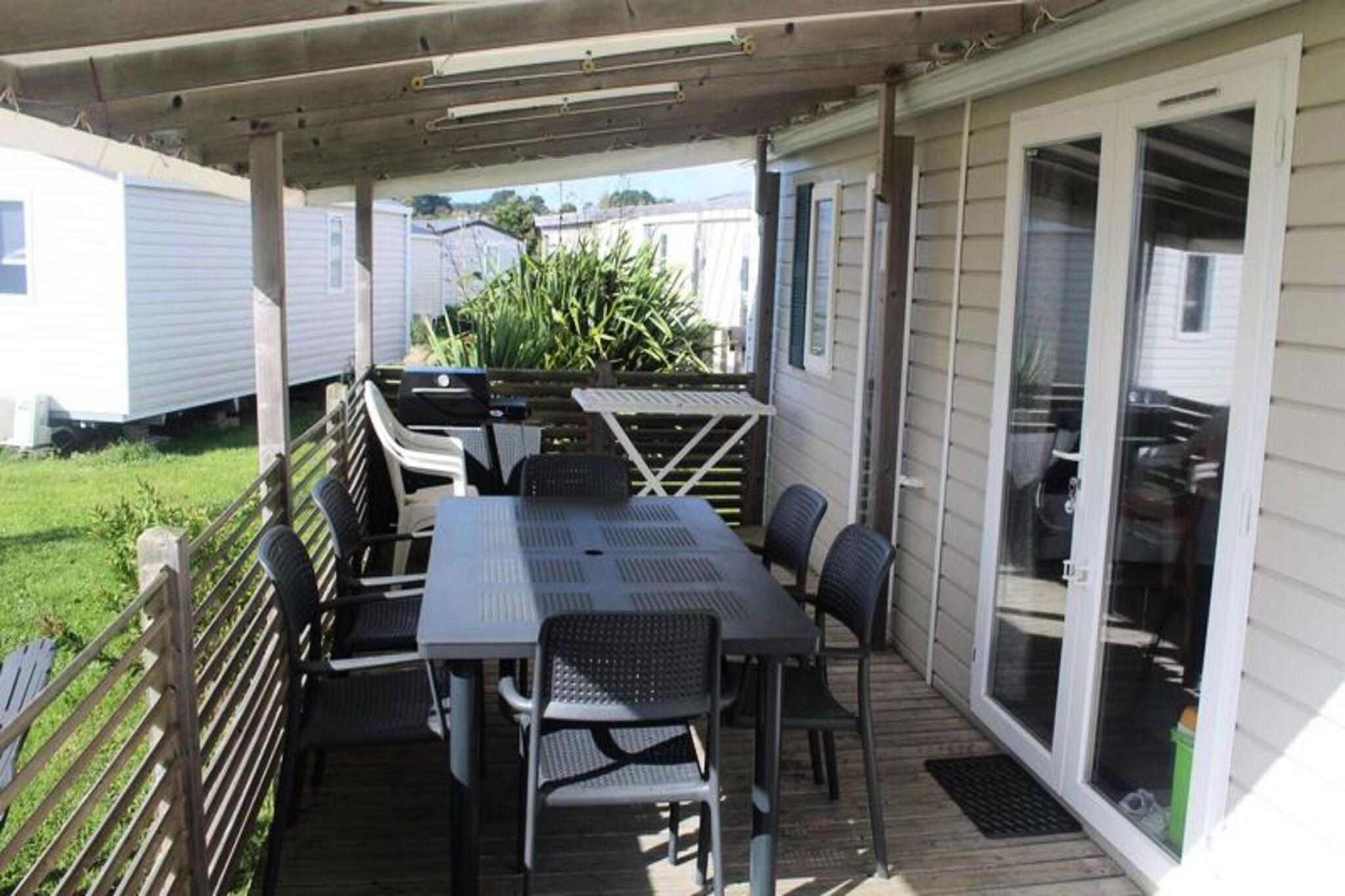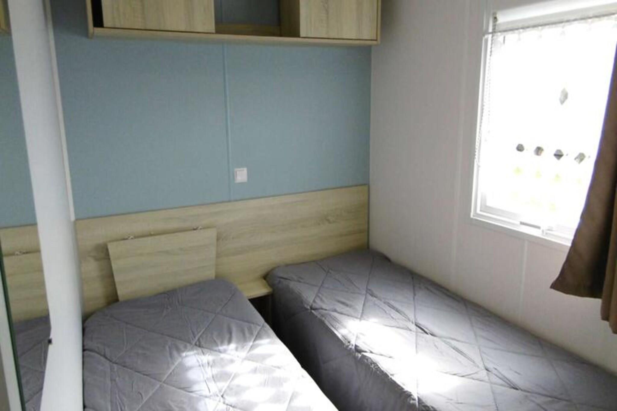 På Atlanterhavets fredfyldte bredder tilbyder dette charmerende 40 m² store mobilhome Trigano Intuition 40 en dejlig flugt i hjertet af St Jacques. Beliggende på en gågadecampingplads med direkte adgang til havet, inviterer denne ejendom dig til at slappe af midt i Bretagnes naturlige skønhed. Uanset om du søger rolige morgener ved havet eller sjove eftermiddage i campingpladsens vandland, lover denne destination en mindeværdig ferie. Indenfor er mobilhomet omhyggeligt designet til at rumme op til seks gæster. Den hyggelige stue med en komfortabel sofa fører til et fuldt udstyret tekøkken, perfekt til at tilberede frisk lokal fisk og skaldyr. Soveværelset har en dobbeltseng og et ensuite badeværelse, mens to ekstra soveværelser hver har to enkeltsenge. Et andet badeværelse og separat toilet sikrer bekvemmelighed for familier eller grupper. Moderne bekvemmeligheder såsom køleskab, mikrobølgeovn og kaffemaskine giver alle hjemmets bekvemmeligheder. Gå udenfor på den rummelige 18,5 m² store terrasse, hvor 15 m² er overdækket til nydelse året rundt. Slap af med en god bog på havemøblerne eller nyd et lækkert måltid tilberedt på gasgrillen. Selve campingpladsen kan prale af en opvarmet pool med rutsjebane, en spa med jacuzzi og sauna samt en række aktiviteter, herunder yoga, fitnesshold og børne- og teenageklubber i sommermånederne. Med sin idylliske beliggenhed, direkte adgang til stranden og et væld af faciliteter på stedet er dette mobilehome det perfekte valg for dem, der søger en blanding af afslapning og eventyr. Fra at udforske den barske kystlinje til at nyde den pulserende campingpladsatmosfære venter din bretonske flugt.