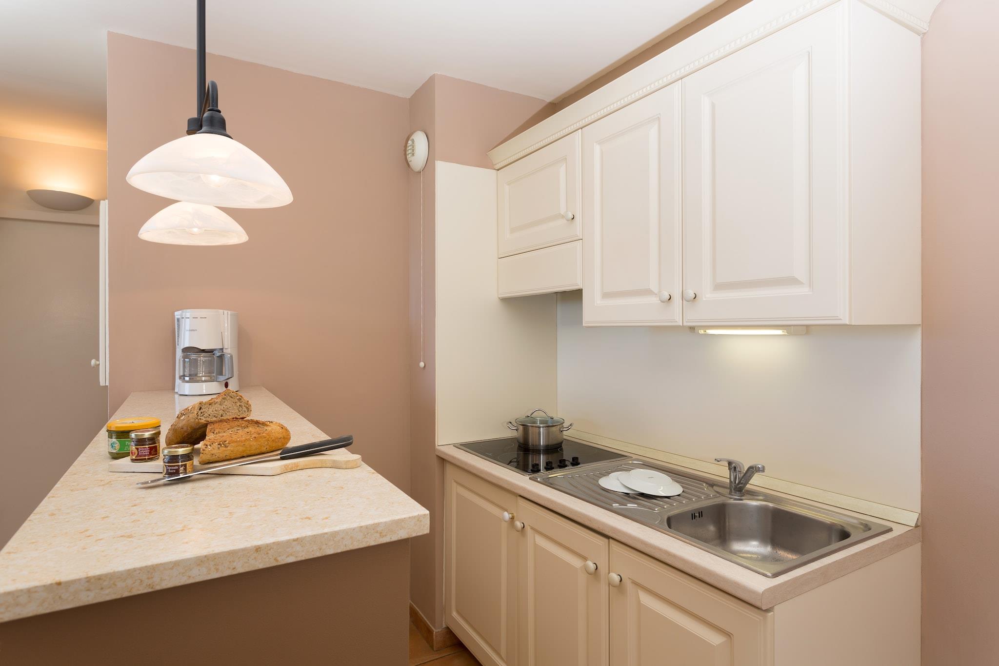 Stue(dobbeltsovesofa), åbent køkken(komfur(glaskeramisk), combi-mikroovn, opvaskemaskine , køleskab), soveværelse(2x enkeltseng), soveværelse(dobbeltfeltseng), badeværelse(badekar eller bruser, håndvask, toilet), tørretumbler(deles med andre gæster, betalt), vaskemaskine(deles med andre gæster, betalt), varme(elektrisk), terrasse, havemøbler, swimmingpool(deles med andre gæster)