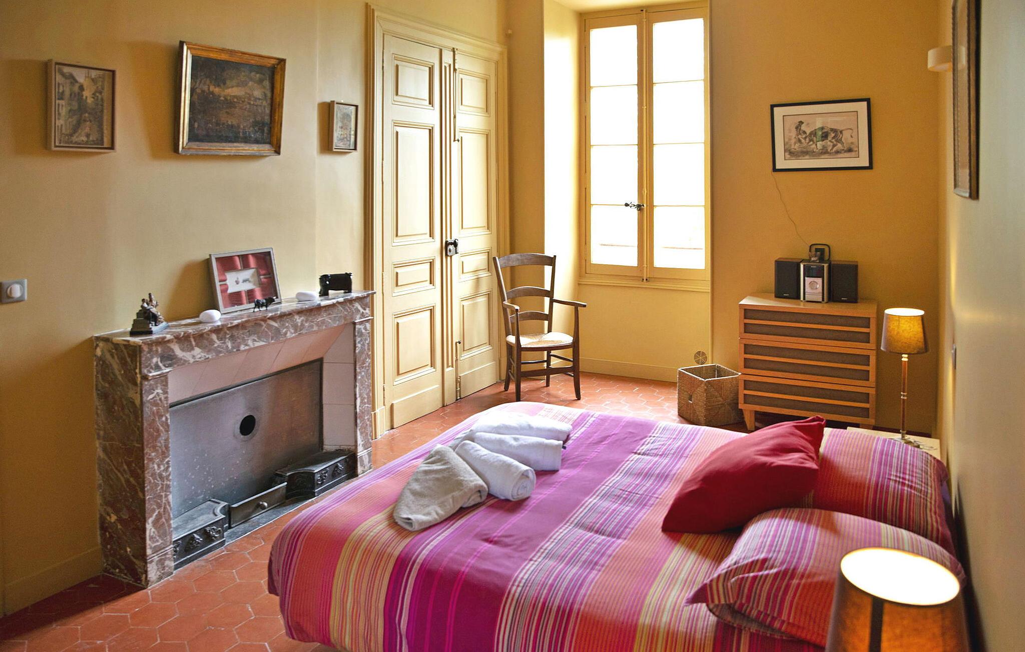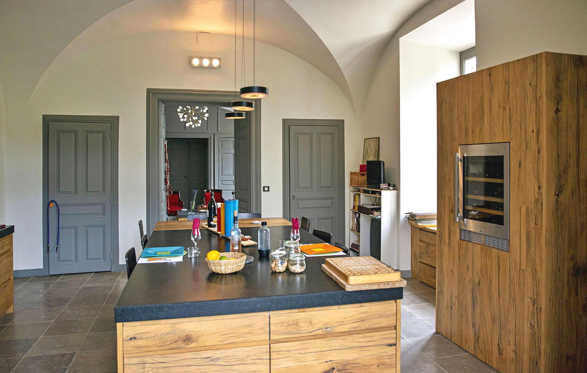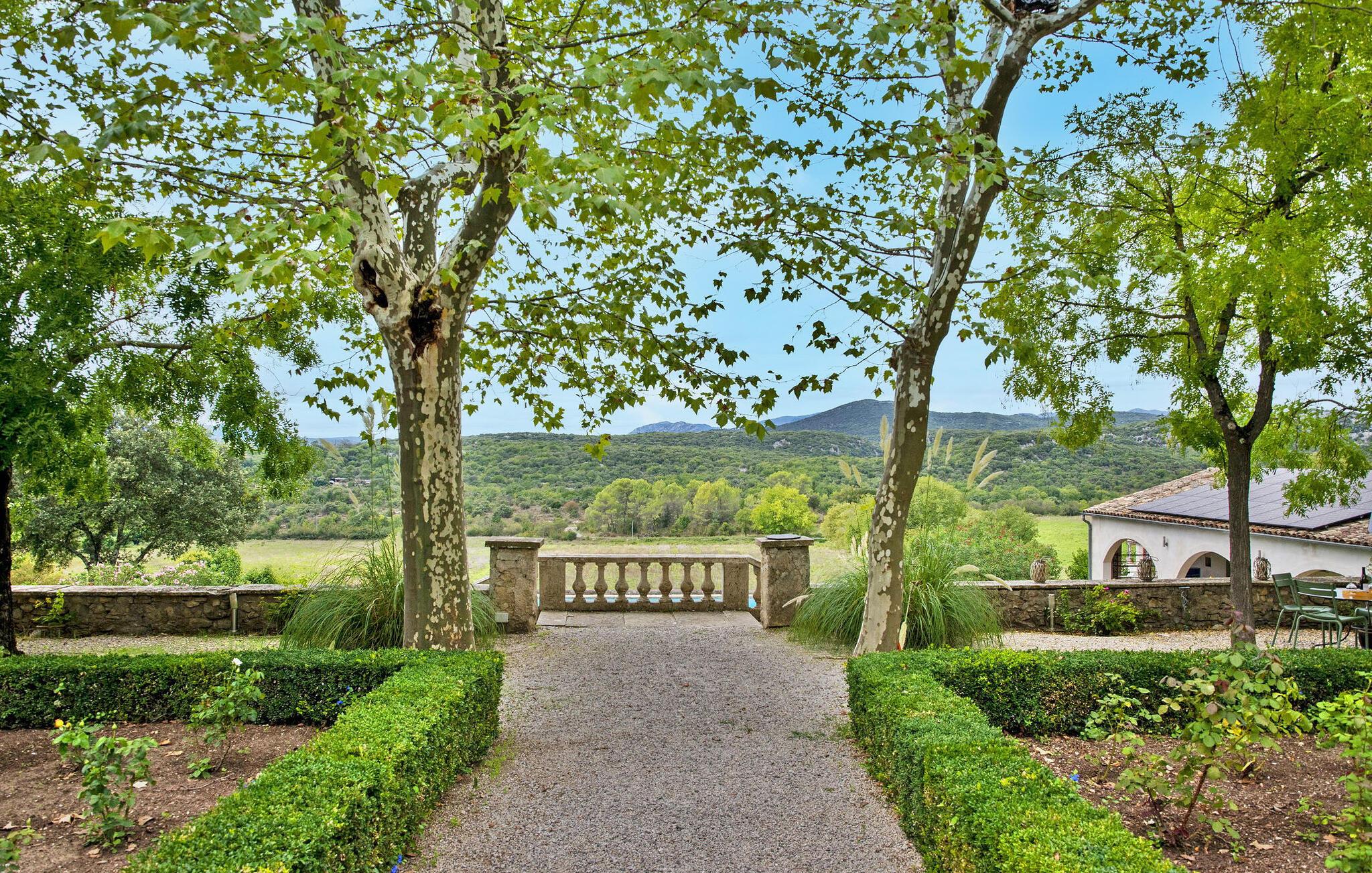 Dette smagfuldt renoverede slot fra det 13. århundrede, omgivet af rummelige grunde, byder på en fantastisk udsigt over Cevennerne. Stueetagen består af en entré, der fører til en lys opholdsstue, et veludstyret køkken, en spiseplads, en vestibule med toilet og et lille læseområde. Den centrale trappe fører til slottets forskellige fløje. Den venstre fløj har et fitnessrum, soveværelser med naturskøn udsigt og et brusebad. I mellemtiden indeholder højre fløj et vaskerum, soveværelser, badeværelser og en overdækket terrasse med udsigt over skoven. Udendørs er der en have i fransk stil, flere siddepladser, en swimmingpool med terrasse, et poolhus, underholdningsområder som en dartskive, bordtennisbord og en køkkenhave. Vigtige bemærkninger omfatter, at venstre fløj er klimatiseret, fraværet af et gelænder på vindeltrappen og behovet for opsyn på den lavrællede overdækkede terrasse på grund af dens bevarede arkitektoniske stil. Slottet ligger i Gard i Sauve.