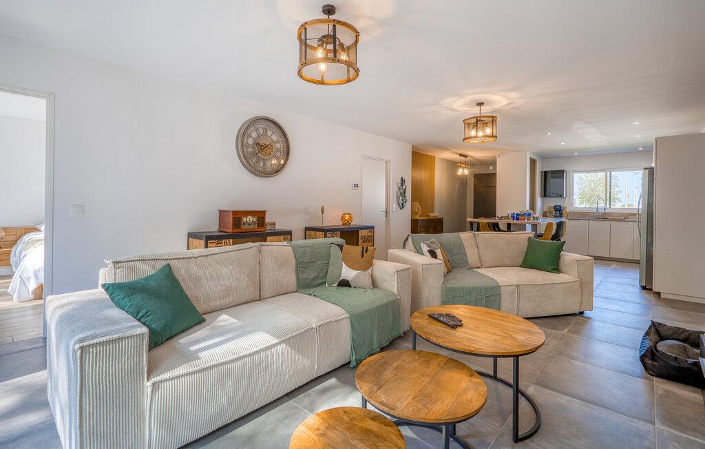 Denne rummelige, etplansbolig byder jer velkommen med lyse og smagfulde værelser og tilbyder en komfortabel base for en oplevelsesrig ferie med familien. Fremstil jeres yndlingsretter med friske ingredienser fra markedet, og planlæg aktiviteterne sammen ved det store spisebord. Om aftenen kan I hygge jer i de behagelige sofaer, spille et brætspil eller nyde en stille læsning.
