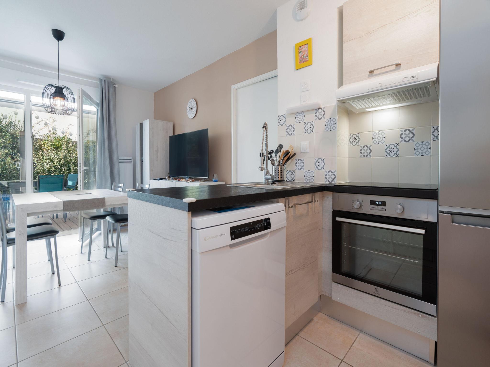 "La Dune N 71 - Villa 3P6", 3-room villa 56 m2, on the ground floor. Object suitable for 6 adults. 1 room with 1 double bed and TV. 1 room with 2 beds. Living room with 1 sofabed and 1 pull-out bed. Open kitchen (4 hot plates, oven, dishwasher, toaster, kettle, electric coffee machine). Shower/WC. Terrace. View of the garden. Parking (1 car). Please note: non-smokers only. Smoke alarm. Offer by a commercial proprietor according to Art. 155, IV, CGI