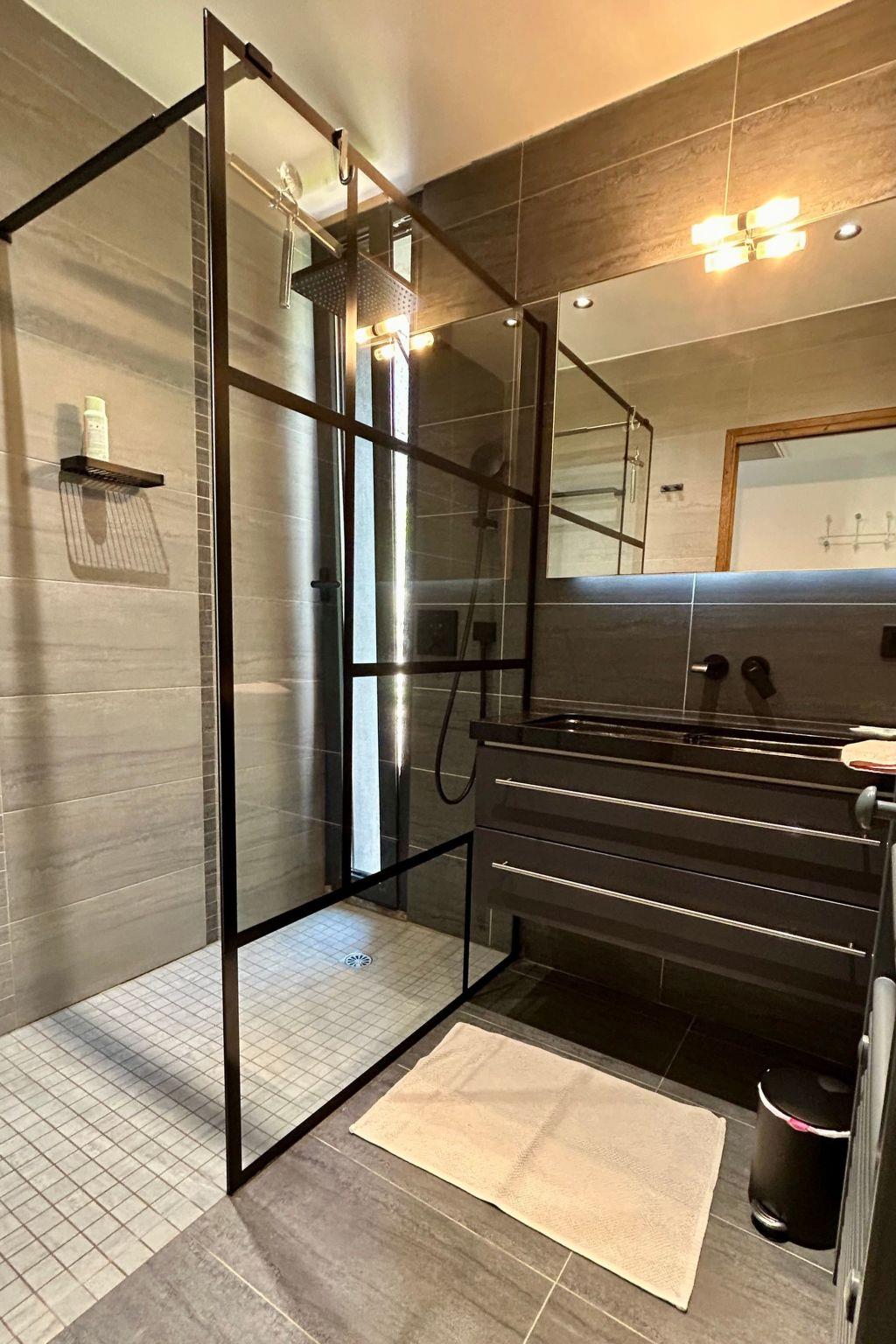 A casa nera , 30 m plage, villa standing, air-conditioned In contemporary villa standing, with sea view, rent the ground floor of 70 m² + 30 m² loggia (lunch in the shade) adjoining another outdoor terrace of 25 M2 in the wooded garden for your relaxation and "planchas" in the evening. quality services, fully air-conditioned, unlimited internet, TV, board games, books ... Terrace of 30 m² and 25 M2, wooden floor with table, chairs, sun loungers and parasol, outdoor plancha shower, and wooded garden.