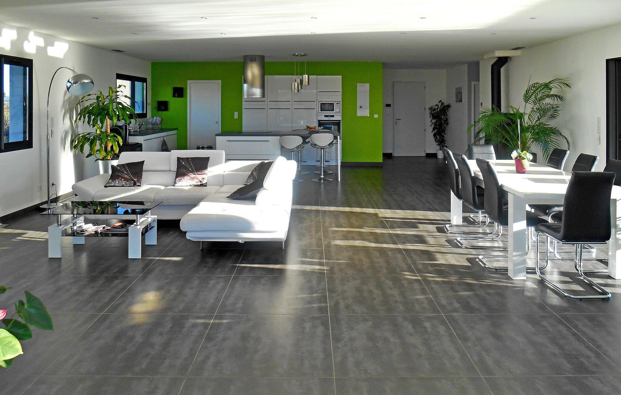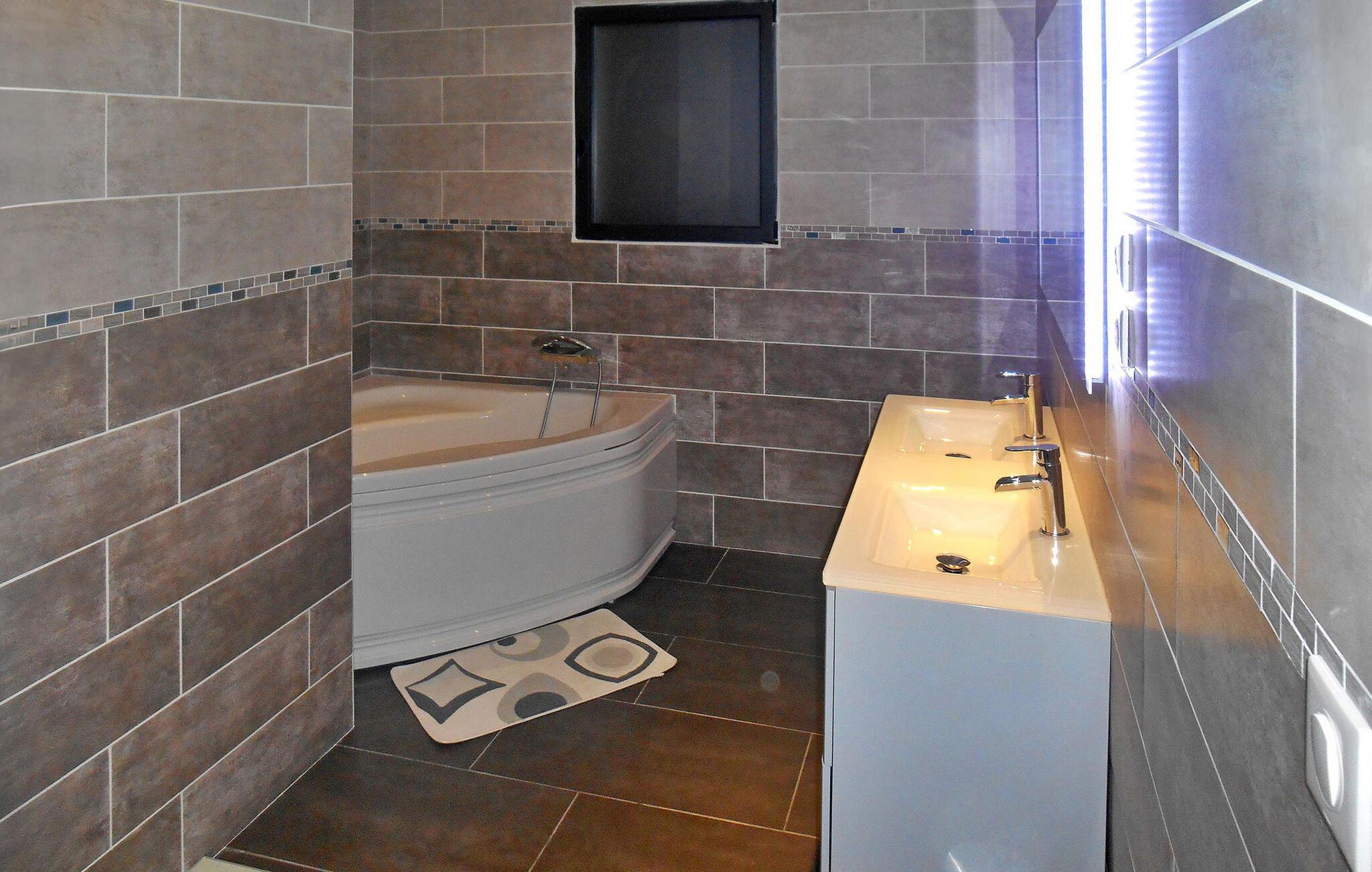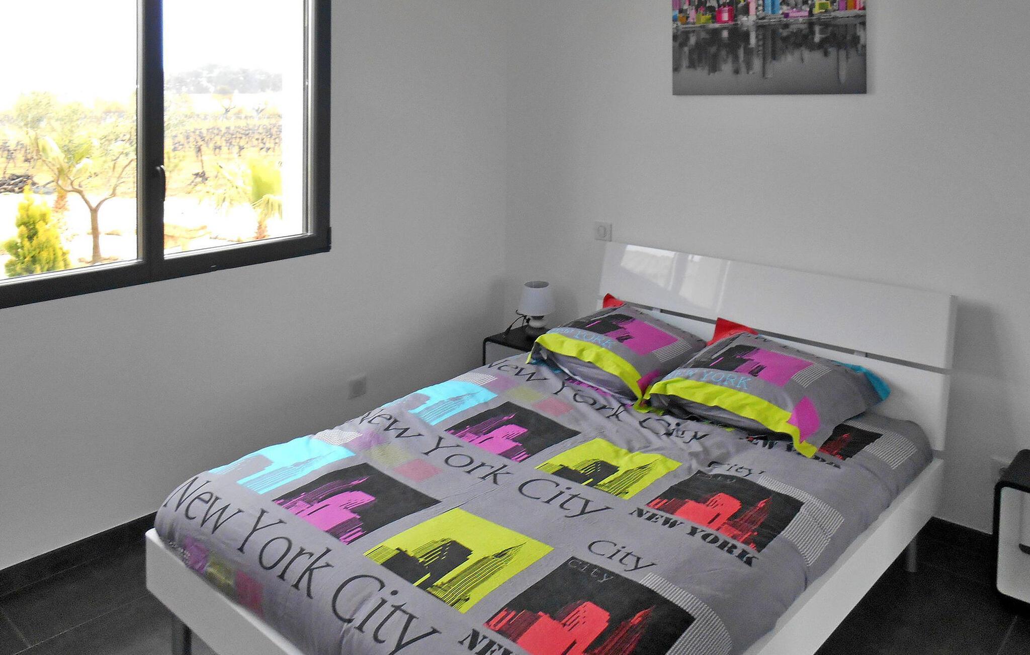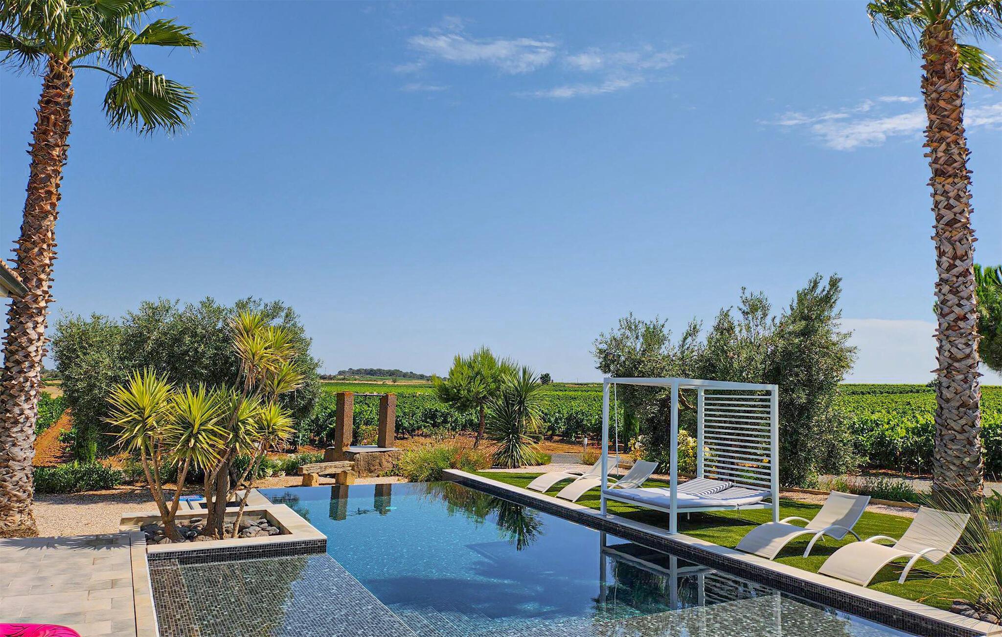 Beliggende midt i en vidtstrakt vingård, er denne moderne ferievilla kun en kort 25-minutters kørsel fra strandene i Vias, Valras, Marseillan og Cap d'Agde. Denne fuldt klimatiserede villa kan prale af en række funktioner til et behageligt ophold. Den ekspansive opholdsstue omfatter en sidde- og spiseplads. Karnapperne åbner problemfrit ud til terrassen og inkluderer elektriske skodder for nemheds skyld. Det veludstyrede køkken har en central ø, mens kælderen rummer vaskefaciliteter for ekstra bekvemmelighed. Udenfor vil du opdage en charmerende have i middelhavsstil pyntet med oliventræer og syntetisk græs. Den overdækkede terrasse har spisefaciliteter suppleret med en parasol. Den sydvendte terrasse byder på rige muligheder for afslapning og udendørs spisning. En lokkende 11m x 6m pool med en omgivende terrasse og liggestole venter på dig sammen med en solcelledrevet bruser i nærheden. Derudover omfatter det udendørs område en petanquebane, frugttræer, en gynge og et bordtennisområde. Denne vidunderlige ejendom tilbyder bekvemmelighed, mens den er omgivet af det fredfyldte vingårdslandskab. De nærmeste butikker ligger cirka 1,5 km væk i Servian. Bemærk venligst: der er en sikret brønd på stedet.