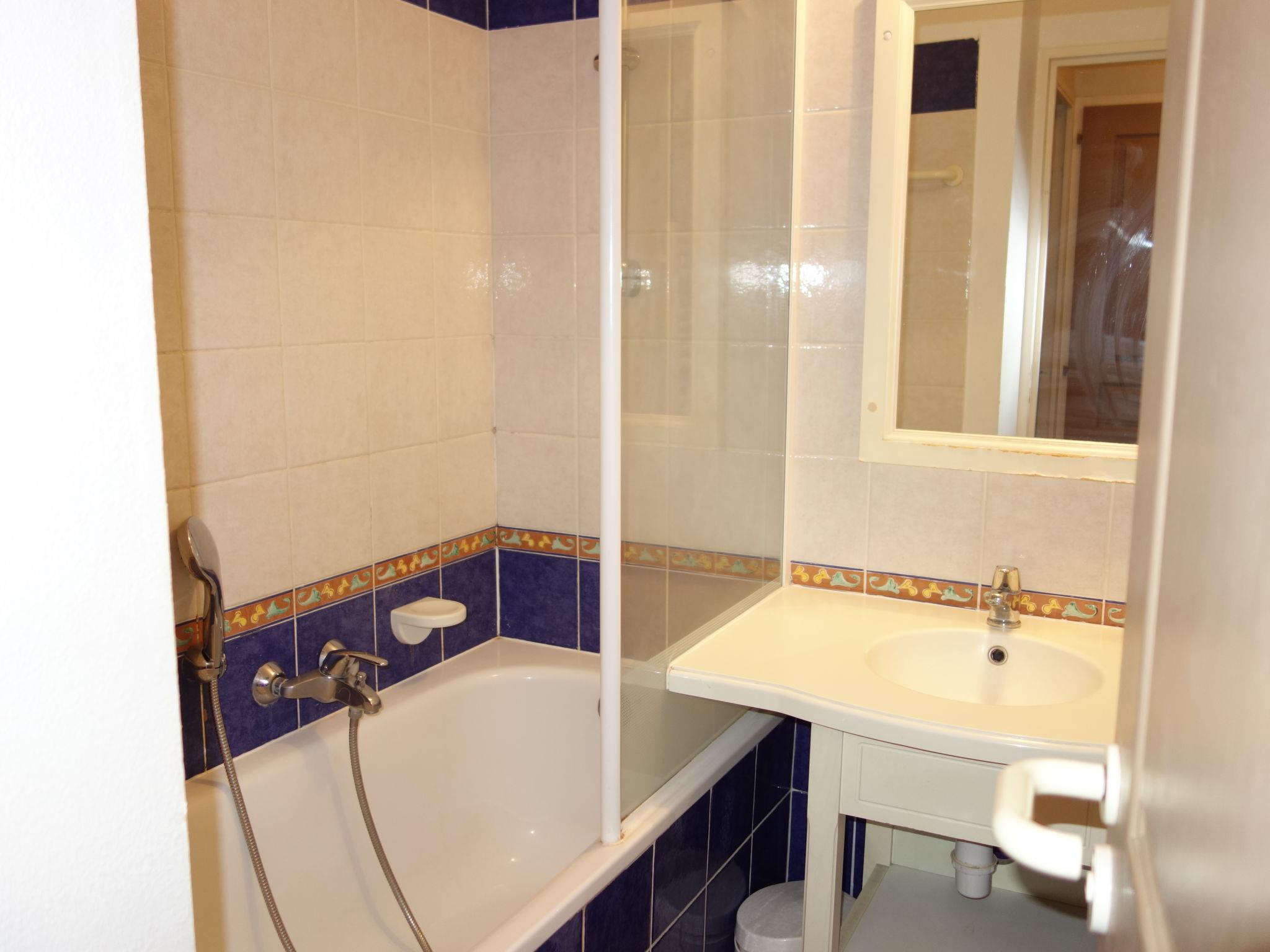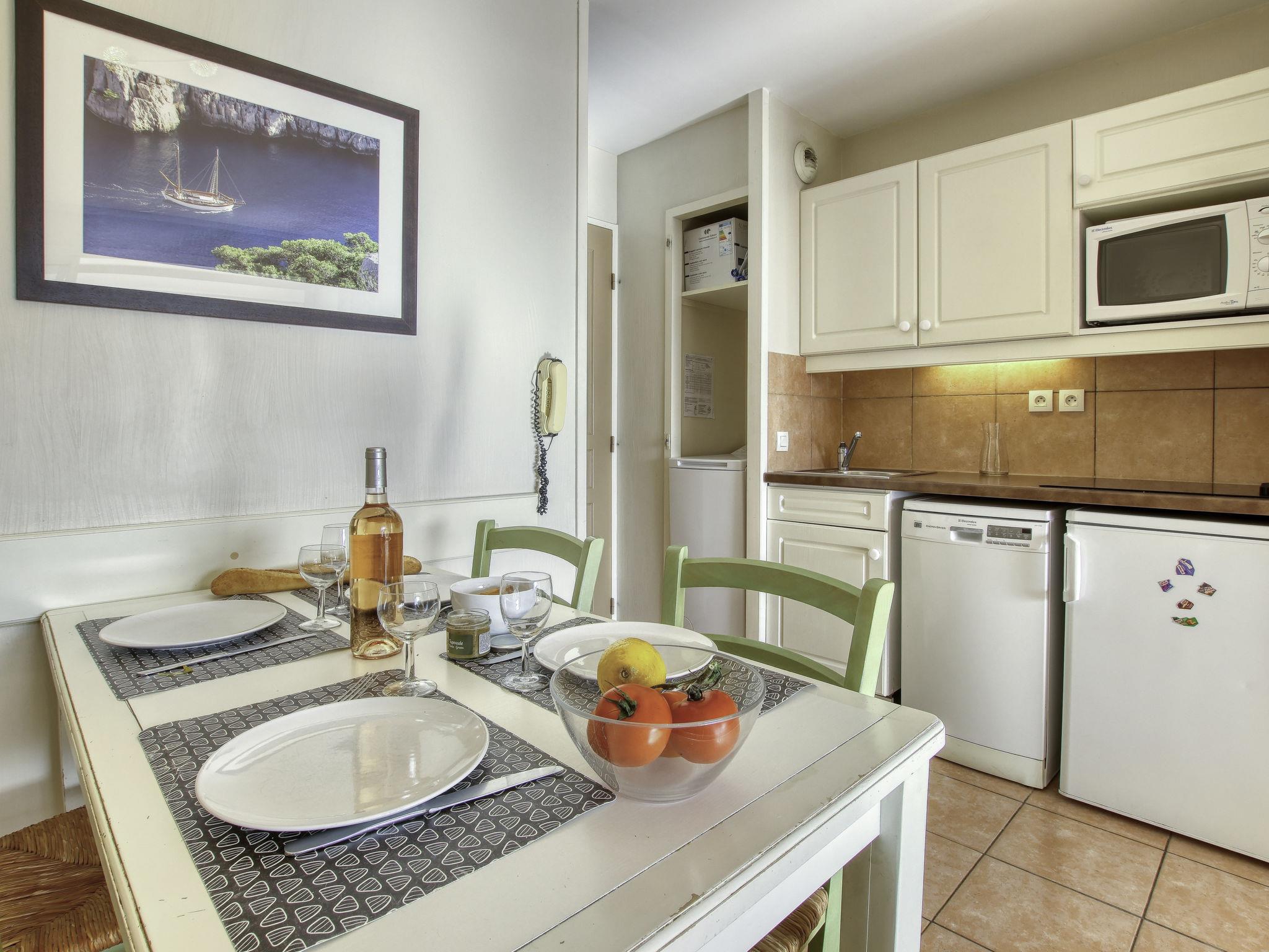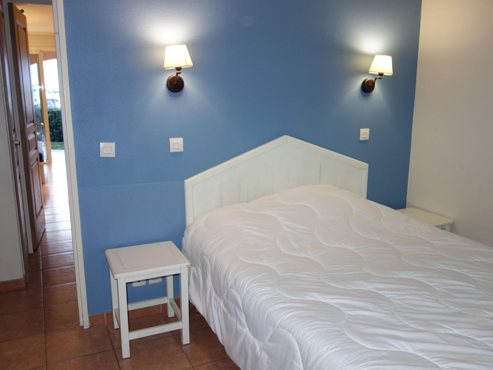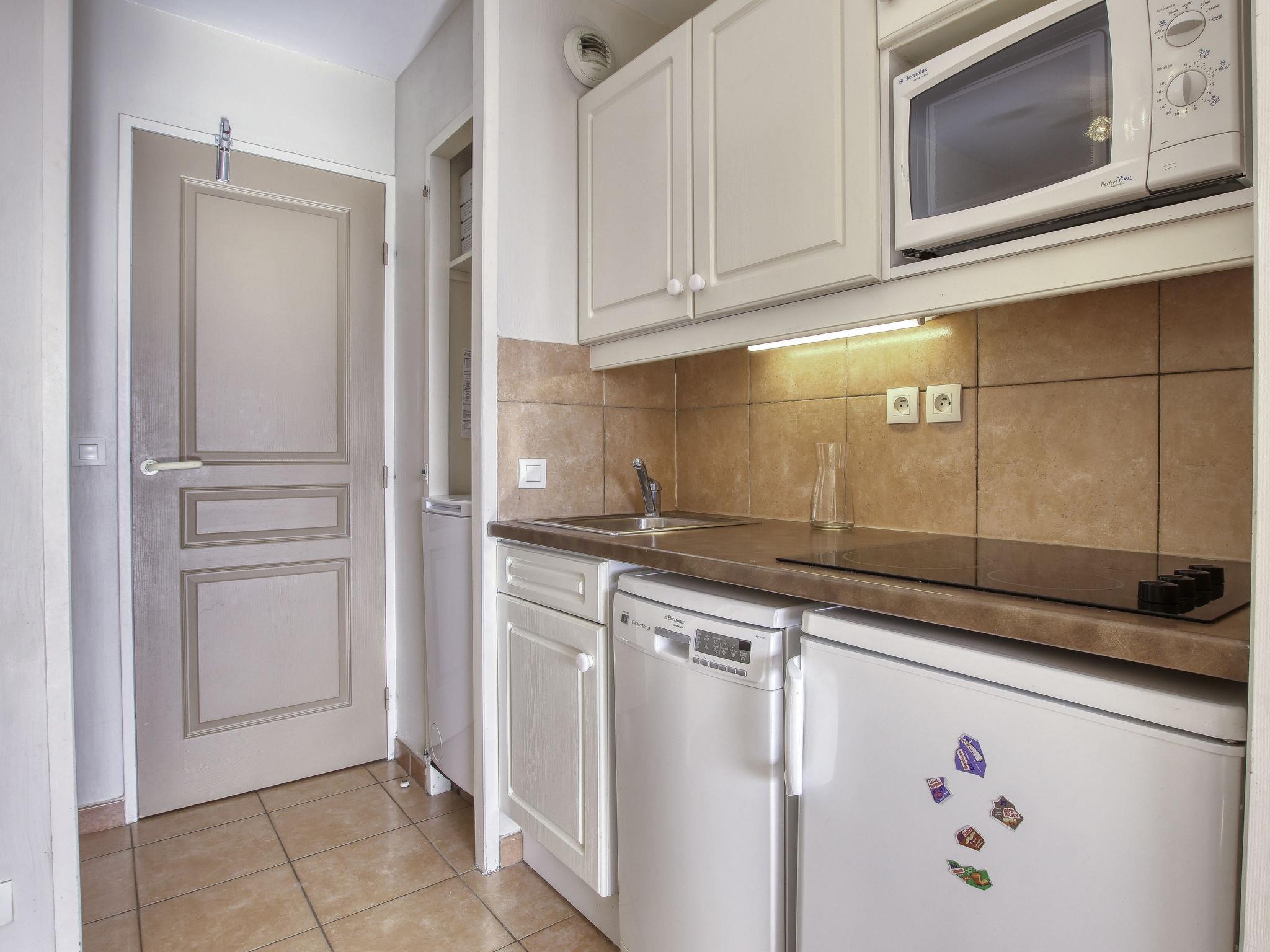 2-room apartment 32 m2, on the ground floor. Practical and beautiful furnishings: living/dining room with 2 beds (80 cm, length 190 cm), TV (flat screen). Exit to the terrace. 1 room with 1 french bed (1 x 140 cm, length 190 cm). Kitchenette (dishwasher, 4 ceramic glass hob hotplates, toaster, kettle, microwave, electric coffee machine). Bathroom, sep. WC. Electric heating. Terrace 8 m2, roofed, south-west facing position, small patio 4 m2. Terrace furniture. View of the sea and the swimming pool. Facilities: washing machine. Internet (WiFi, extra). Parking space n 428 (Niveau P1) (roofed), height 190 cm, width 240 cm. Please note: maximum 1 pet/ dog allowed. TV only FR. Smoke alarm. Note: the garden is not fenced.