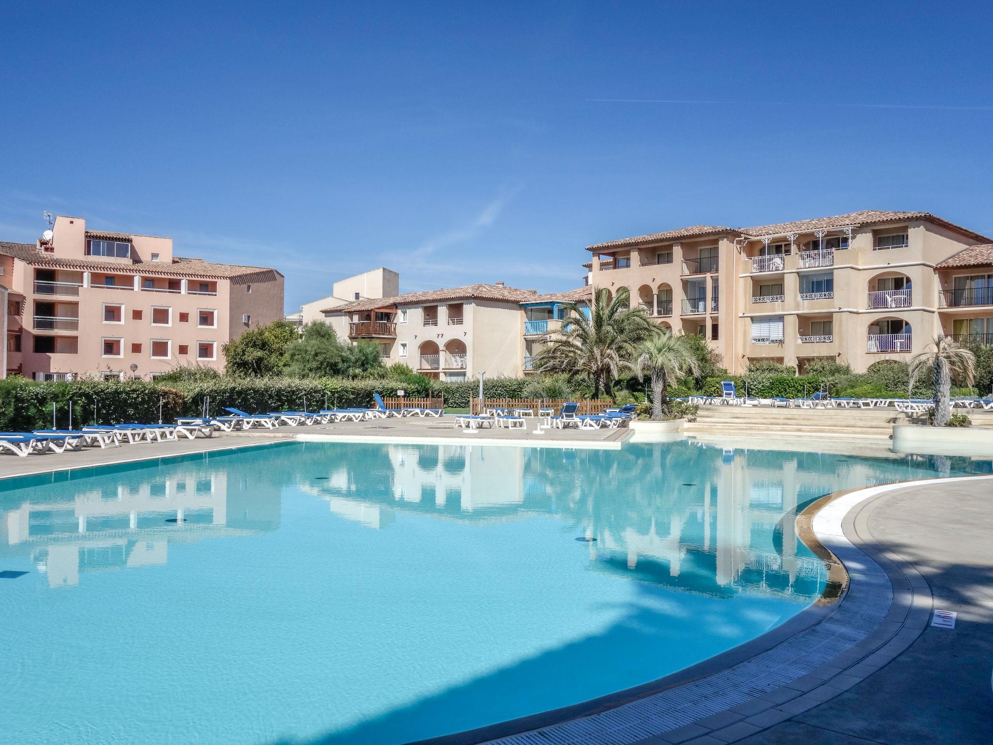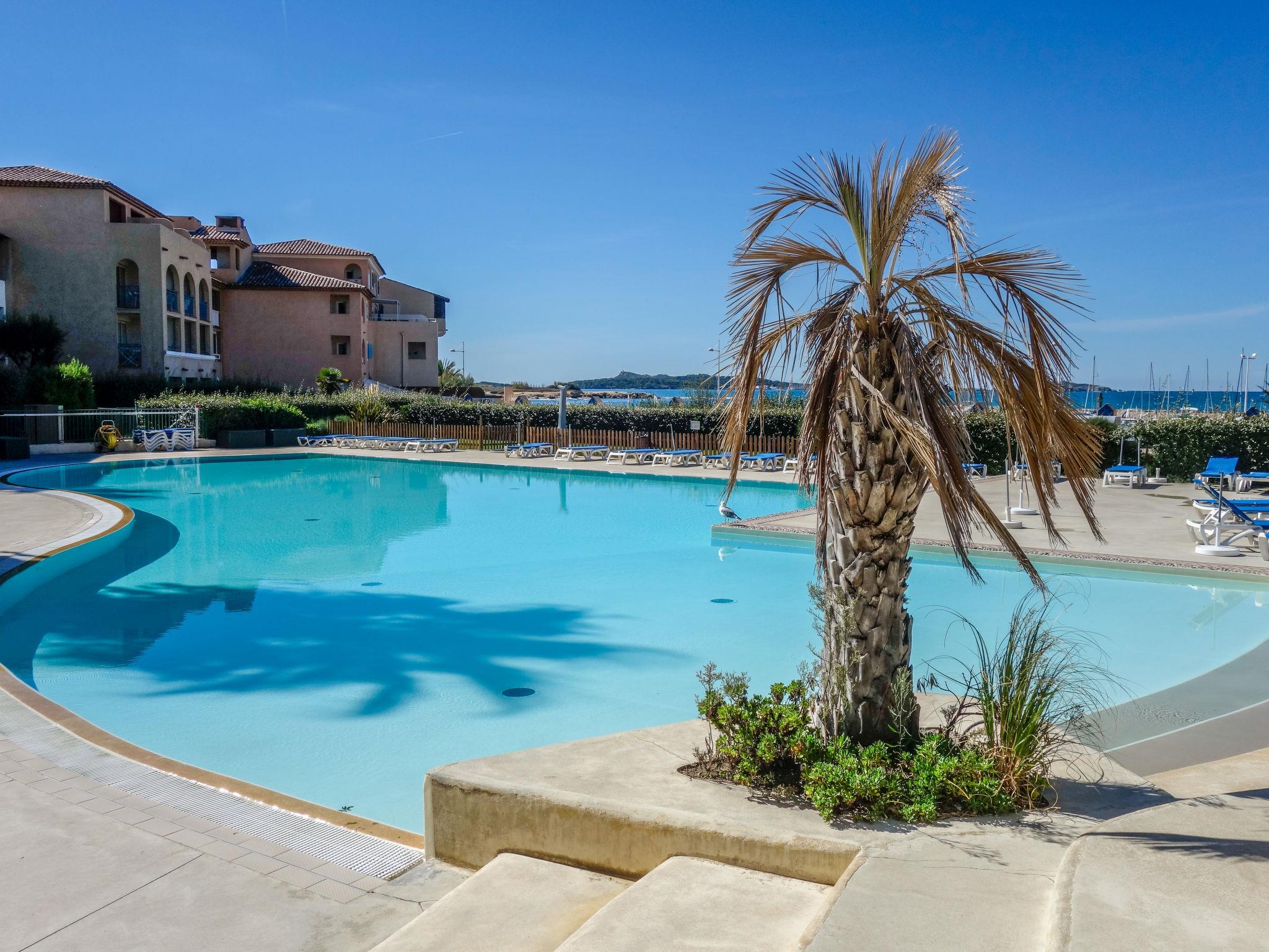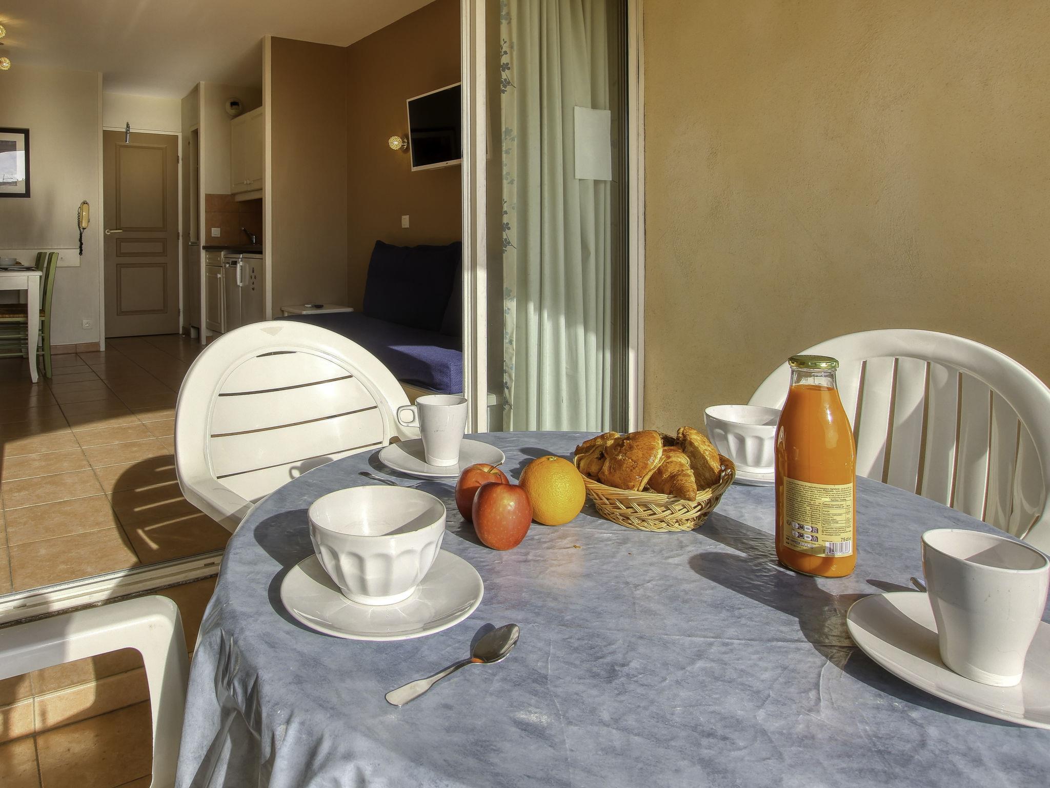 2-room apartment 32 m2, on the ground floor. Practical and beautiful furnishings: living/dining room with 2 beds (80 cm, length 190 cm), TV (flat screen). Exit to the terrace. 1 room with 1 french bed (1 x 140 cm, length 190 cm). Kitchenette (dishwasher, 4 ceramic glass hob hotplates, toaster, kettle, microwave, electric coffee machine). Bathroom, sep. WC. Electric heating. Terrace 8 m2, roofed, south-west facing position, small patio 4 m2. Terrace furniture. View of the sea and the swimming pool. Facilities: washing machine. Internet (WiFi, extra). Parking space n 428 (Niveau P1) (roofed), height 190 cm, width 240 cm. Please note: maximum 1 pet/ dog allowed. TV only FR. Smoke alarm. Note: the garden is not fenced.