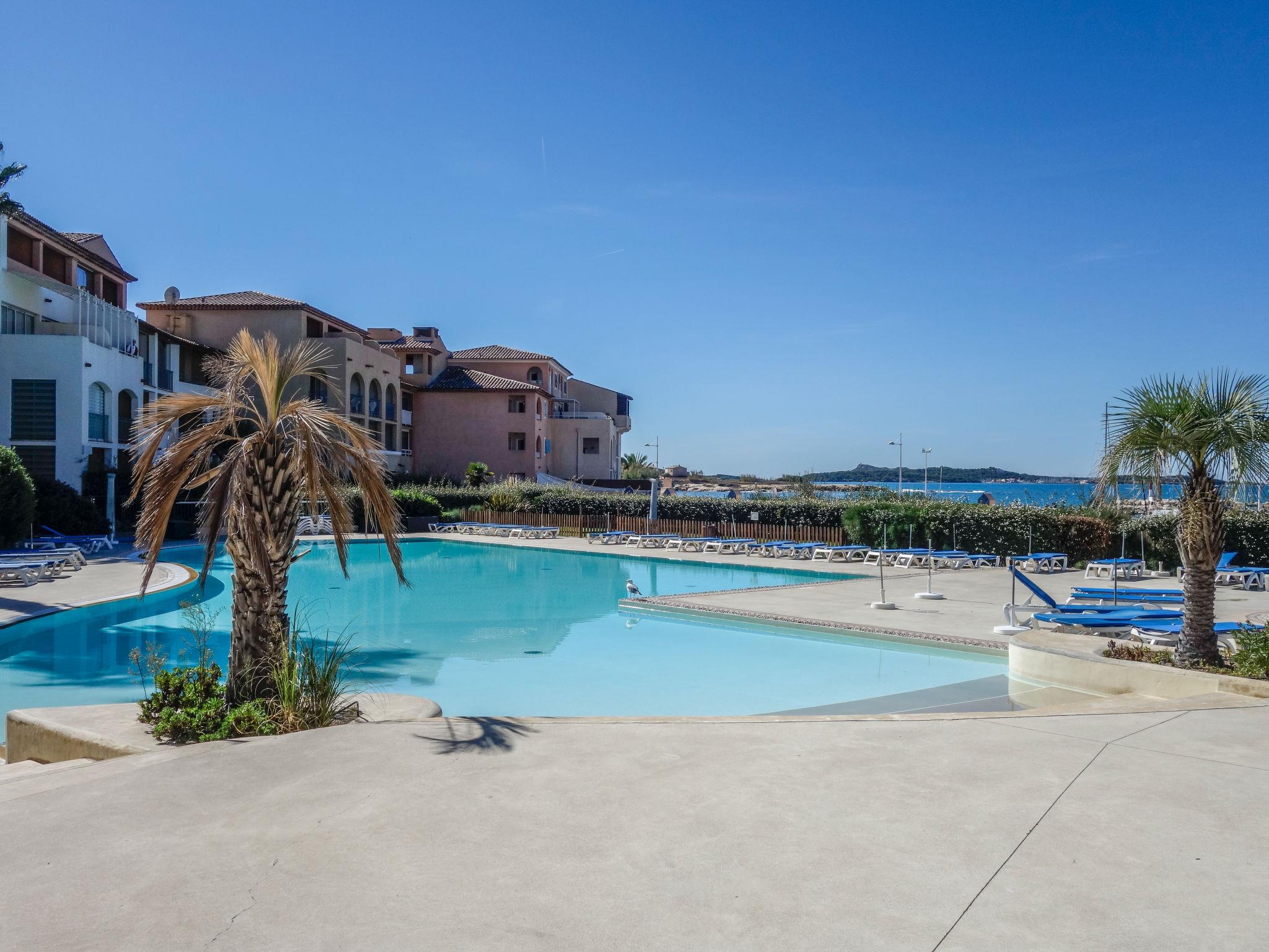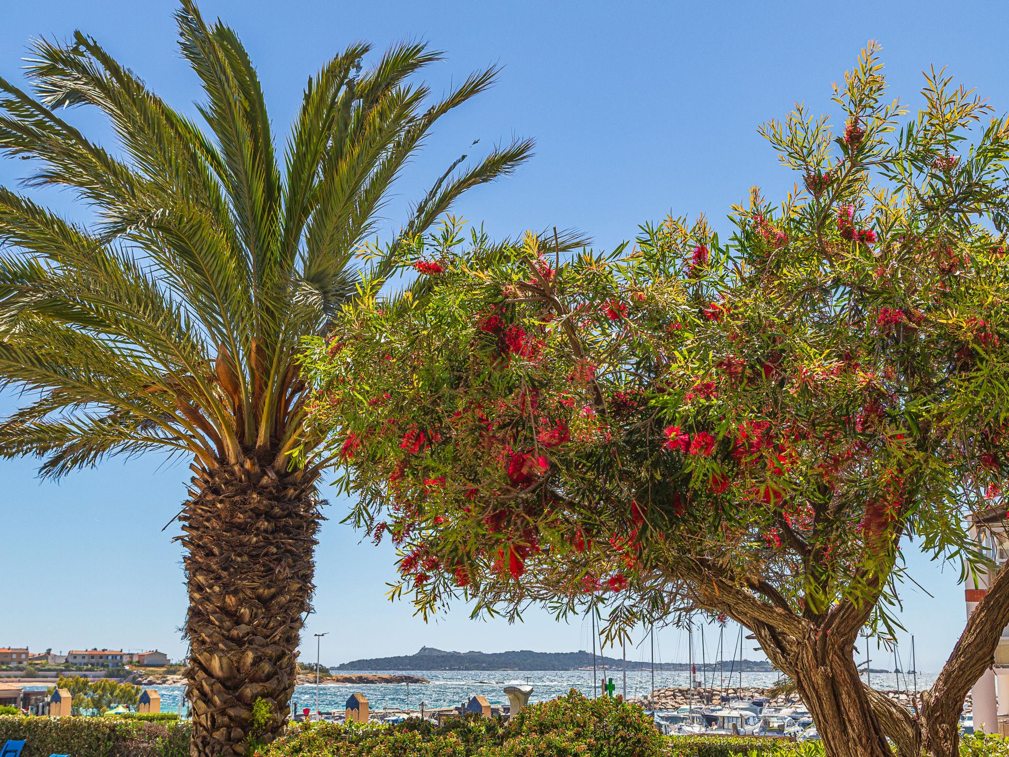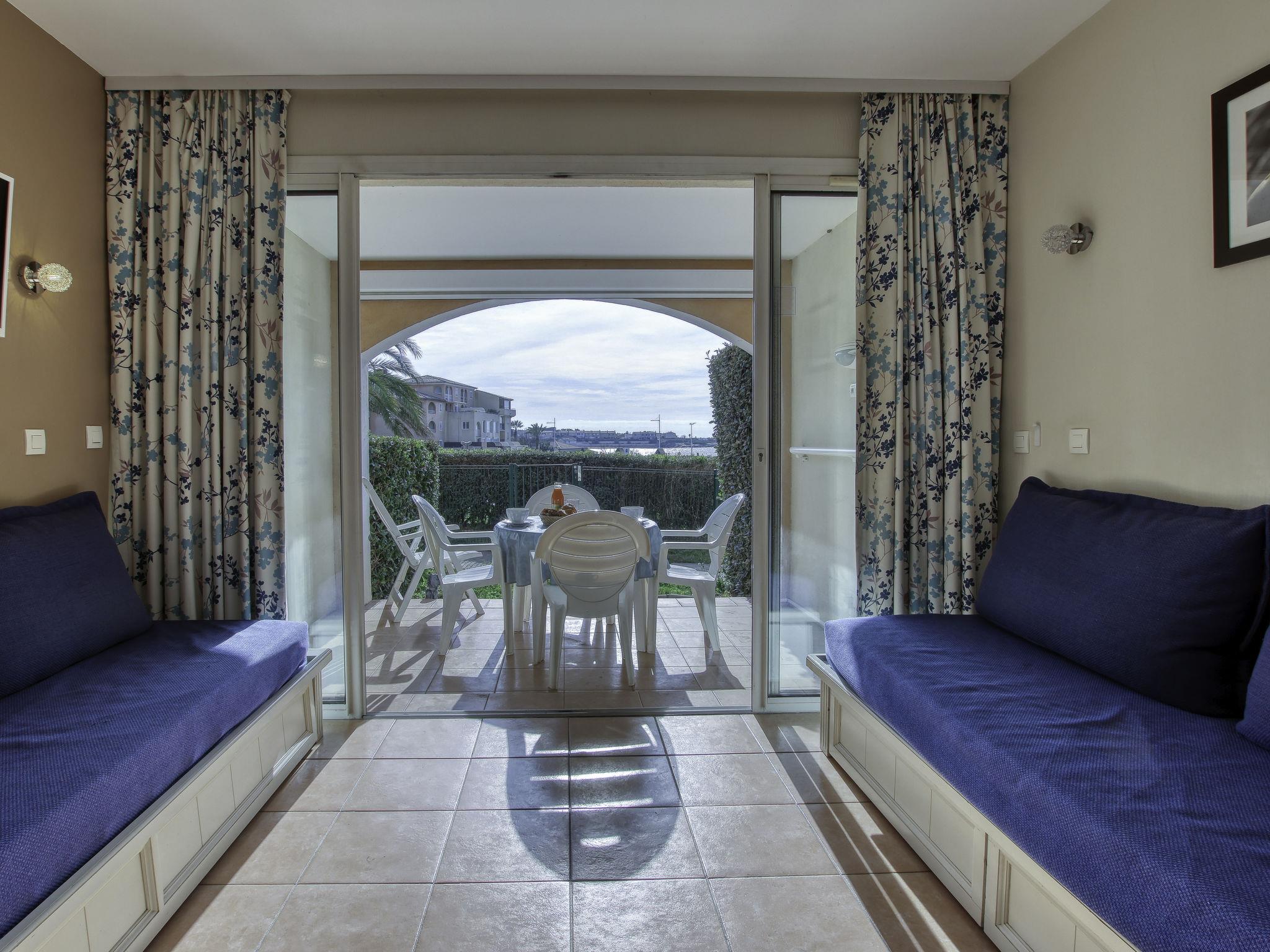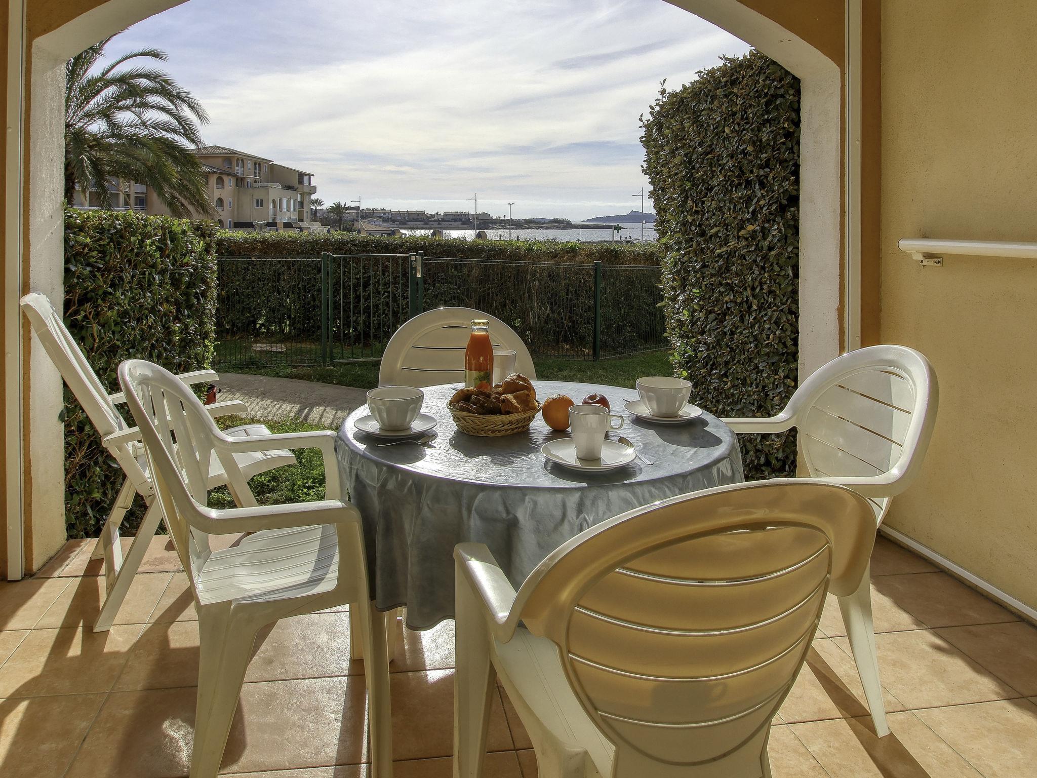 2-room apartment 32 m2, on the ground floor. Practical and beautiful furnishings: living/dining room with 2 beds (80 cm, length 190 cm), TV (flat screen). Exit to the terrace. 1 room with 1 french bed (1 x 140 cm, length 190 cm). Kitchenette (dishwasher, 4 ceramic glass hob hotplates, toaster, kettle, microwave, electric coffee machine). Bathroom, sep. WC. Electric heating. Terrace 8 m2, roofed, south-west facing position, small patio 4 m2. Terrace furniture. View of the sea and the swimming pool. Facilities: washing machine. Internet (WiFi, extra). Parking space n 428 (Niveau P1) (roofed), height 190 cm, width 240 cm. Please note: maximum 1 pet/ dog allowed. TV only FR. Smoke alarm. Note: the garden is not fenced.