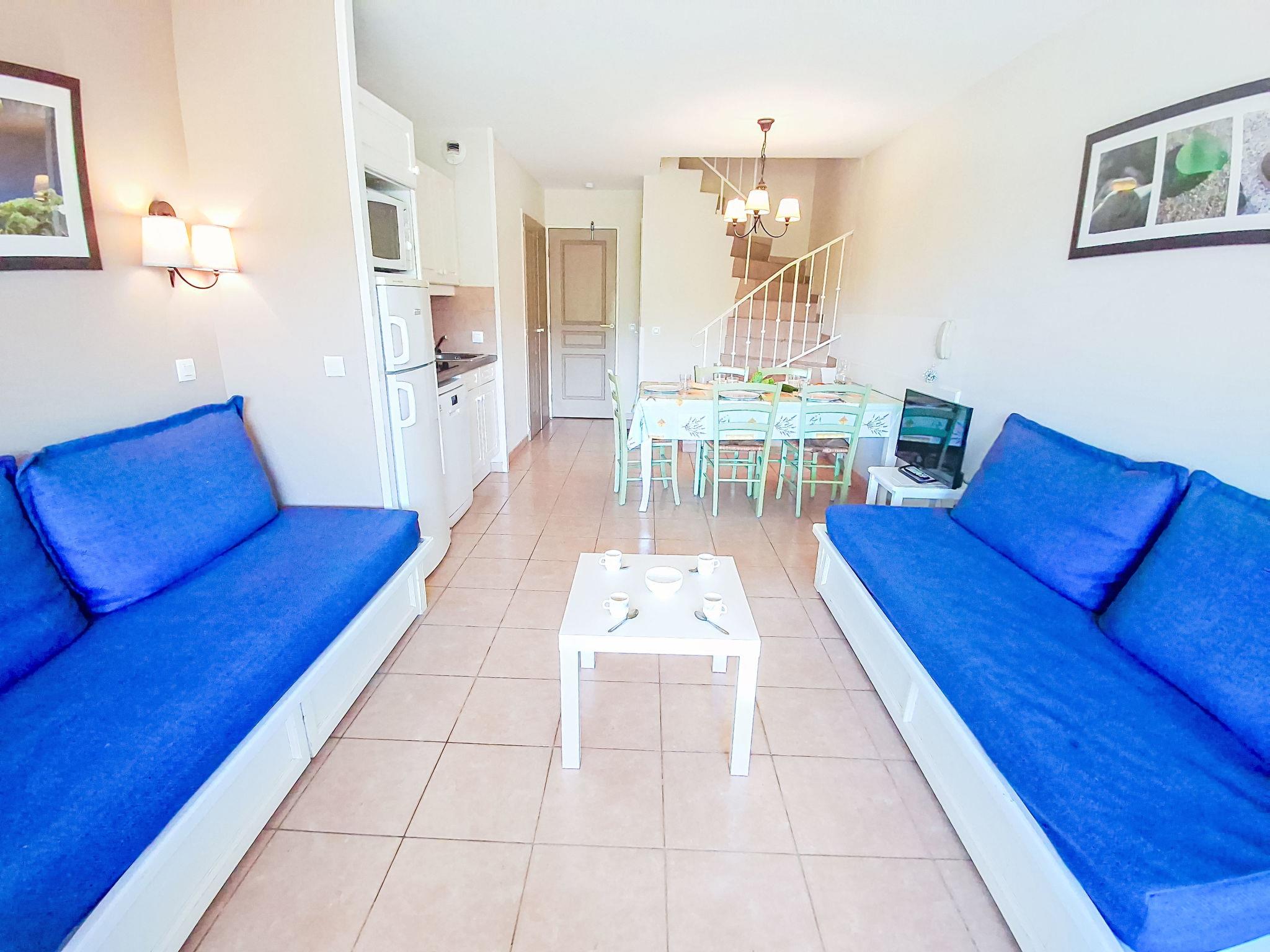 3-room maisonette 45 m2 on 3rd floor. Beautiful furnishings: living/dining room with 2 beds (80 cm, length 190 cm), TV (flat screen). Exit to the terrace. Sleeping alcove with 1 x 2 bunk beds (80 cm, length 190 cm). Kitchenette (dishwasher, 4 ceramic glass hob hotplates, microwave, freezer, electric coffee machine). Shower/WC. Electric heating. Upper floor: 1 room with 1 french bed (140 cm, length 190 cm), bath/WC. Exit to the terrace. Terrace 7 m2, roofed, east facing position. Terrace furniture. Beautiful view of the lake and the garden. Facilities: Internet (WiFi, extra). Parking space n 494 (Niveau 1) (roofed), height 190 cm, width 240 cm. Please note: maximum 1 pet/ dog allowed. TV only FR. Smoke alarm. Instead of an enclosed bedroom, some sleeping areas are located in an open-plan area (gallery, alcove, etc.).