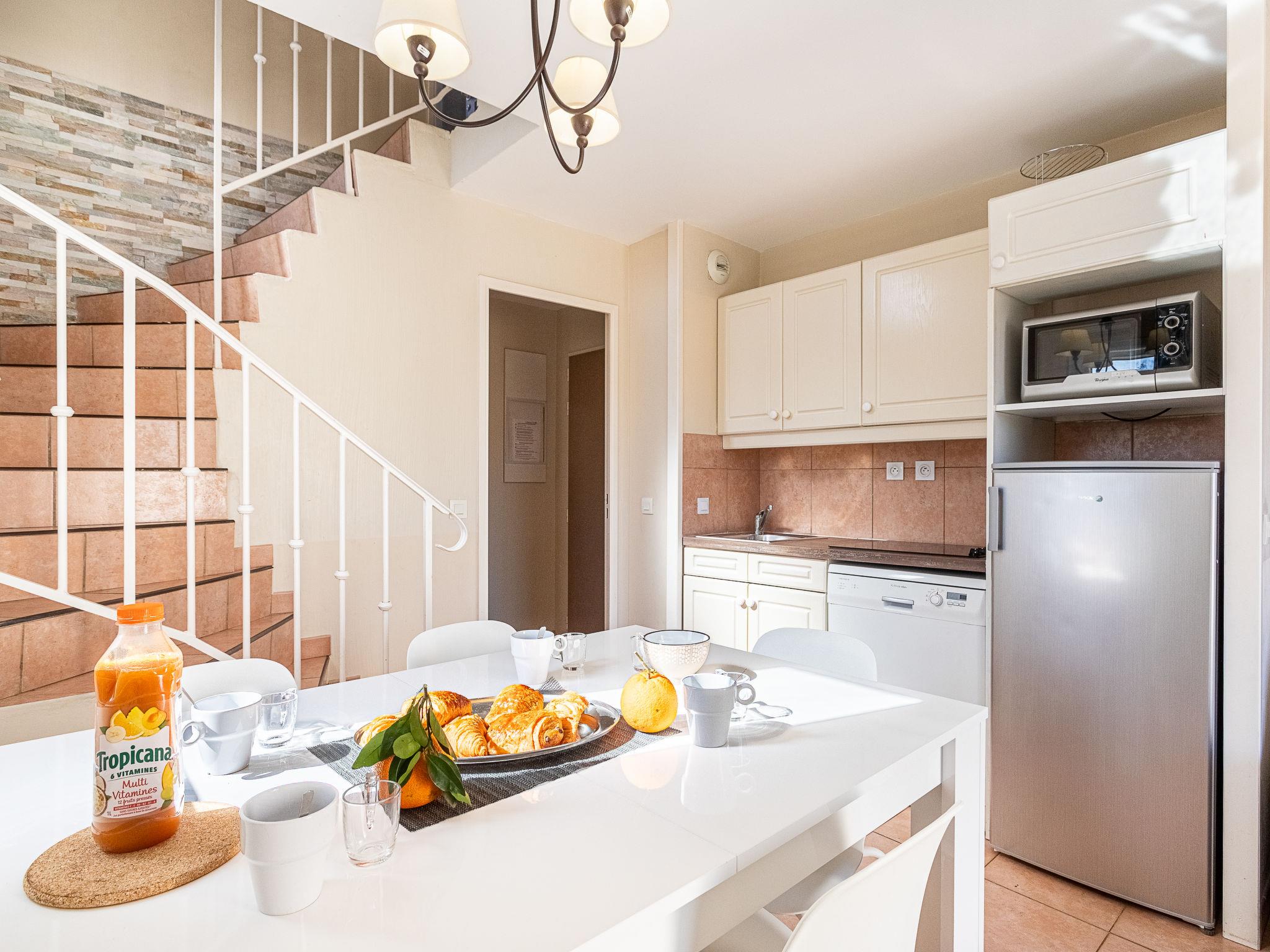 3-room maisonette 45 m2 on 3rd floor. Practical and beautiful furnishings: living/dining room with 1 sofabed (70 cm, length 190 cm), TV (flat screen). Exit to the terrace. Sleeping alcove with 1 x 2 bunk beds (80 cm, length 190 cm). Kitchenette (dishwasher, 4 ceramic glass hob hotplates, microwave, electric coffee machine). Shower/WC. Upper floor: 1 room with 1 french bed (140 cm, length 190 cm), bath/WC. Exit to the terrace. Electric heating. Terrace 7 m2, east facing position and south facing position, terrace 5 m2, roofed, east facing position. Terrace furniture. Beautiful view of the lake and the garden. Facilities: Internet (WiFi, extra). Parking space n 600 (Niveau P2) (roofed), height 190 cm. Please note: TV only FR. Smoke alarm. Instead of an enclosed bedroom, some sleeping areas are located in an open-plan area (gallery, alcove, etc.). 83129/2020/541M