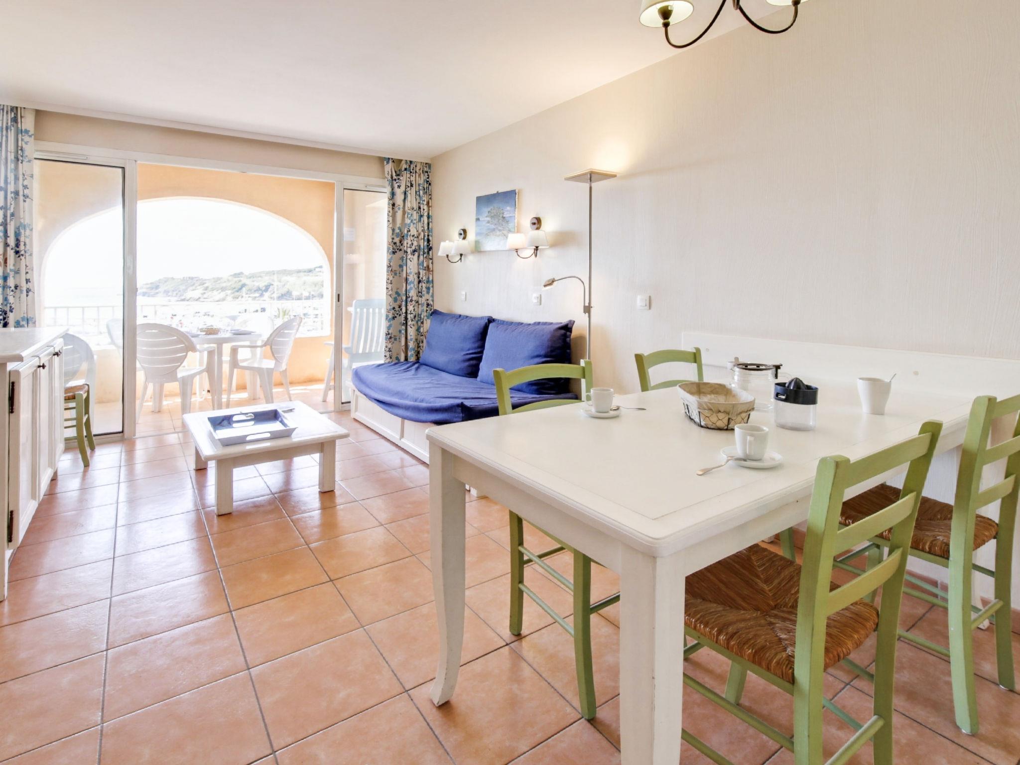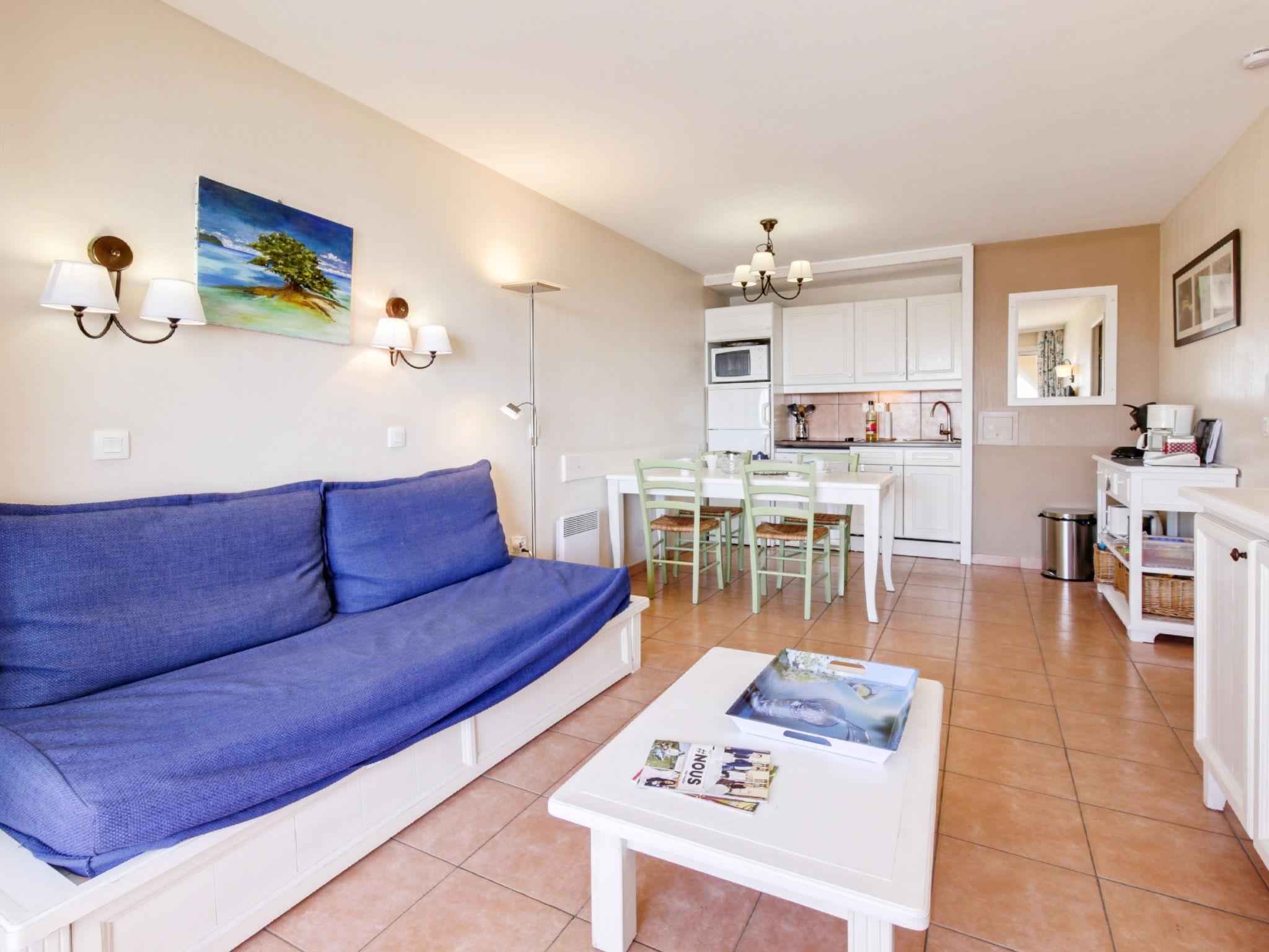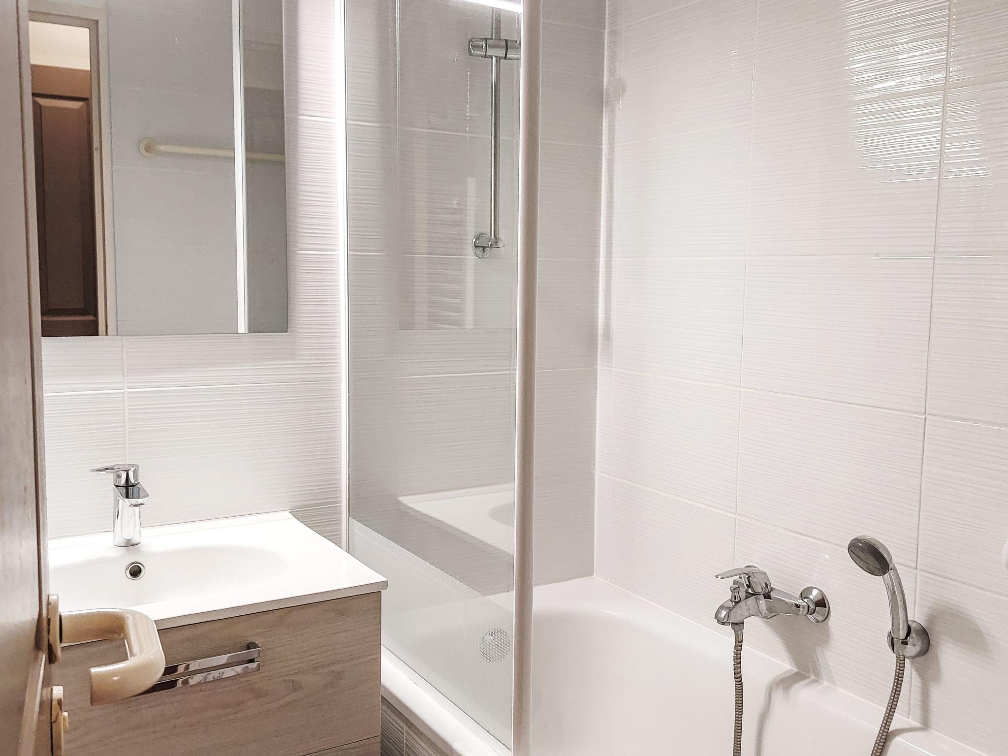 3-room apartment 39 m2 on 2nd floor. Practical and comfortable furnishings: living/dining room with 1 bed (80 cm, length 190 cm), TV (flat screen). Exit to the terrace. Sleeping alcove with 1 x 2 bunk beds (80 cm, length 190 cm). 1 room with 1 french bed (140 cm, length 190 cm). Kitchenette (dishwasher, 4 ceramic glass hob hotplates, toaster, kettle, microwave, electric coffee machine). Bathroom, shower/WC. Electric heating. Terrace 7 m2, west facing position. Terrace furniture. Beautiful view of the sea. Facilities: Internet (WiFi, extra). Parking space n 468 (niveau 1) (roofed), height 190 cm, width 240 cm. Please note: apartment street side. TV only FR. Smoke alarm. Instead of an enclosed bedroom, some sleeping areas are located in an open-plan area (gallery, alcove, etc.).