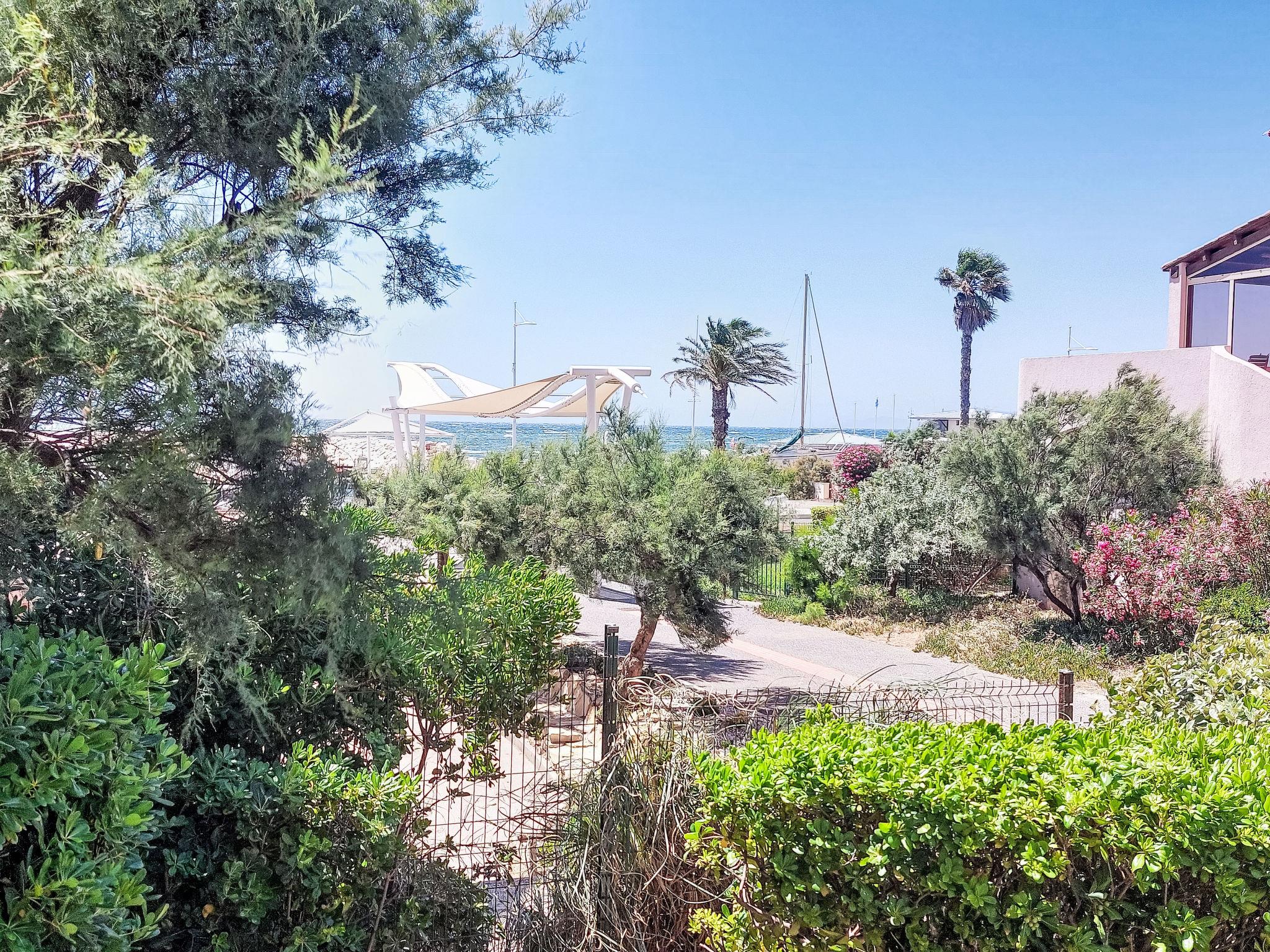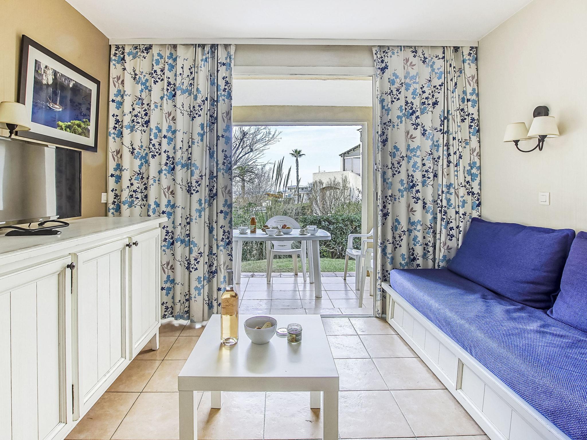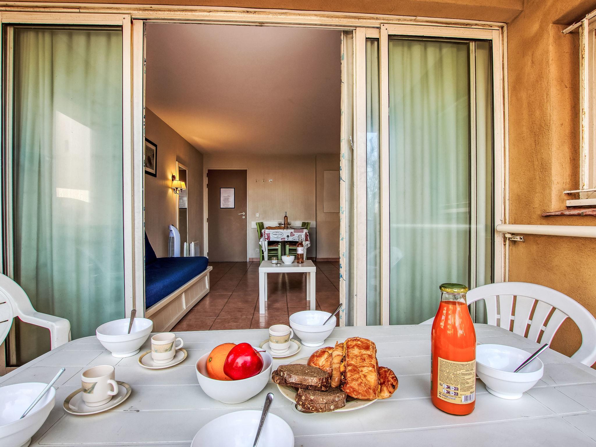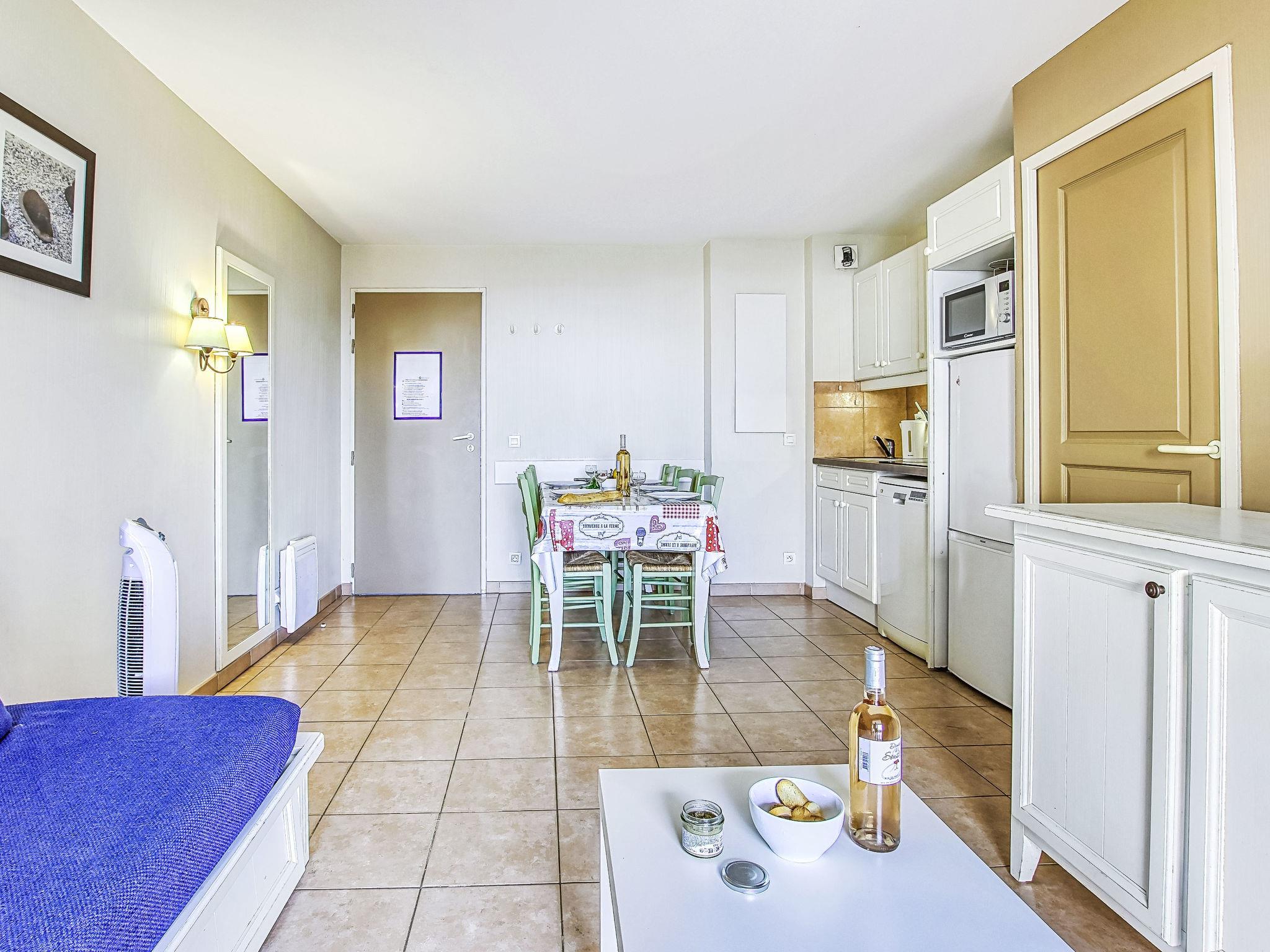 3-room apartment 45 m2, on the ground floor. Practical and beautiful furnishings: living/dining room with 1 bed (80 cm, length 190 cm), TV (flat screen). Exit to the terrace. Sleeping alcove with 1 x 2 bunk beds (80 cm, length 190 cm). 1 room with 1 french bed (140 cm, length 190 cm). Kitchenette (dishwasher, 4 ceramic glass hob hotplates, toaster, kettle, microwave, freezer, electric coffee machine). Bathroom, shower/WC. Electric heating. Terrace 7 m2, roofed, west facing position, small patio 3 m2, west facing position. Terrace furniture. Distant view of the sea. Facilities: Internet (WiFi, extra). Parking space n 401 (Niveau 1) (roofed), height 190 cm, width 230 cm. Please note: maximum 1 pet/ dog allowed. TV only FR. Smoke alarm. The garden is not fenced. Instead of an enclosed bedroom, some sleeping areas are located in an open-plan area (gallery, alcove, etc.).