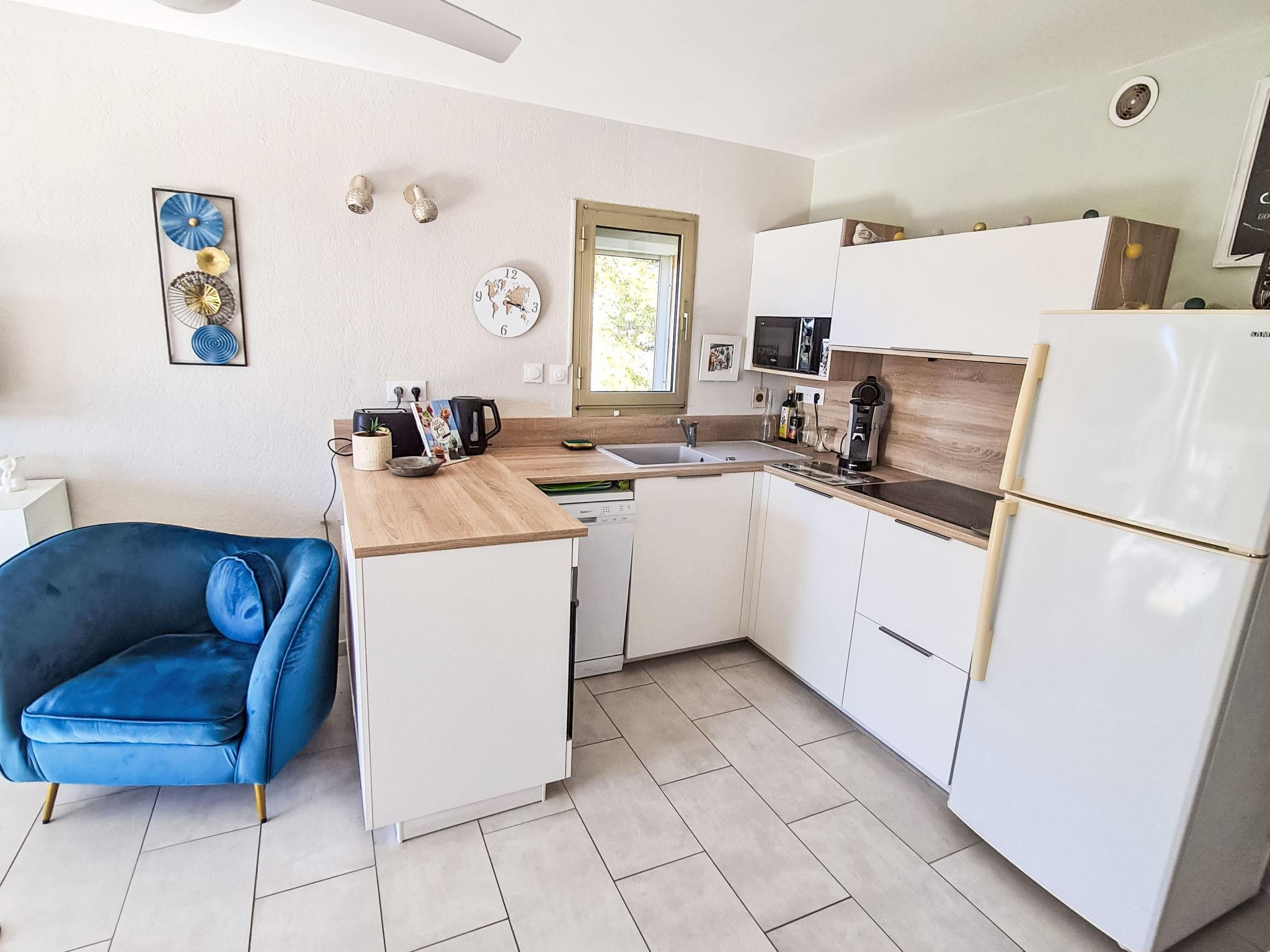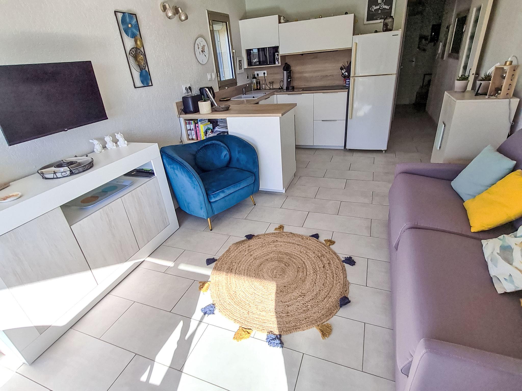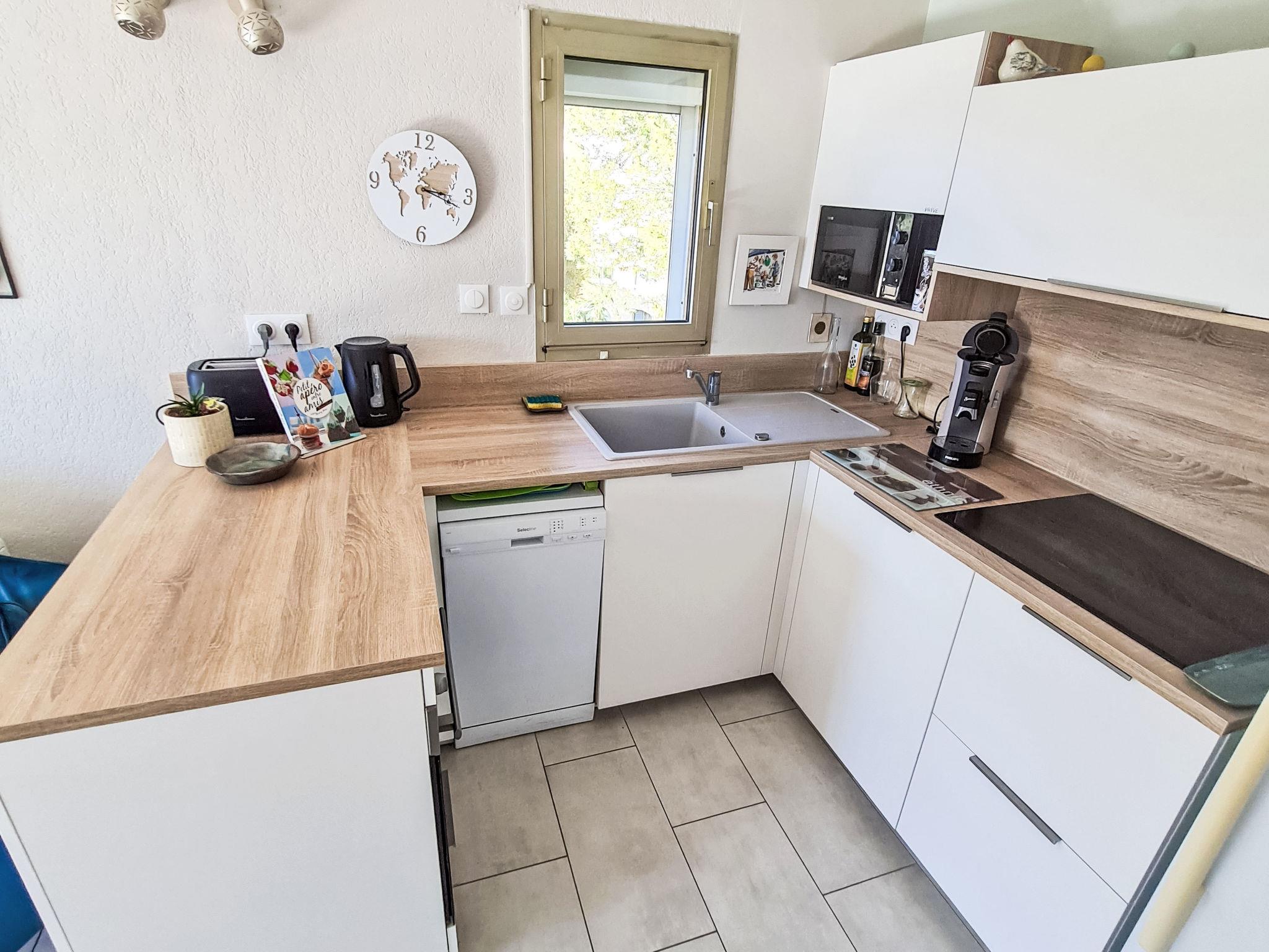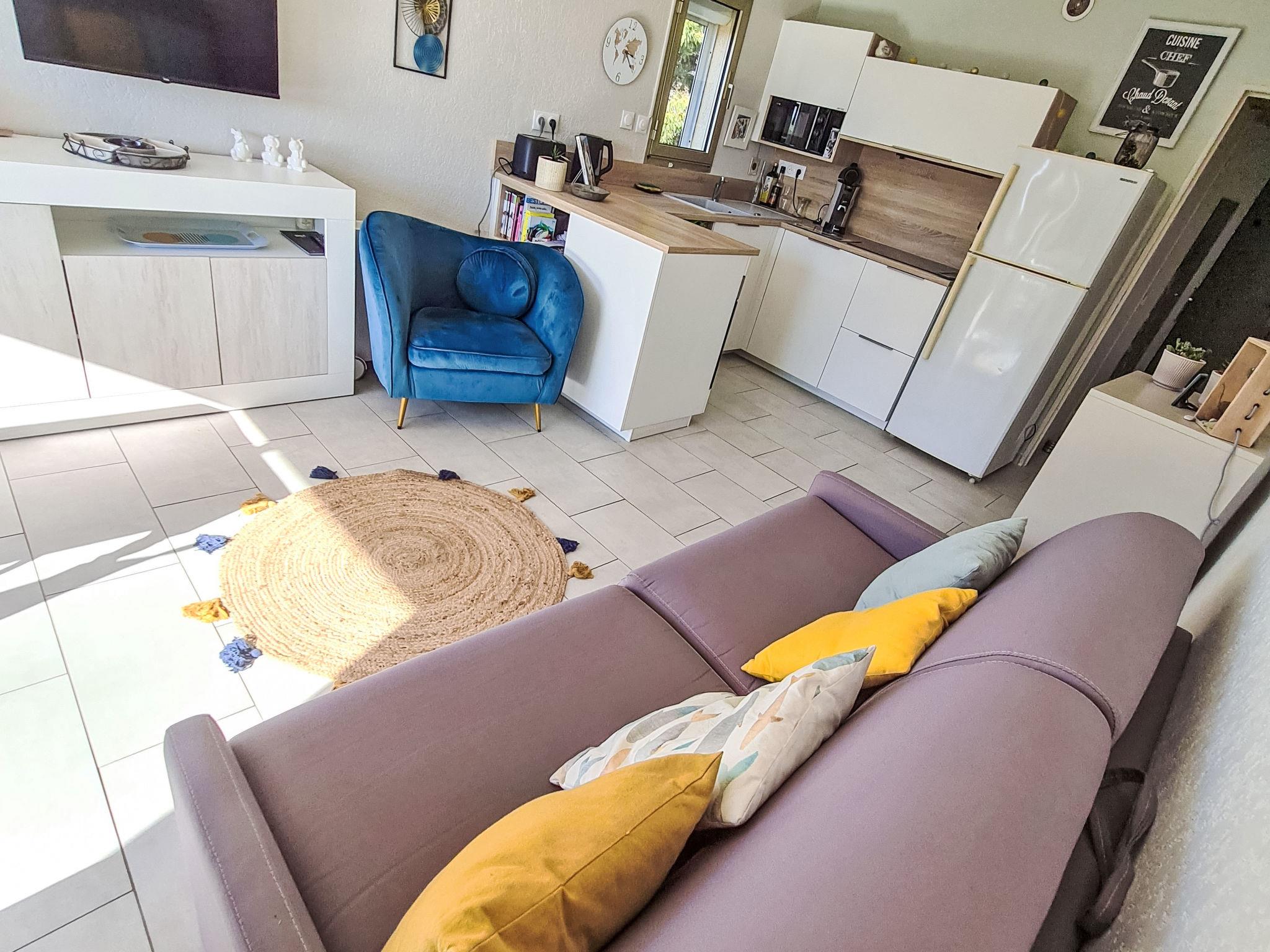 2-room apartment 35 m2. Comfortable furnishings: living/dining room with 1 double sofabed (140 cm, length 190 cm), TV (flat screen). Exit to the loggia. 1 room with 1 french bed (140 cm, length 190 cm), fan. Kitchenette (oven, dishwasher, 2 ceramic glass hob hotplates, toaster, kettle, microwave, electric coffee machine, Capsules for coffee machine (SENSEO) extra). Shower/WC. Electric heating. Terrace 9 m2, roofed. Terrace furniture. Partial view of the sea. Facilities: Internet (WiFi, extra). Parking. Please note: TV only FR. Smoke alarm. Offer by a private individual according to Art. 155, IV of CGI.