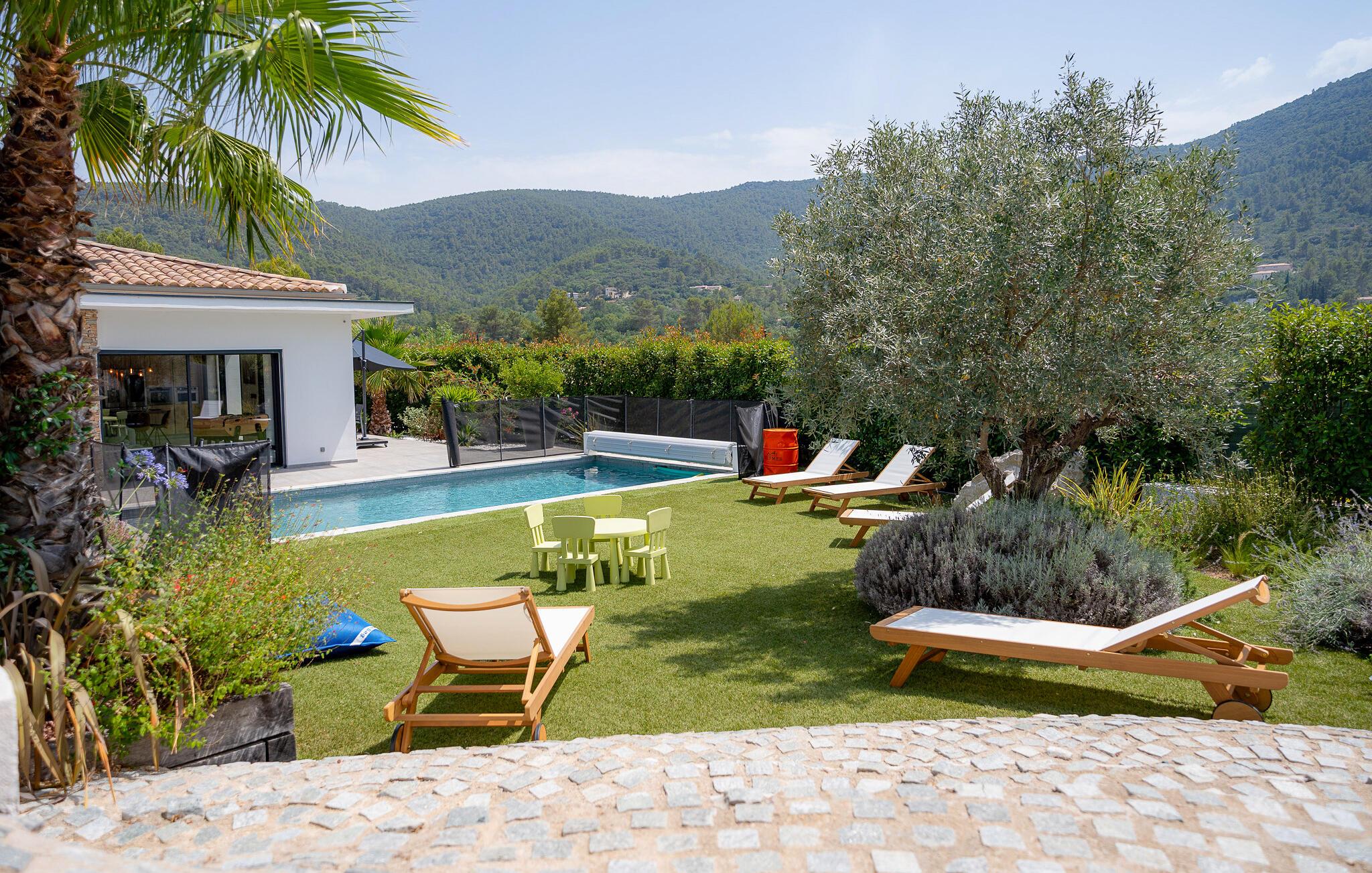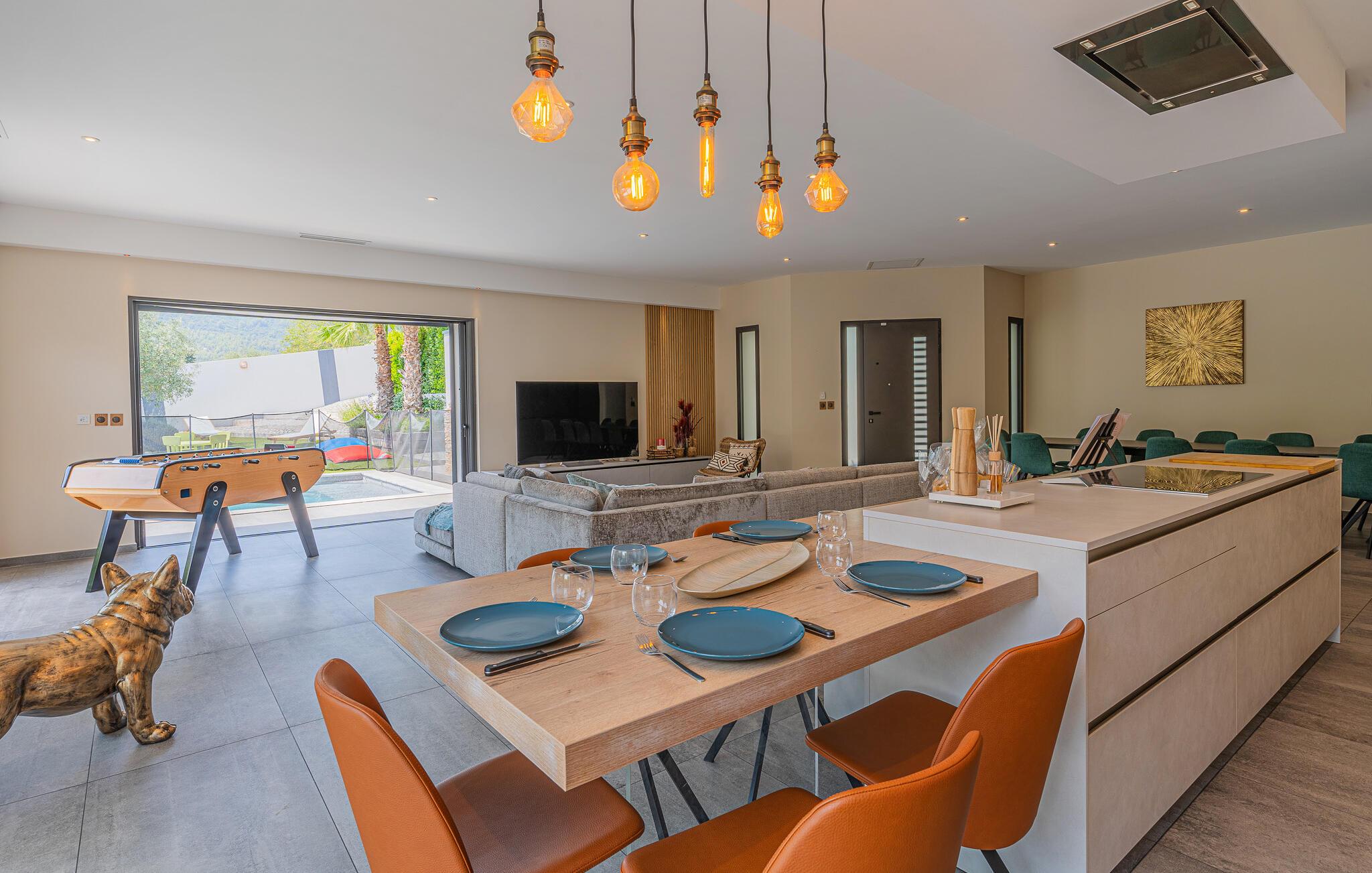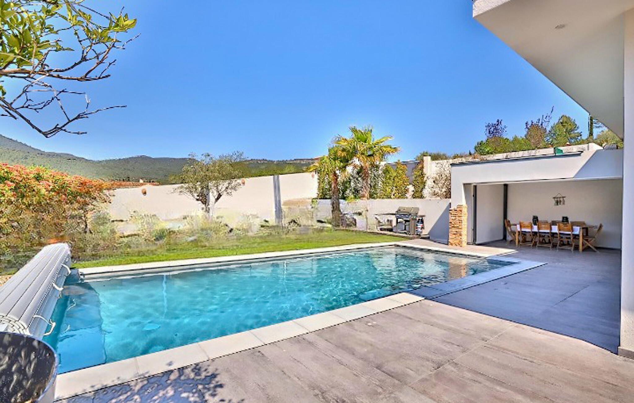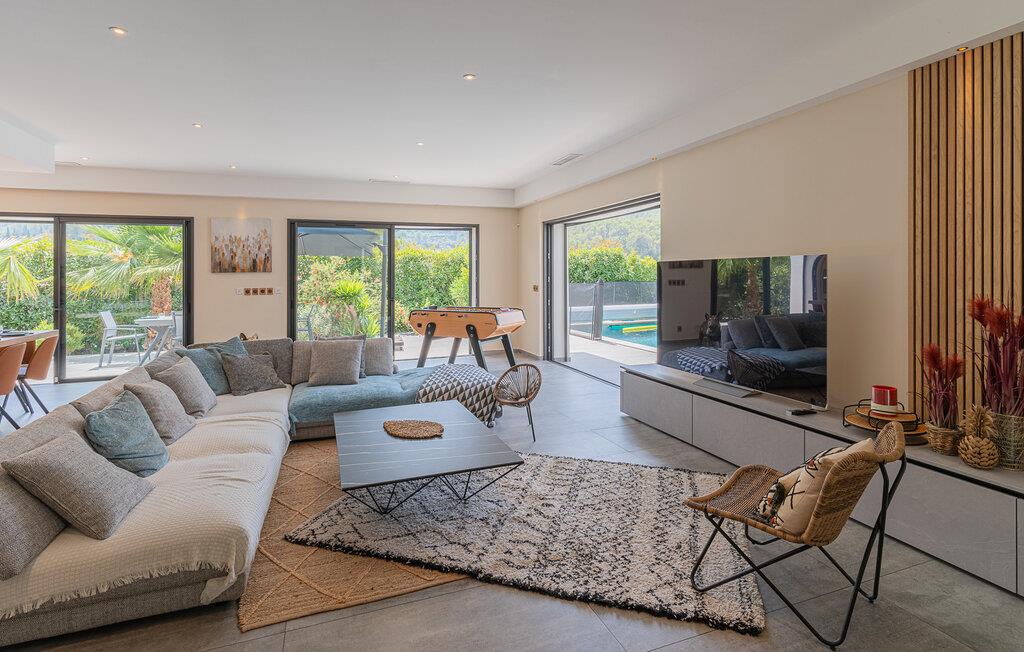 Dette rummelige og moderne feriehus i Solliès-Toucas byder jer og jeres familie velkommen til et komfortabelt tilflugtssted. Den åbne stue er noget særligt med sin smagfulde indretning og lyse atmosfære. Slap af i sofaen, tilbered lækre måltider sammen i det store køkken, eller nyd hyggelige timer med bordfodbold og afslapning i whirlpool-badekarret. Udendørs finder I flere terrasser og en pool, som giver mulighed for solrige og afslappende badedage.