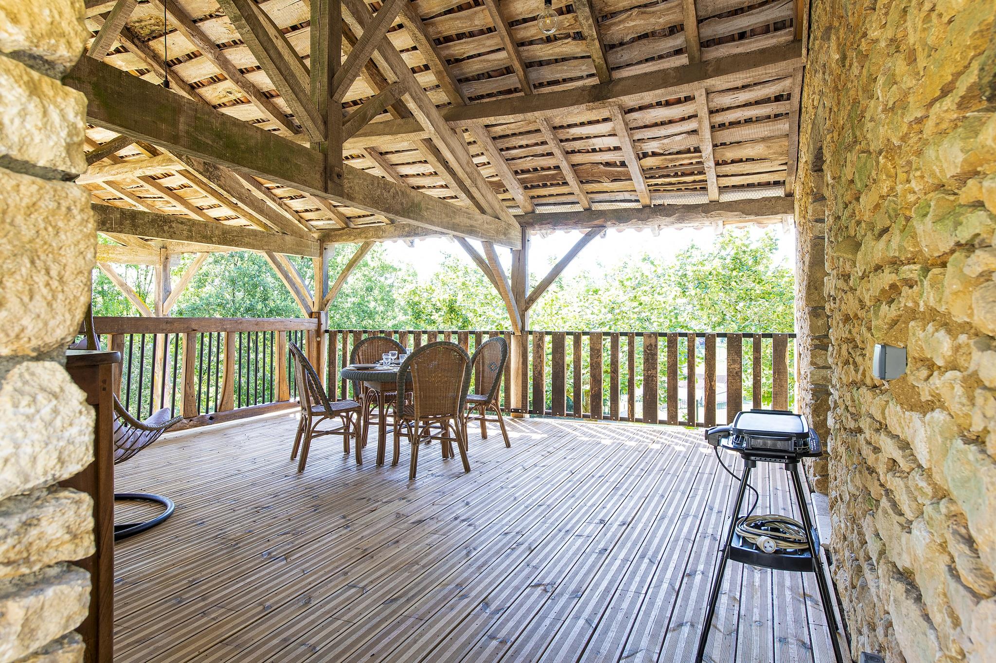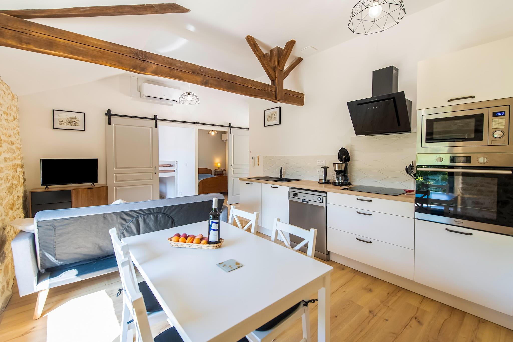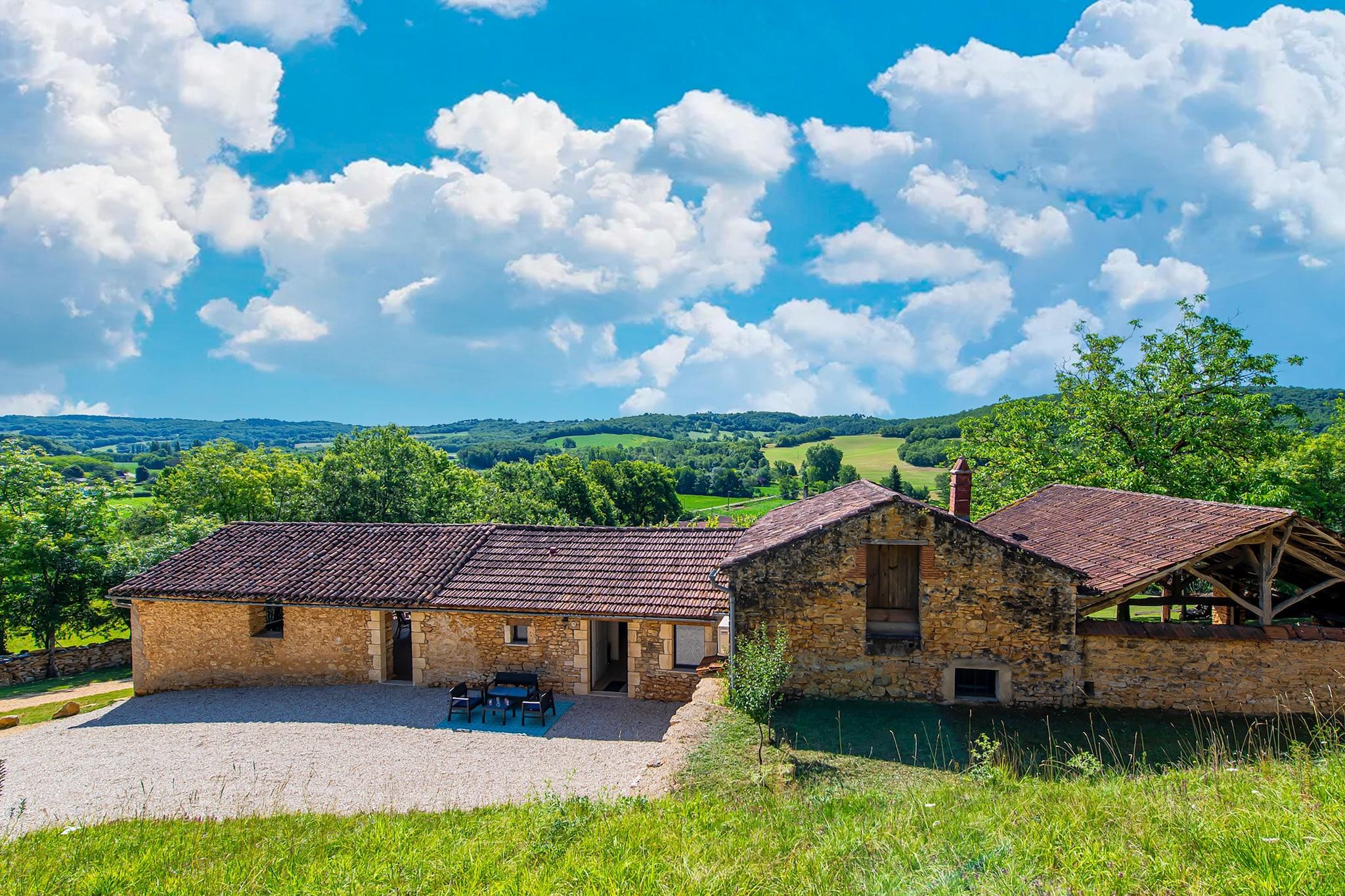 Dette stenhus i Soturac har et elegant interiør og kan rumme en familie med børn (4 personer). Udenfor finder du en overdækket terrasse med udsigt over omgivelserne og en privat overjordisk swimmingpool.Sommerhuset ligger i tilknytning til en anden bolig, men du har dit private rum uden at møde andre lejere. Nyd en dejlig gåtur i omgivelserne eller besøg nærliggende byer såsom Condezaygues, Montcabrier og Prayssac.Den hyggelige restaurant ""Les Bons Enfants"" ligger 3,6 km fra overnatningsstedet. Feriehuset er smagfuldt indrettet. Du har en stue med åbent køkken som giver dig mulighed for at tilberede alle dine måltider Der er 2 skønne soveværelser og badeværelse Hele huset er renoveret med et udvalg af kvalitetsmaterialer. Netflix og Amazon Prime er tilgængelige og giver underholdning for unge og gamle. Swimmingpool åben fra midten af maj til midten af september.