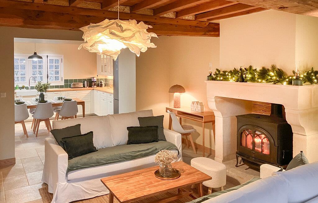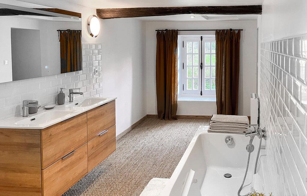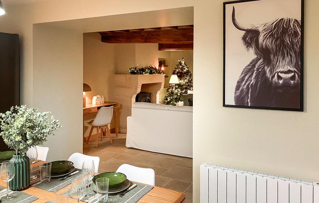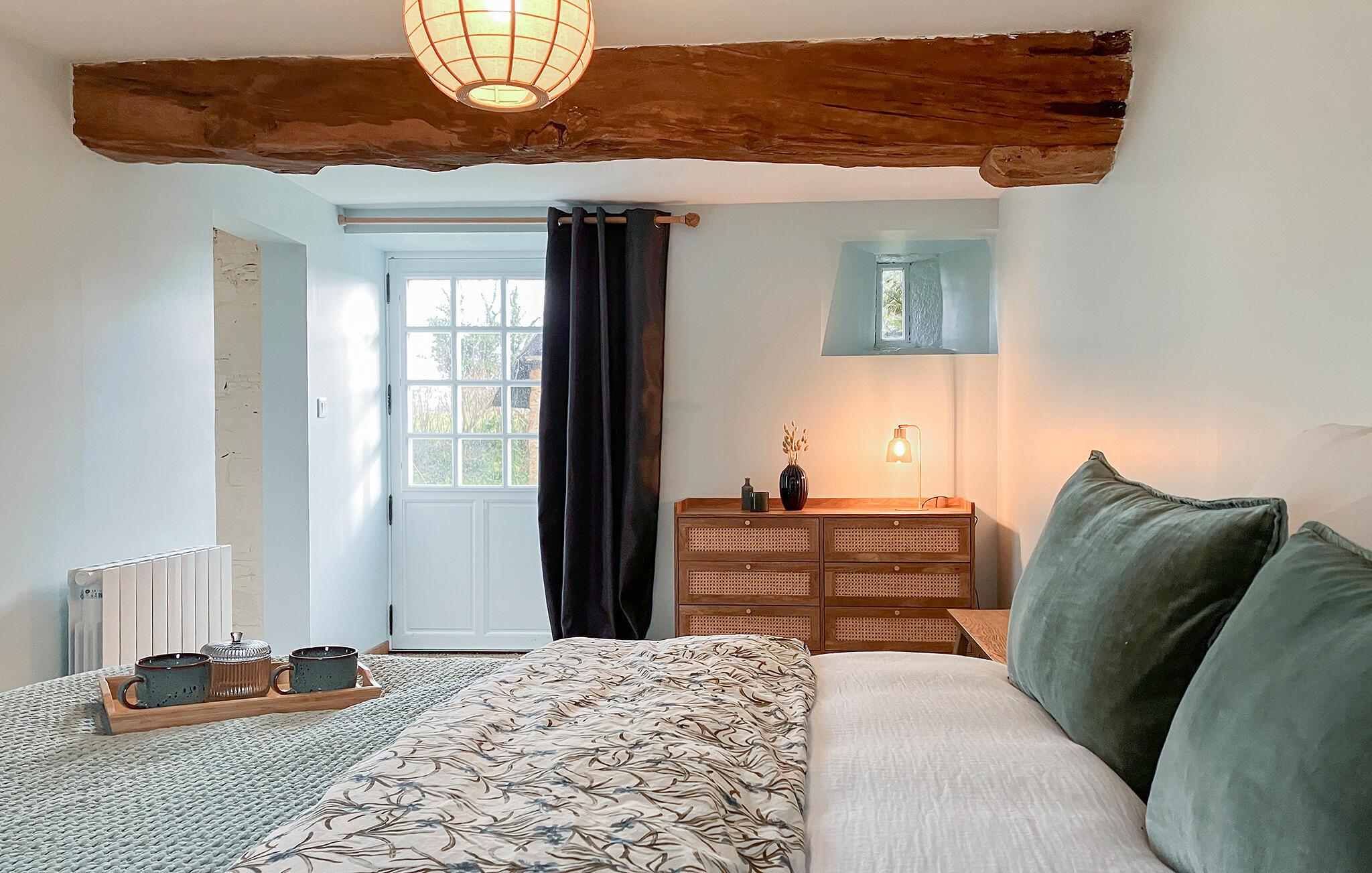 Charmé, ro og opdagelse forenes i dette feriehus for et autentisk ophold i harmoni med årstiderne – beliggende mellem landlig idyl og Normandiets kyst. Omgivet af frodigt grønt tilbyder huset de ideelle rammer for en afslappende ferie. Træbjælker, sarte farver og komfortable møbler skaber en atmosfære, hvor I hurtigt vil føle jer hjemme. Når dagene bliver køligere, inviterer stuen med sin smukke brændeovn jer til hyggelige timer med afslapning.