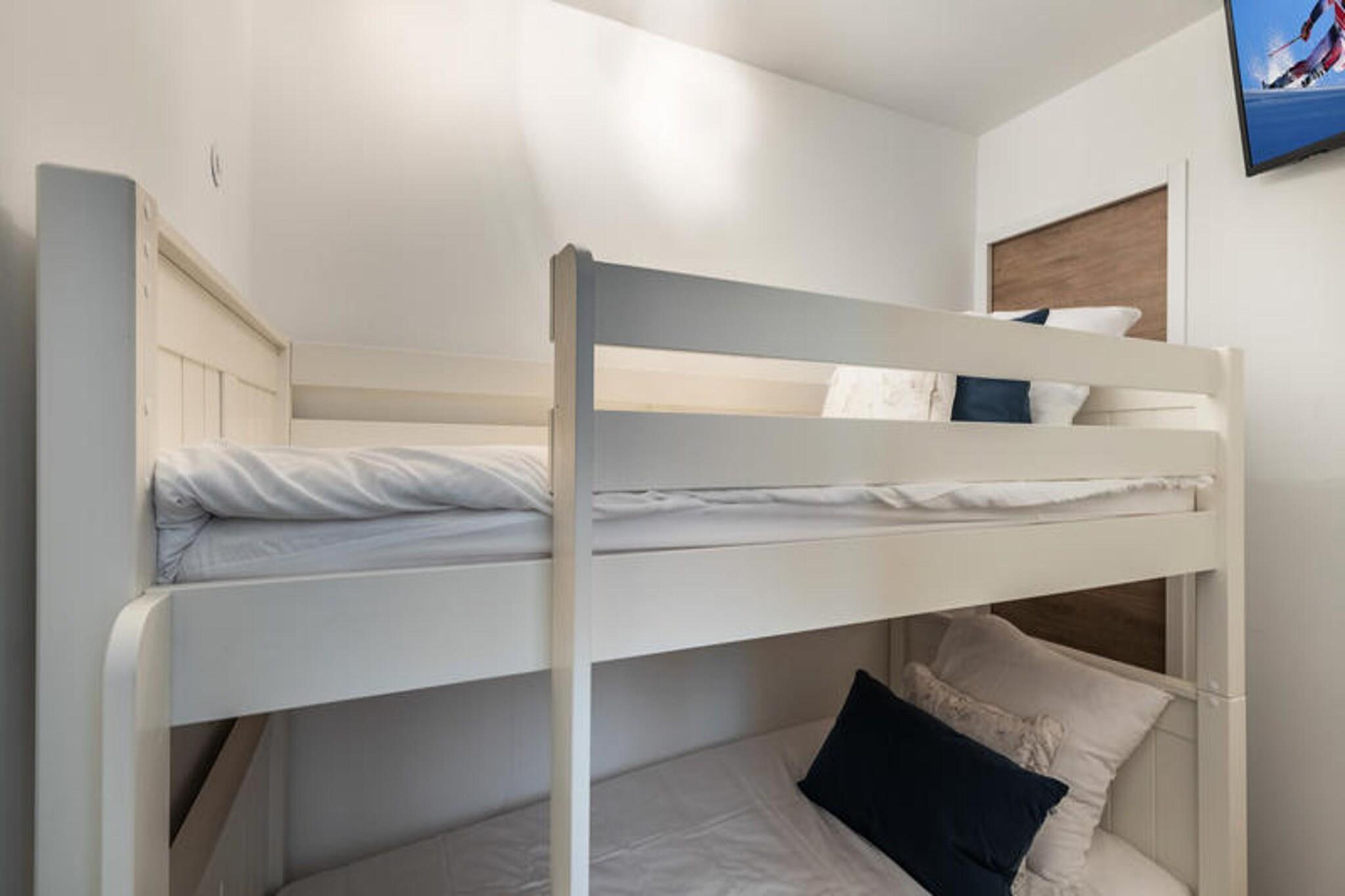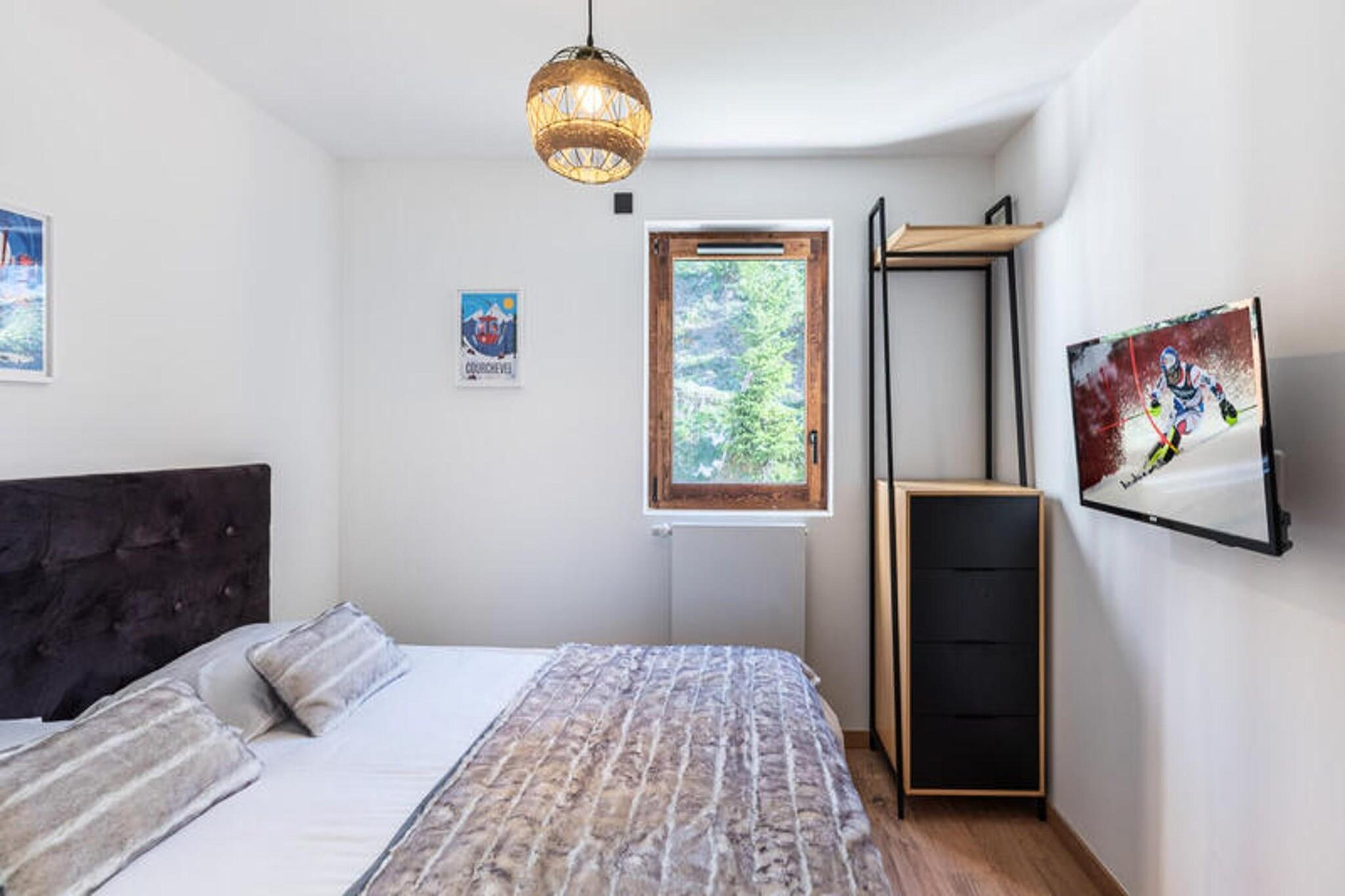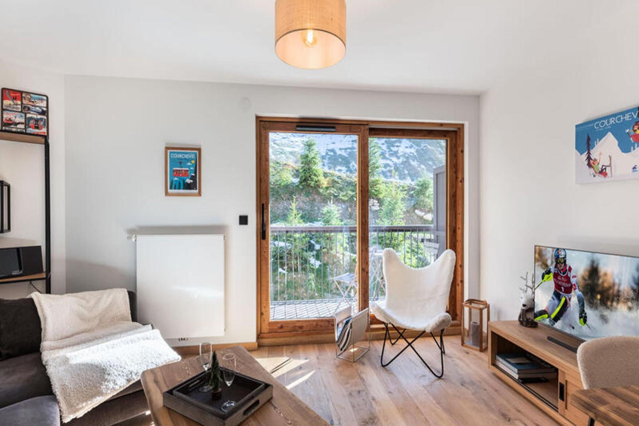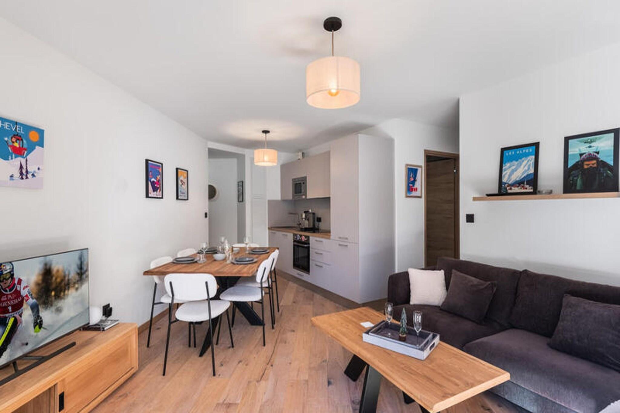 Denne moderne 2-værelses hyttelejlighed tilbyder et behageligt ophold for op til 2 voksne og 2 børn. Indkvarteringen omfatter en rummelig stue med sofa, tv og spisebord. Lejligheden er kæledyrsfri og ikke-ryger, hvilket giver et fredeligt miljø for dit ophold. Soveværelset har en dobbeltseng (160x200) med et ekstra sæt køjesenge (80x185) i kabineområdet. Wi-Fi er tilgængeligt, men bemærk venligst, at mobilnetværksmodtagelsen er begrænset i boligen. For din bekvemmelighed er sengetøj og håndklæder leveret, med sengene redt ved din ankomst. Regelmæssig rengøring er inkluderet to gange om ugen. Beliggende kun 340 meter fra pisterne, er lejligheden perfekt placeret for skientusiaster. Det livlige Moriond-område i Courchevel, med dets butikker, caféer og faciliteter, ligger kun få minutter væk, og giver dig nem adgang til lokale markeder, restauranter og andre attraktioner. Uanset om du søger afterski-afslapning eller udforske de nærliggende stier, er alt inden for rækkevidde. Lejligheden er veludstyret med et fuldt fungerende køkken med moderne apparater som ovn, mikroovn, opvaskemaskine, induktionskomfur og kaffemaskine. Yderligere faciliteter omfatter et rummeligt brusebadeværelse med dobbelt håndvask, en håndklædetørrer, en vaskemaskine-tørretumbler for din bekvemmelighed og et uafhængigt toilet. Ejendommen omfatter også et skiskab i stueetagen og en parkeringsplads for ekstra bekvemmelighed.