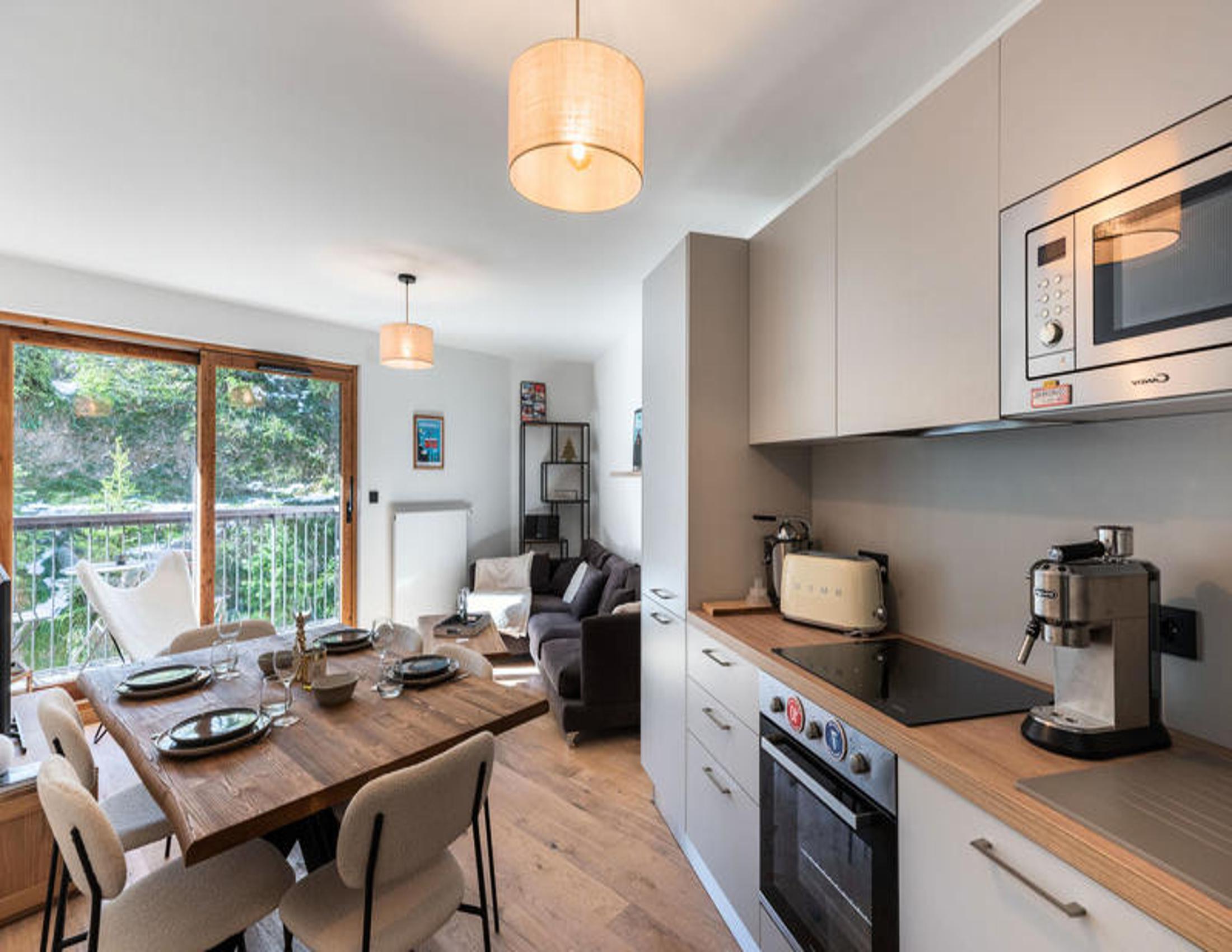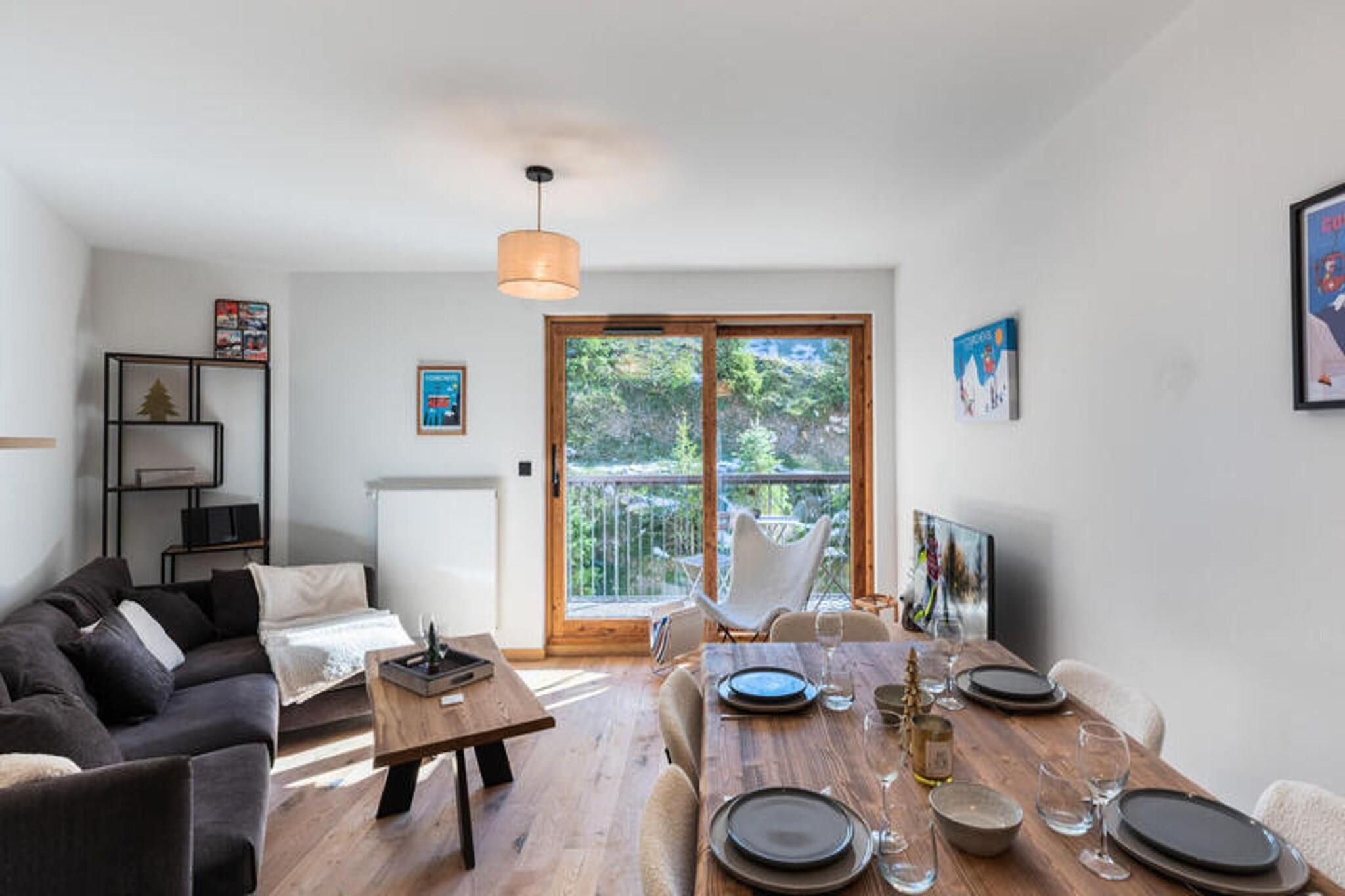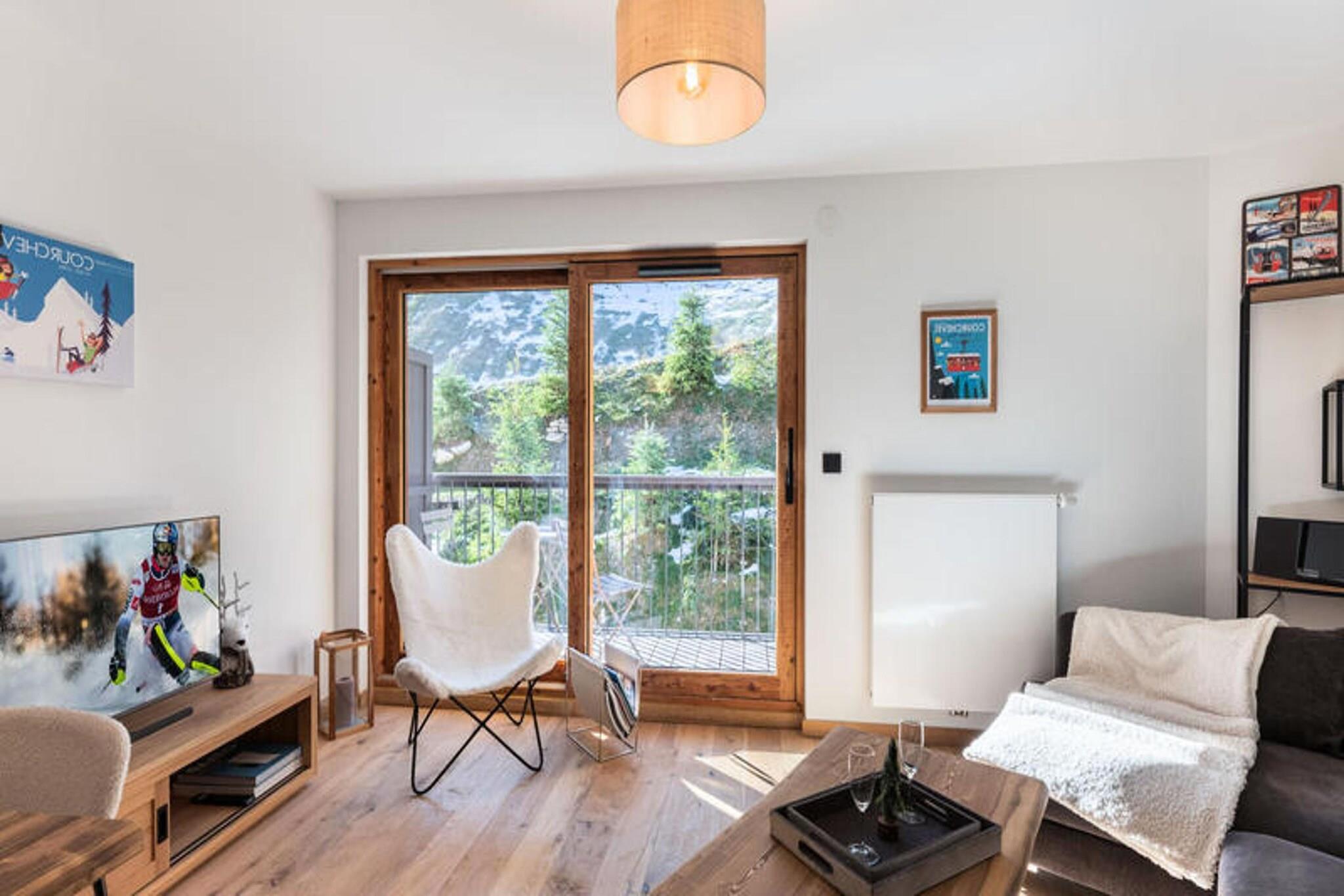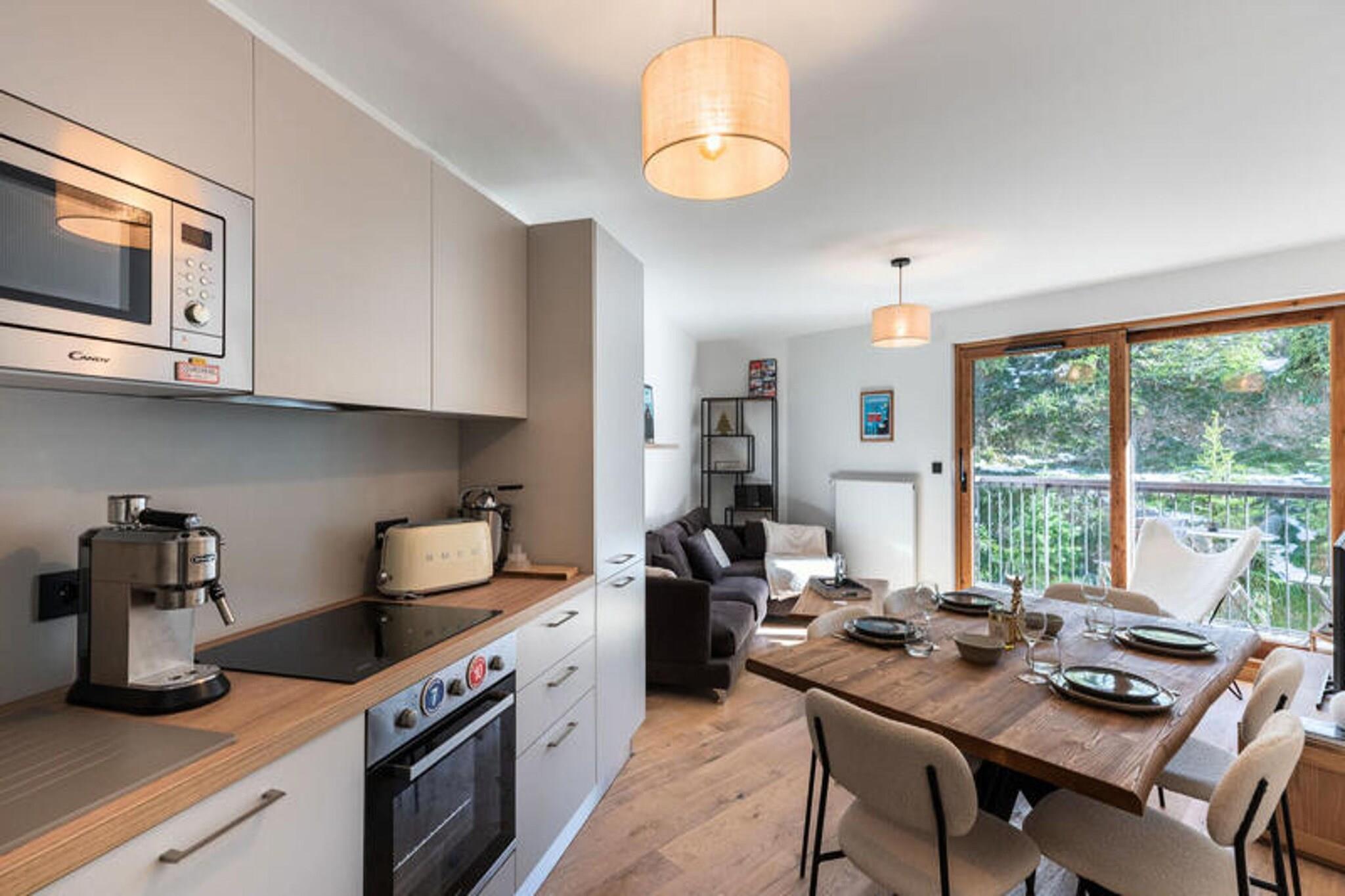 Denne moderne 2-værelses hyttelejlighed tilbyder et behageligt ophold for op til 2 voksne og 2 børn. Indkvarteringen omfatter en rummelig stue med sofa, tv og spisebord. Lejligheden er kæledyrsfri og ikke-ryger, hvilket giver et fredeligt miljø for dit ophold. Soveværelset har en dobbeltseng (160x200) med et ekstra sæt køjesenge (80x185) i kabineområdet. Wi-Fi er tilgængeligt, men bemærk venligst, at mobilnetværksmodtagelsen er begrænset i boligen. For din bekvemmelighed er sengetøj og håndklæder leveret, med sengene redt ved din ankomst. Regelmæssig rengøring er inkluderet to gange om ugen. Beliggende kun 340 meter fra pisterne, er lejligheden perfekt placeret for skientusiaster. Det livlige Moriond-område i Courchevel, med dets butikker, caféer og faciliteter, ligger kun få minutter væk, og giver dig nem adgang til lokale markeder, restauranter og andre attraktioner. Uanset om du søger afterski-afslapning eller udforske de nærliggende stier, er alt inden for rækkevidde. Lejligheden er veludstyret med et fuldt fungerende køkken med moderne apparater som ovn, mikroovn, opvaskemaskine, induktionskomfur og kaffemaskine. Yderligere faciliteter omfatter et rummeligt brusebadeværelse med dobbelt håndvask, en håndklædetørrer, en vaskemaskine-tørretumbler for din bekvemmelighed og et uafhængigt toilet. Ejendommen omfatter også et skiskab i stueetagen og en parkeringsplads for ekstra bekvemmelighed.