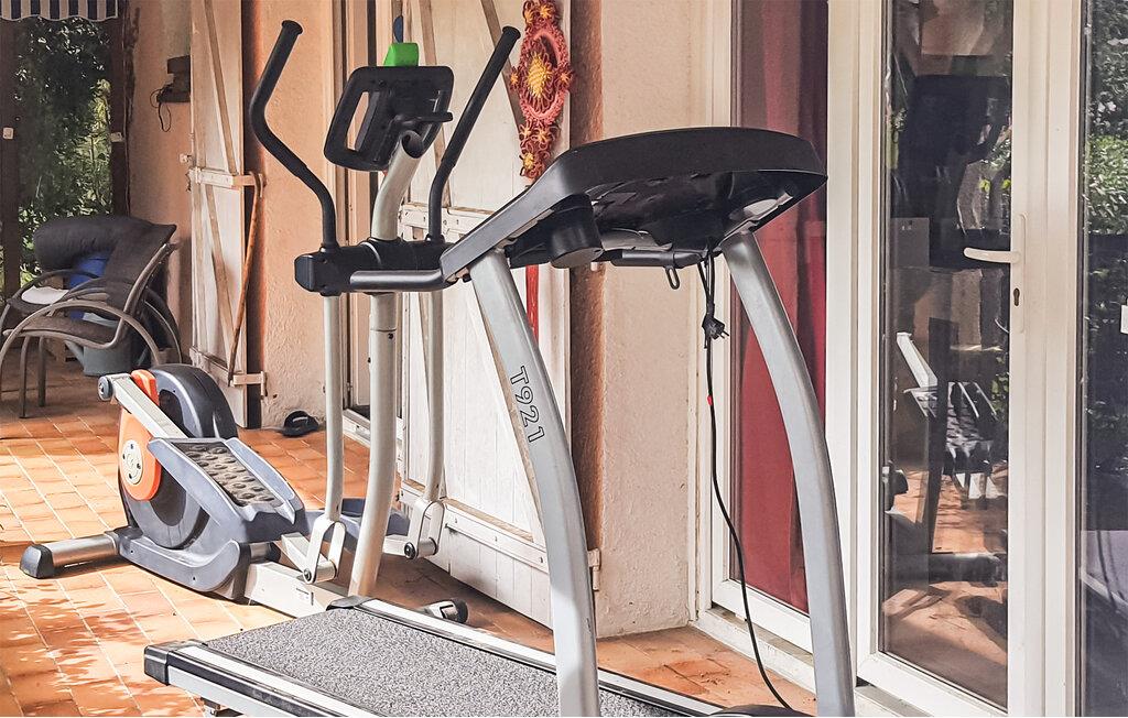 Husets indre er lige så indbydende. Gør det behageligt i den hyggelige stue på sofaerne og afslut dagen med en god bog. For de aktive byder huset også på et fitnessområde med et løbebånd, en motionscykel og et bordtennisbord.