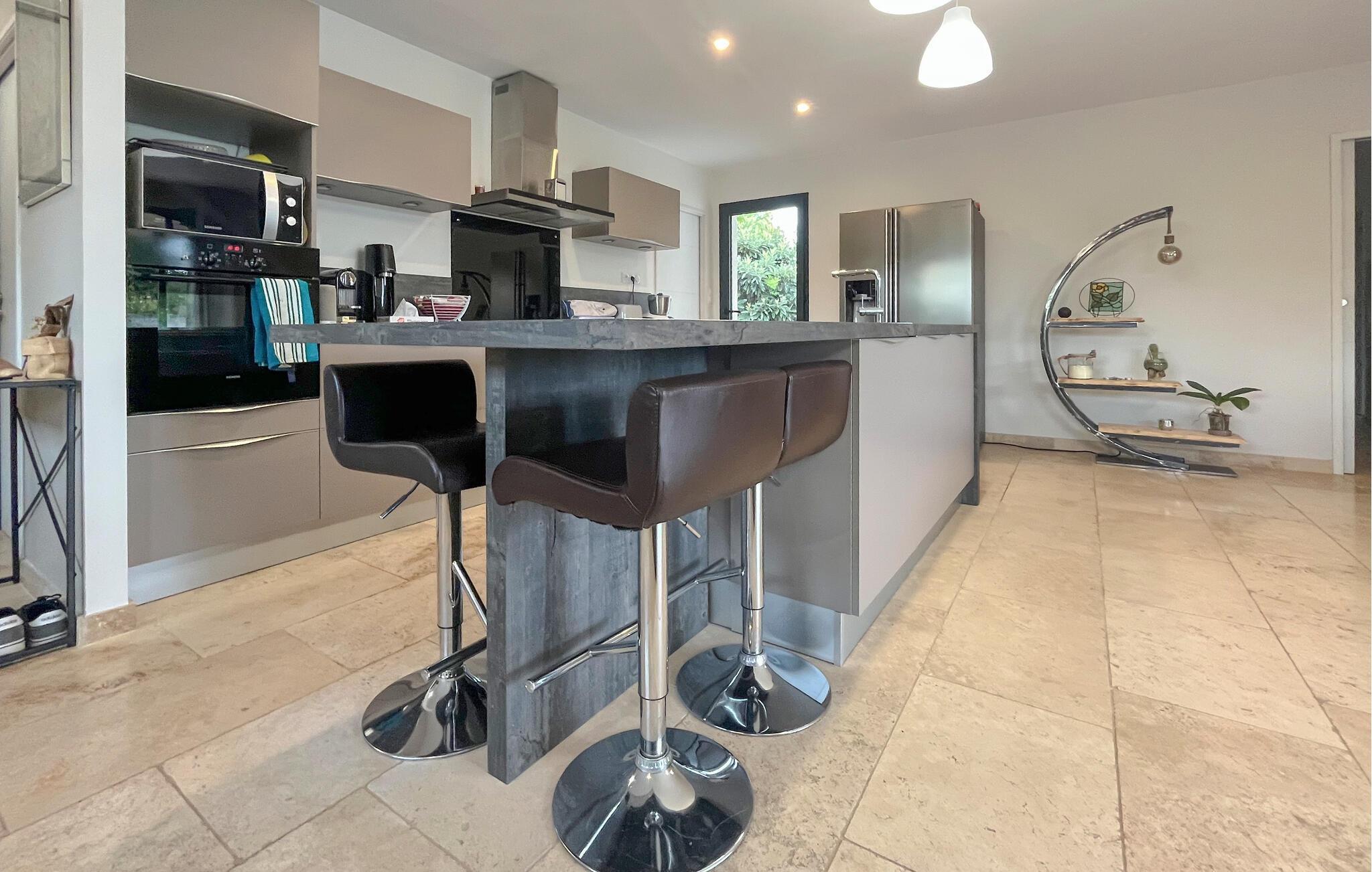 Tilbring en afslappende ferie i dette komfortable hjem, der tilbyder masser af plads til fælles tid og afslappende øjeblikke. Gør det behageligt i de komfortable sofaer i det åbne opholdsområde, hvor de store vinduer tilbyder udsigt over poolen. Tilbered jeres måltider i det moderne køkken med en køkkenø og nyd dem ved det stilfulde spisebord.