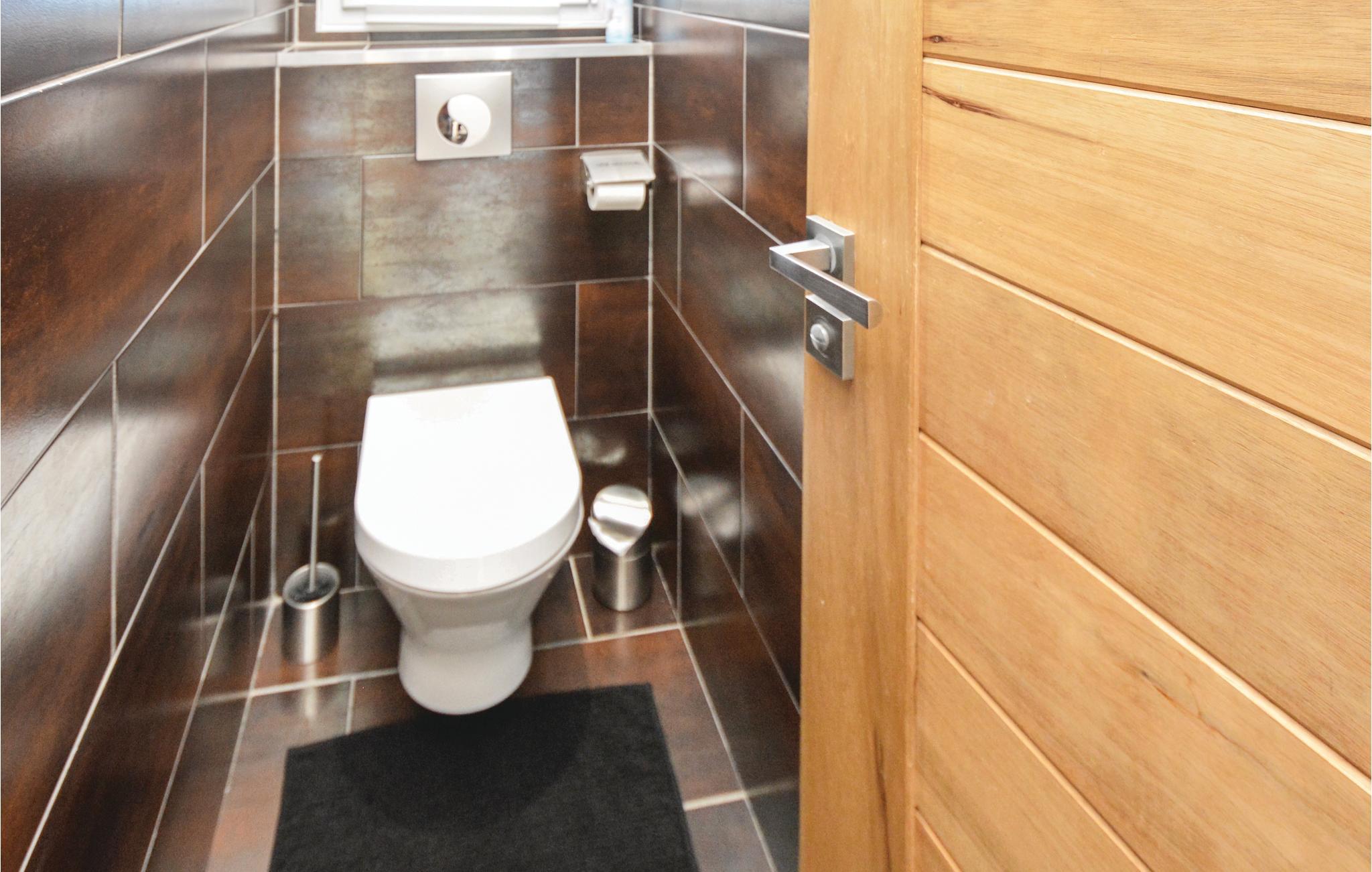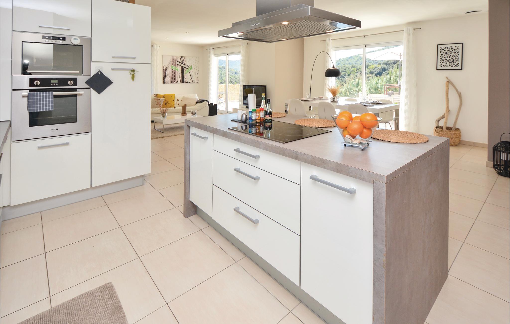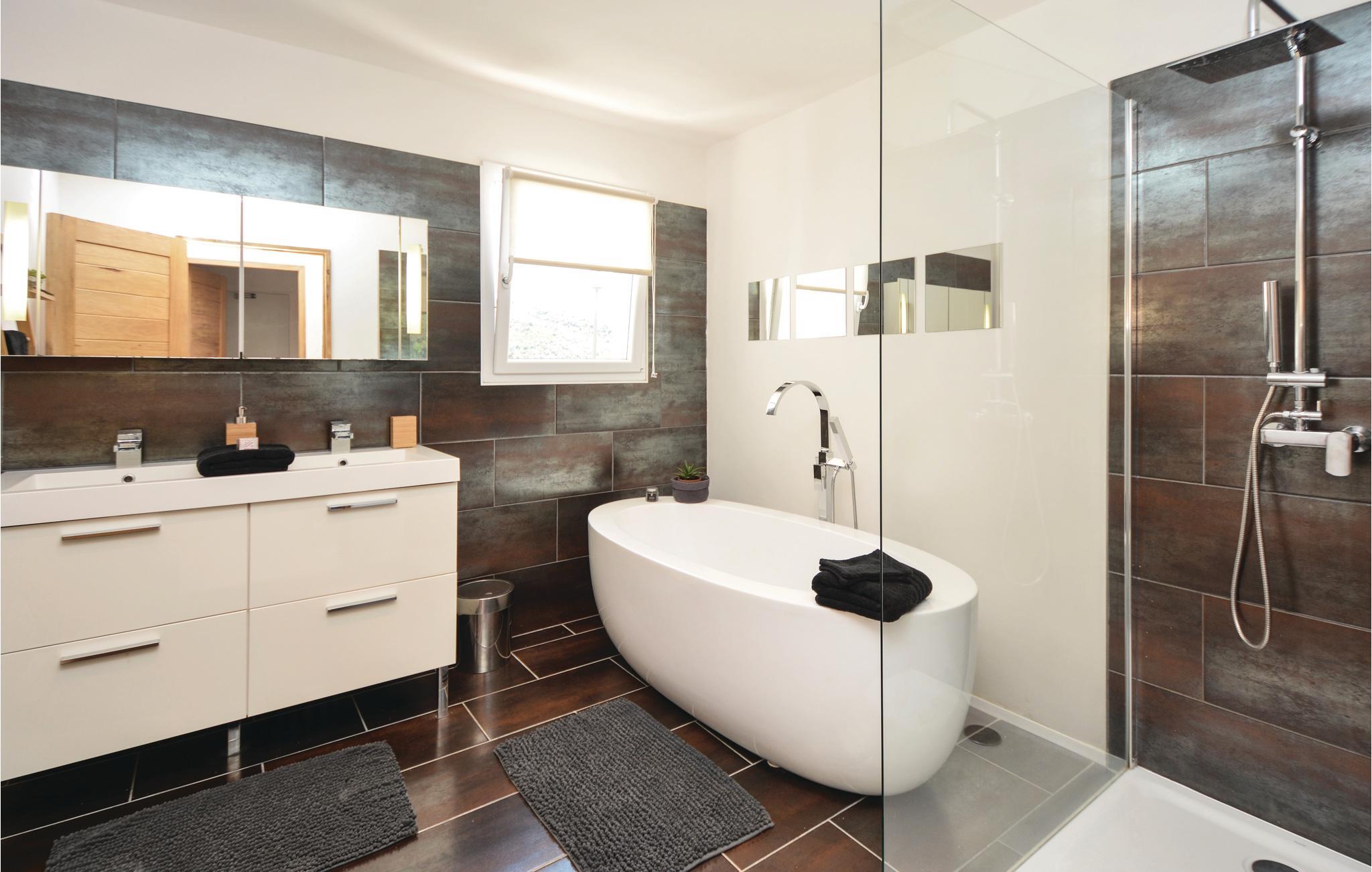 Ud over et ultramoderne køkken med kogeø, som ligger i åben forbindelse med stuen, rummer dette smagfuldt indrettede hus også et badeværelse med både badekar og brusebad.