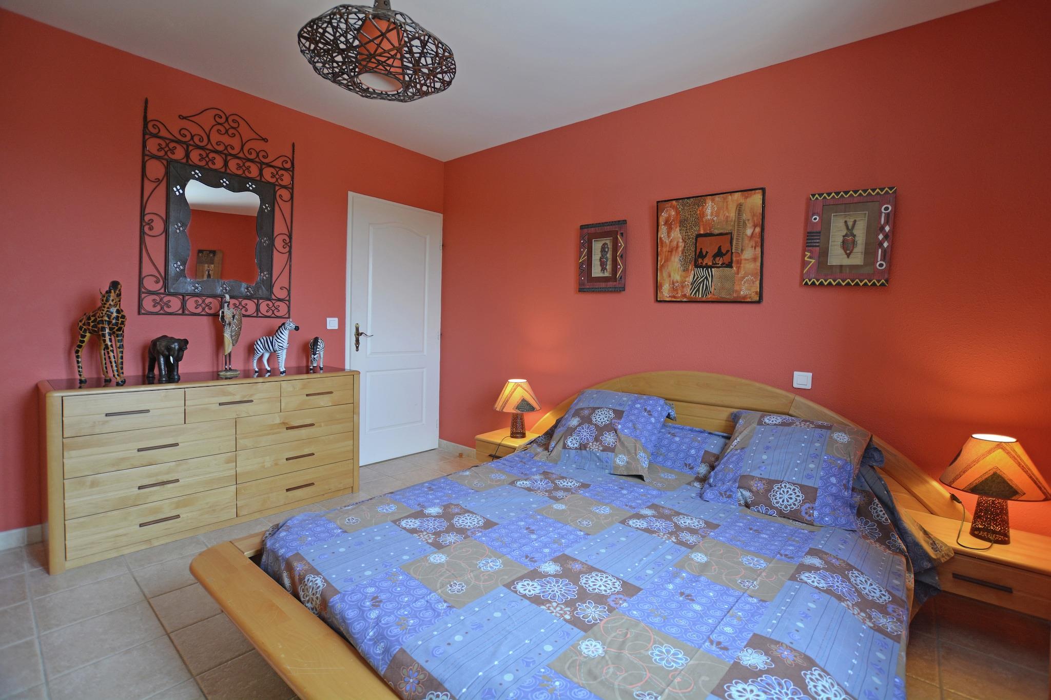 Mellemetage: (soveværelse(dobbeltseng(160 x 190 cm)), soveværelse(dobbeltseng(140 x 190 cm)), soveværelse(2x enkeltseng(70 x 190 cm)), badeværelse(badekar, bruser, 2x håndvask), pulterkammer) På 1. etage: (Stue(Fjernsyn, DVD-afspiller, klimaanlæg), Køkken(ovn, mikrobølgeovn, opvaskemaskine )) garage, garage, vaskemaskine, varme(elektrisk), terrasse(overdækket), have(indhegnet), havemøbler, swimmingpool(privat, 7 x 4 m., opened from 1/2 May upto and including 1/2 Oct), petanquebane