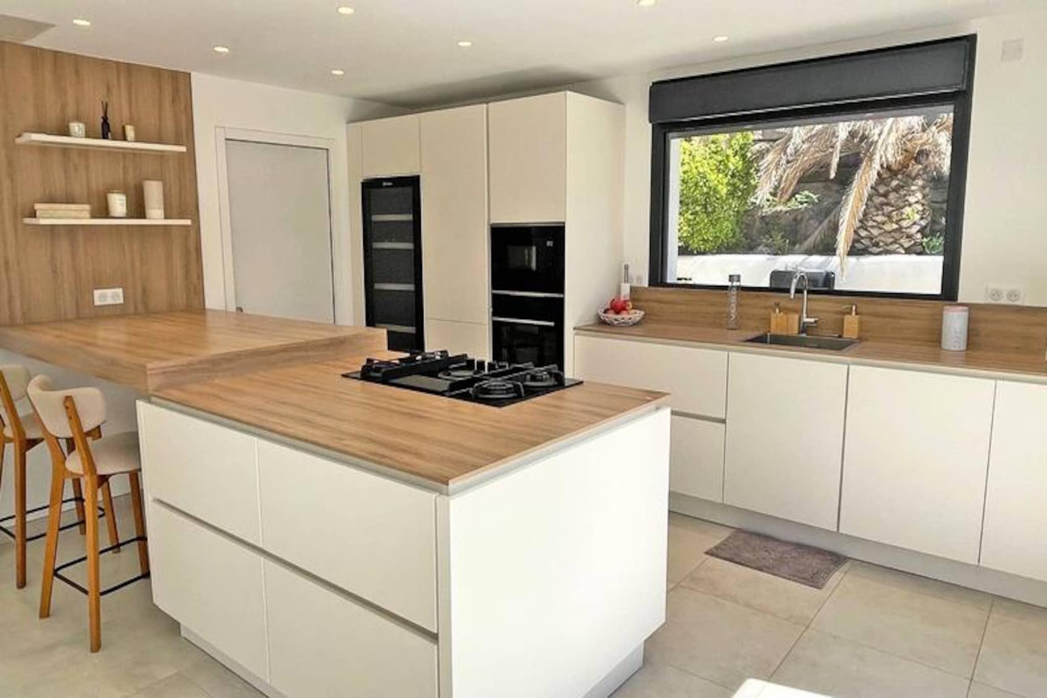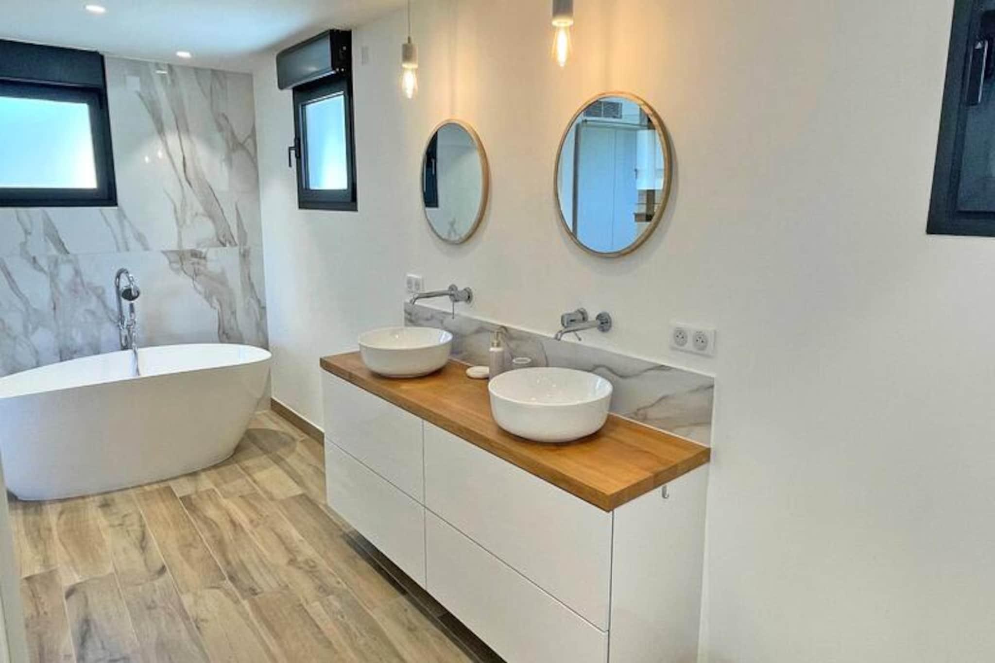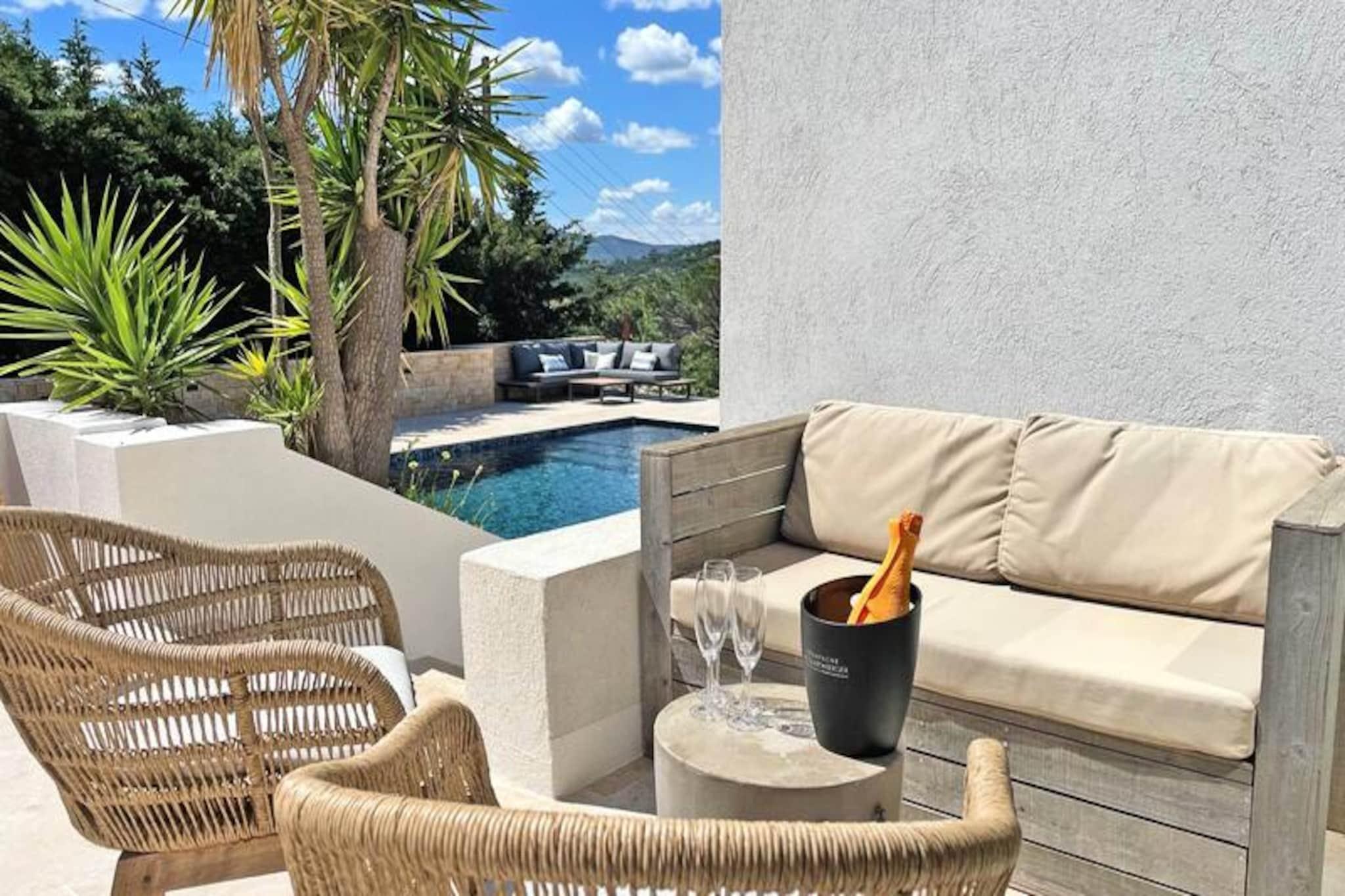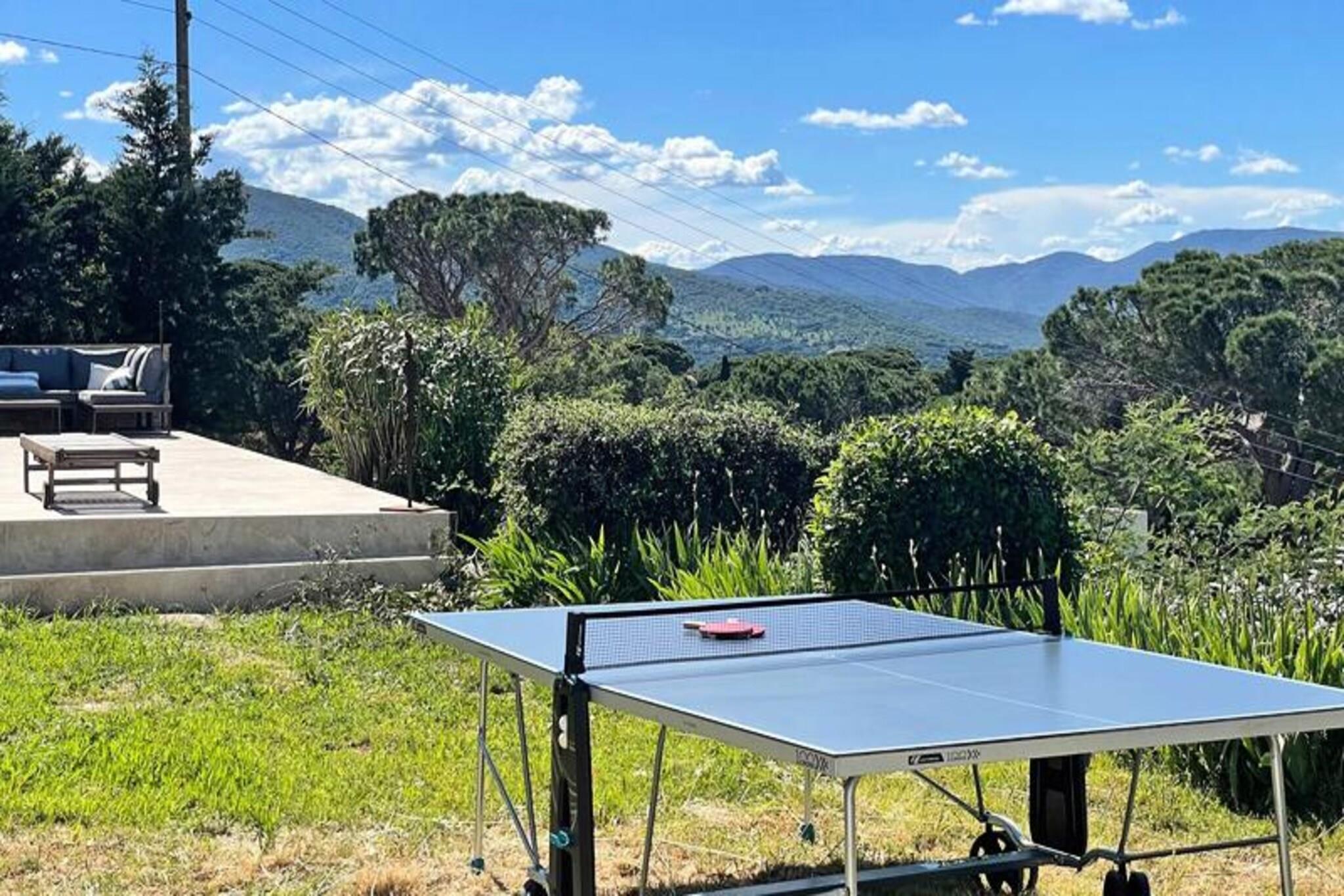 Denne fantastiske 6-værelses villa, beliggende på en lukket 1760m² grund, tilbyder et luksuriøst ophold for op til 10 gæster. Den rummelige stue er opdelt i tre områder: en komfortabel lounge med et storskærms-tv og hjemmebiograf, en spiseplads og et moderne amerikansk køkken fuldt udstyret med køleskab, fryser, semi-professionel gaskomfur, ovn, mikroovn, opvaskemaskine og Nespresso kaffemaskine. Stueetagen indeholder også et vaskerum med vaskemaskine og tørretumbler samt separat toilet. Mastersuiten på det nederste niveau har en kingsize seng, en-suite badeværelse med bruseniche, badekar og dobbelt håndvask og direkte adgang til terrasserne. Ovenpå tilbyder to soveværelser med aircondition hver en dobbeltseng og en-suite badeværelser - det ene med brusekabine og det andet med badekar. For ekstra privatliv omfatter villaen en selvstændig lejlighed med et fjerde soveværelse med aircondition, en separat stue med en sovesofa, et badeværelse med bruser og et lille tekøkken med mikrobølgeovn og kaffemaskine. Dette gør det til et ideelt valg for familier eller grupper, der leder efter både samvær og privatliv. Udenfor kan villaen prale af smukke terrasser med spiseplads, afslapningssteder og en privat 5x10m swimmingpool, som kan opvarmes mod et ekstra gebyr. Haven har liggestole, parasoller og en gasgrill, hvilket skaber et perfekt sted til udendørs spisning og afslapning. Villaen tilbyder også aircondition overalt, Wi-Fi, et bordtennisbord og parkering til to køretøjer sikret af en elektrisk port. Kæledyr er velkomne efter anmodning mod et mindre tillægsgebyr.