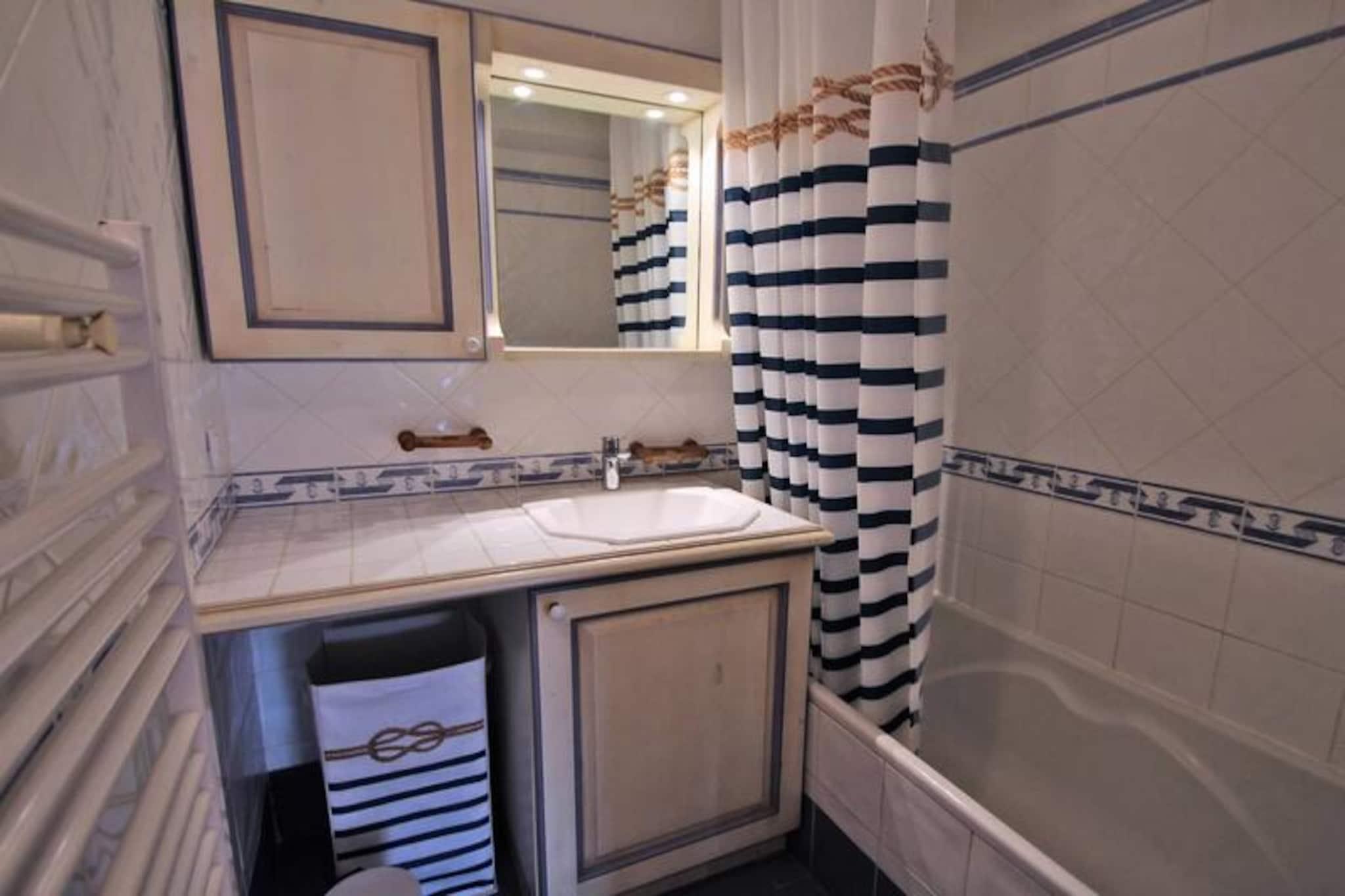 Denne rummelige 67 m², 4-værelses lejlighed er perfekt til familier eller grupper på op til 6 personer, og tilbyder tre velindrettede soveværelser og en stor 25 m² terrasse med en fantastisk udsigt over Préconil og Sainte-Maxime-broen. Lejligheden ligger på 1. sal i en bolig med elevator og byder på fremragende faciliteter og en fantastisk planløsning. Stuen har en komfortabel sofa, lænestole, et fladskærms-tv og en spiseplads med bord og stole. Det veludstyrede åbne køkken har køleskab, fryser, kogeplader, ovn, opvaskemaskine, kaffemaskine, brødrister og mere, hvilket gør det ideelt til at tilberede måltider. Mastersuiten byder på en dobbeltseng (160 cm), rigelig skabsplads og et privat badeværelse med bruser, vaskeskab og ekstra skabe. Det andet soveværelse er indrettet med to enkeltsenge på 80 cm og skabe, mens det tredje soveværelse indeholder 80 cm køjesenge med skabe. Badeværelset har badekar og vaskeskab. Gæsterne vil nyde den store terrasse, perfekt til udendørs spisning eller afslapning med dens uhindrede udsigt over floden og havet. Yderligere faciliteter inkluderer aircondition i hele lejligheden, lomme-WiFi og en privat parkeringsplads, der ligger 300 meter væk i en anden bolig. Swimmingpoolen er tilgængelig for sæsonen, lukket fra oktober til maj, og boligen er bekvemt placeret kun 400 meter fra byens centrum, 300 meter fra stranden og 100 meter fra butikker. Ejendommen tilbyder en fredelig, men central beliggenhed, hvilket gør det til et ideelt valg for en afslappende ferie.