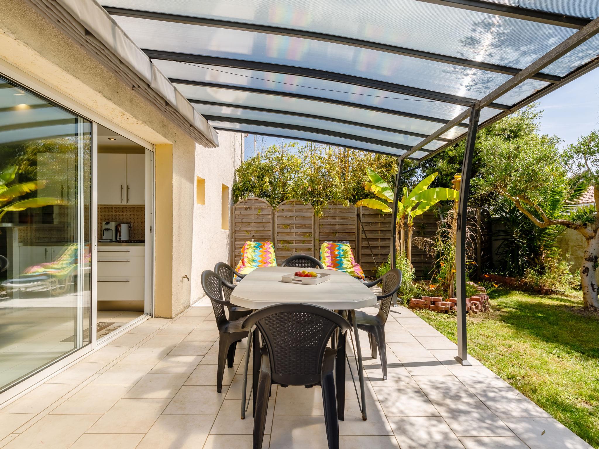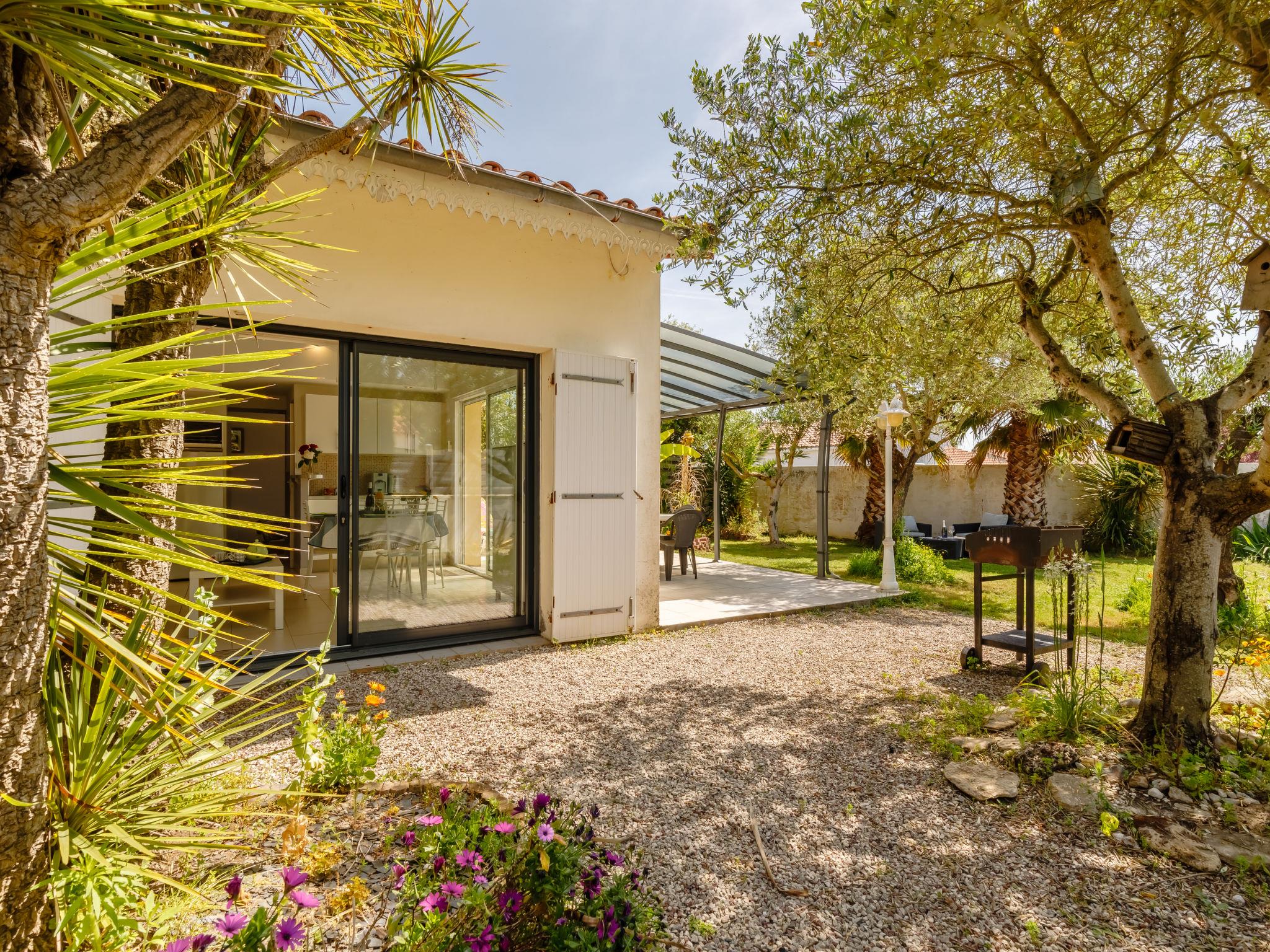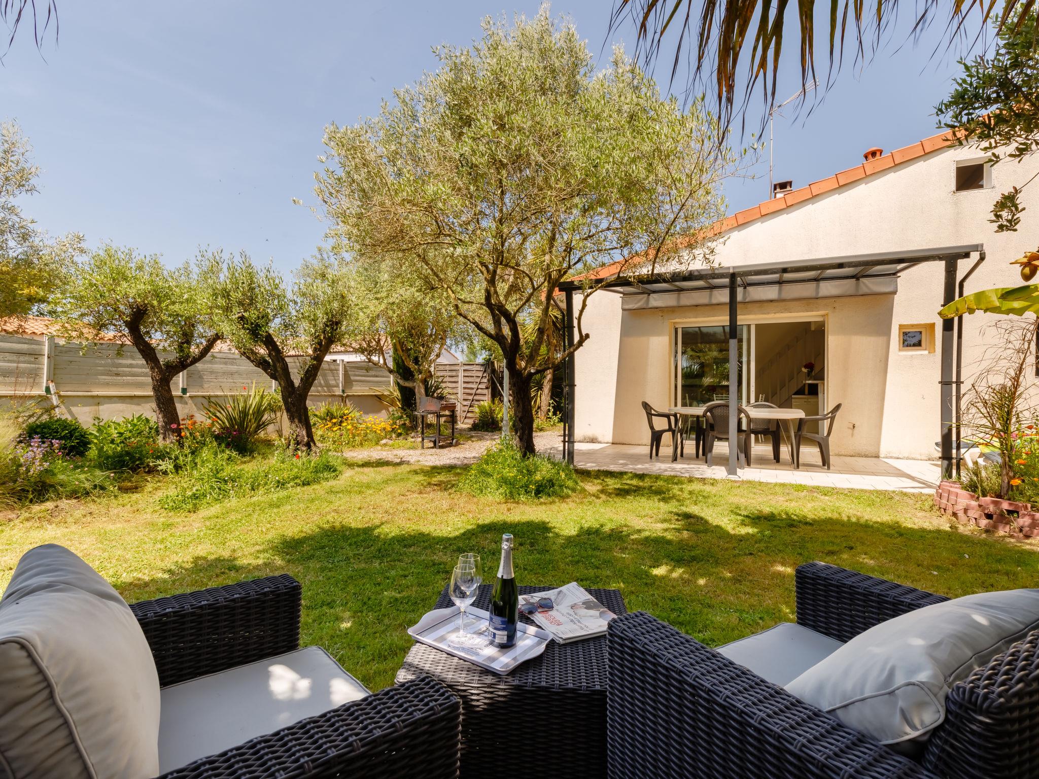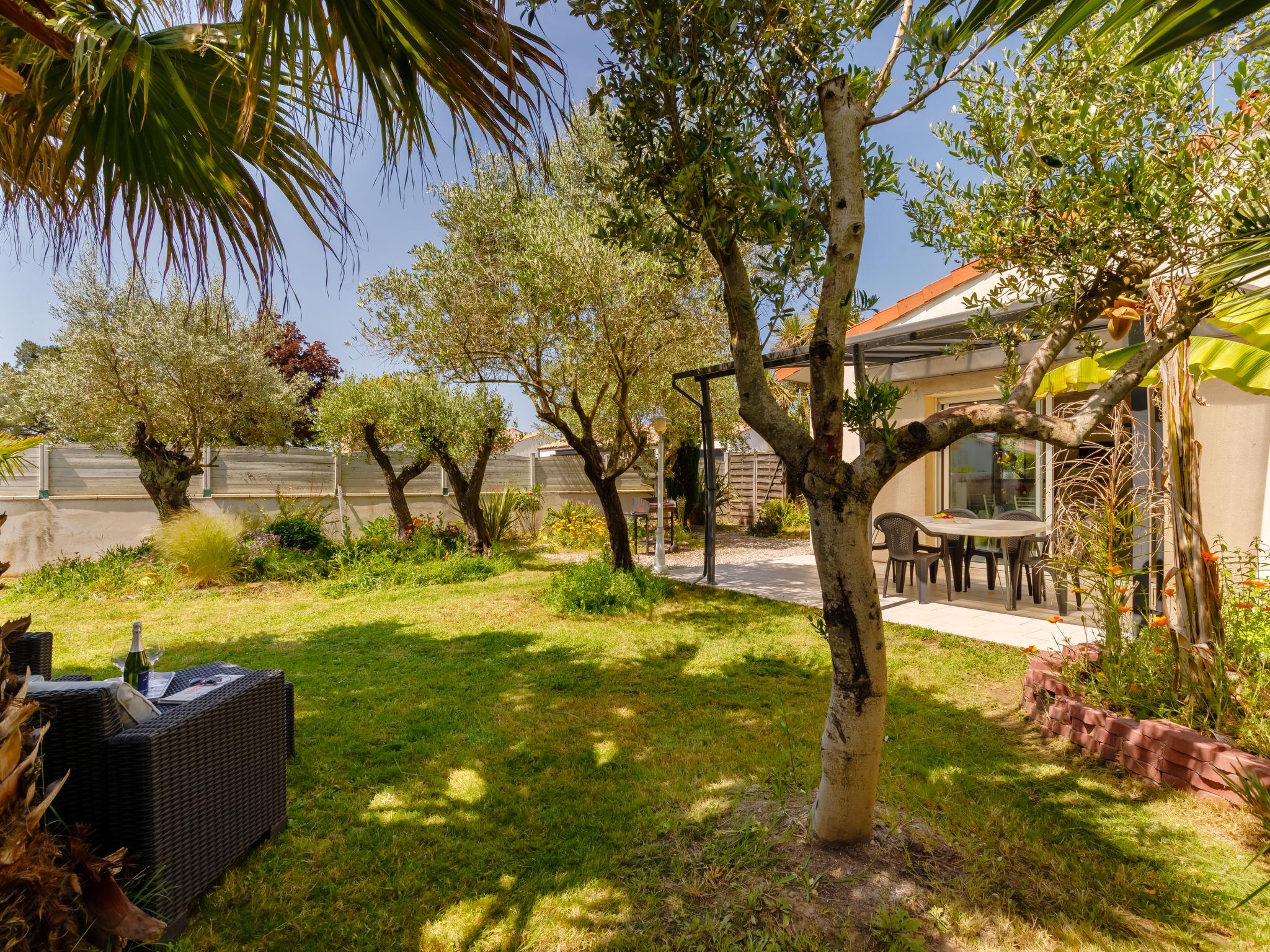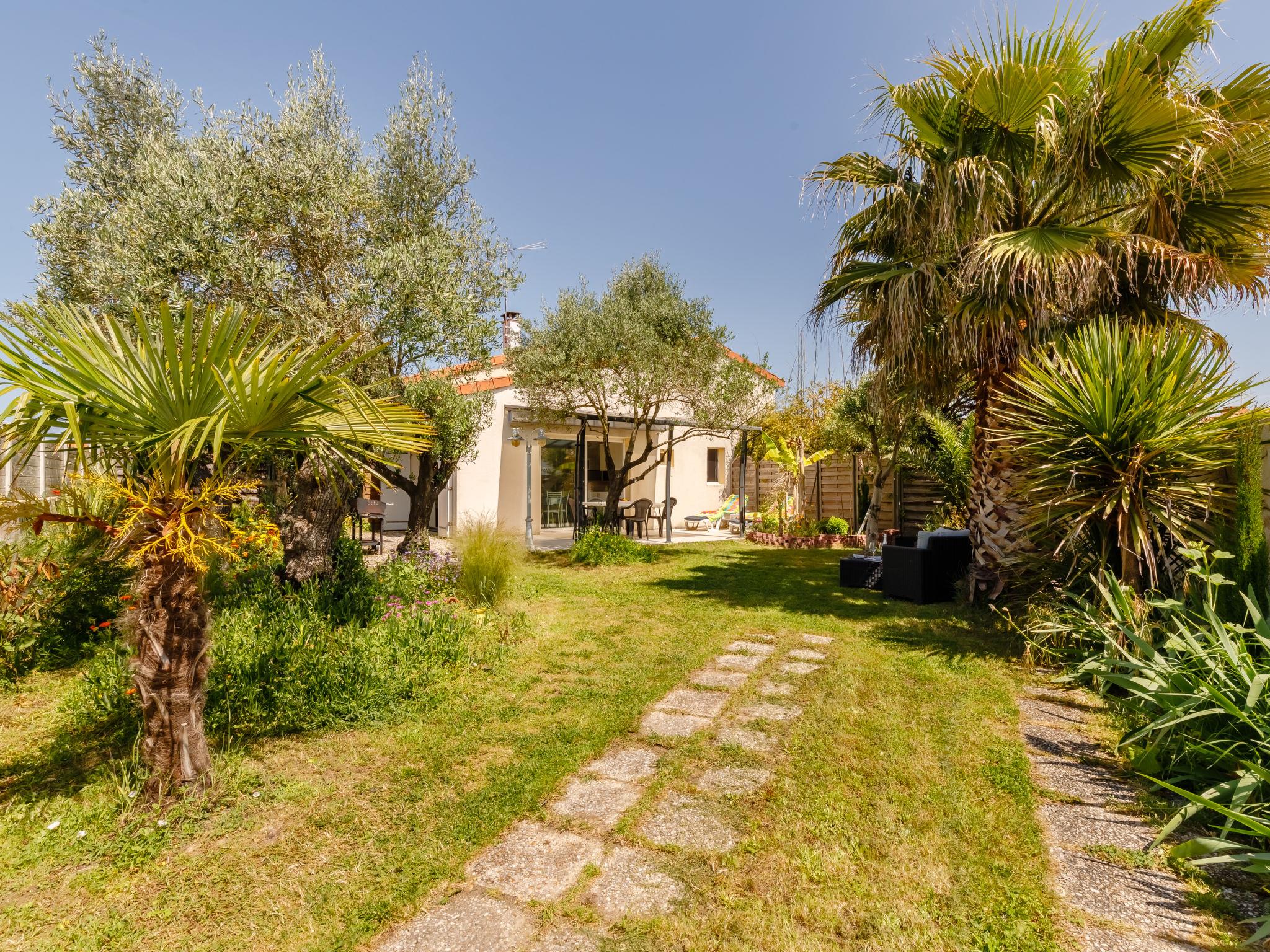 Terraced house "Les Oliviers". In the district of Le Querry Pigeon, 6 km from the centre of Talmont-Saint Hilaire, 16 km from the centre of Les Sables d'Olonne, in the residential district, 1.3 km from the sea. Private: property 300 m2 (fenced) with lawn and trees. Pergola, parking on the premises. Shop 300 m, supermarket 6 km, bus stop 6 km, sandy beach "Le Veillon" 1.3 km. Sports harbour 1.3 km. Nearby attractions: Port Bourgenay 1.3 km.