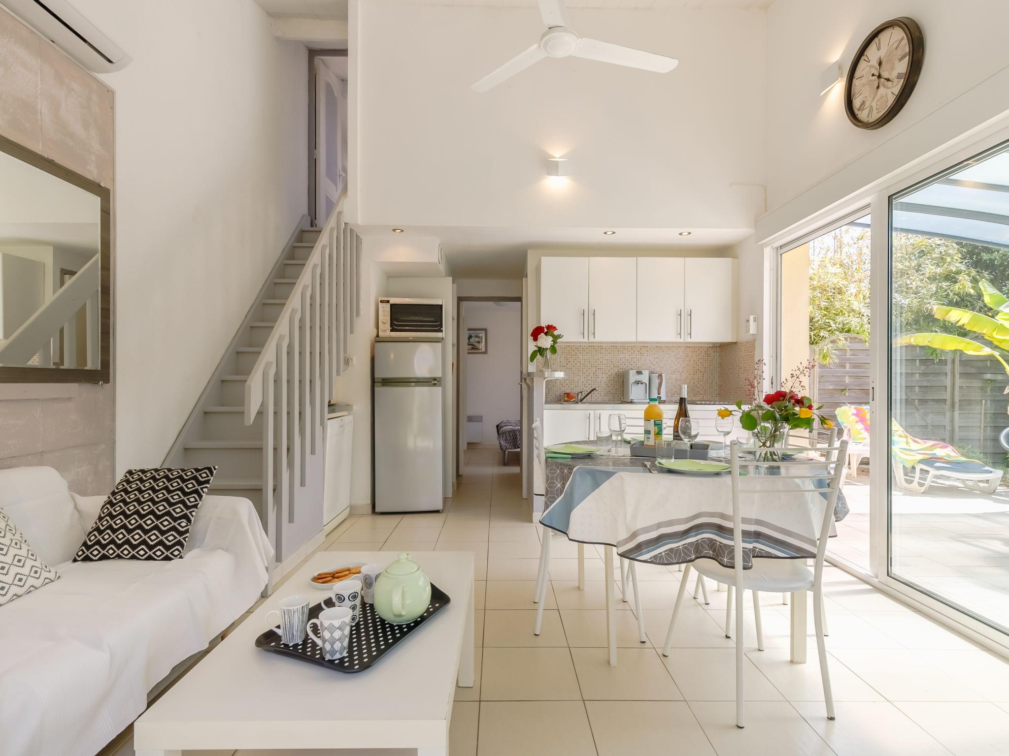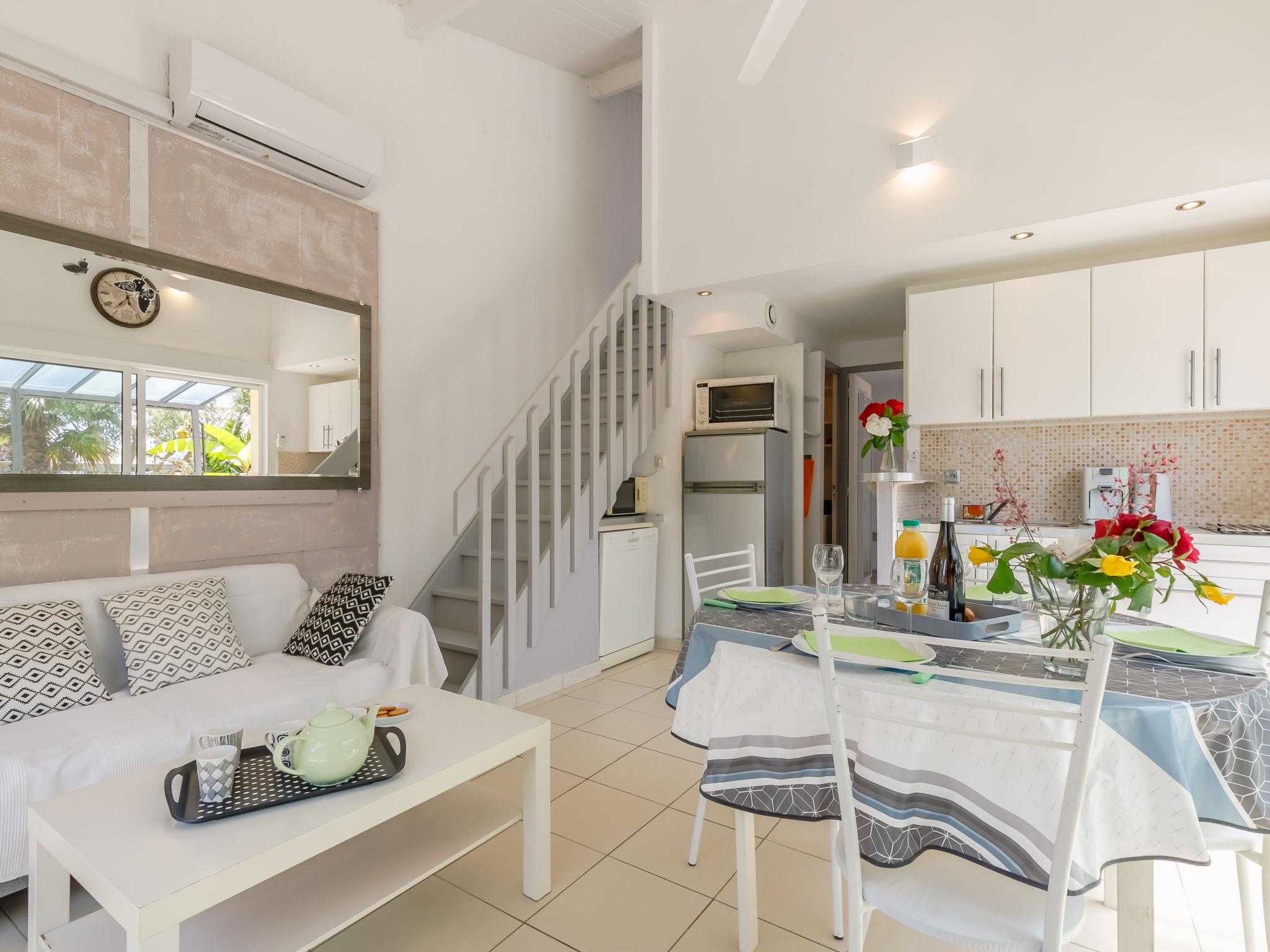 "Les Oliviers", 3-room house 45 m2 on 2 levels. Beautiful furnishings: living/dining room with dining table, satellite TV, hi-fi system and DVD. Exit to the terrace. 1 room with 1 french bed (140 cm, length 190 cm). Open kitchen (oven, dishwasher, 2 induction hot plates, toaster, kettle, microwave, freezer, electric coffee machine, Capsules for coffee machine (Senseo) extra). Exit to the terrace. Shower, sep. WC. Upper floor: 1 room with sloping ceilings with 2 beds (90 cm, length 190 cm), 1 sofabed (140 cm, length 190 cm). Electric heating. Terrace. Terrace furniture, barbecue (portable), deck chairs (2). Facilities: washing machine, iron, children's high chair, baby cot. Internet (WiFi, free). Please note: maximum 1 pet/ dog allowed. Smoke alarm. Bed layout is flexible. There are more sleeping options available than the maximum number of people allowed which may, however, not be exceeded.