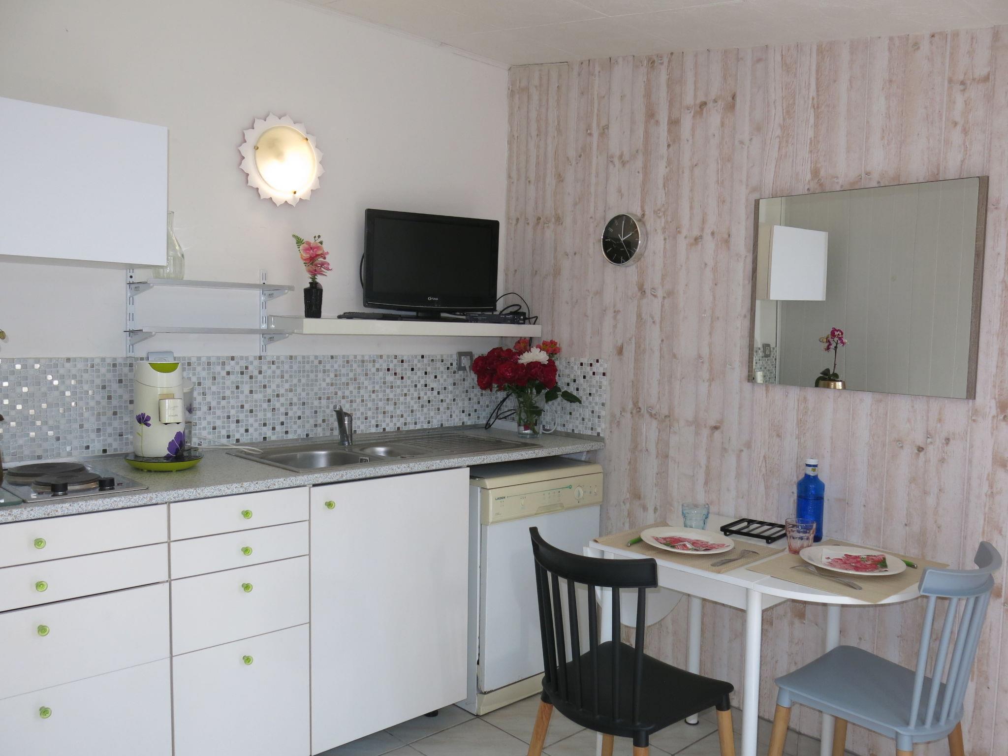 "Roses Tremières", 2-room house 25 m2. Simple and beautiful furnishings: interconnecting room with veranda. 1 small room with 2 beds (90 cm, length 200 cm). Kitchen-/living room (2 hot plates, dishwasher, toaster, kettle, microwave, electric coffee machine, Capsules for coffee machine (Senseo) extra) with dining nook and satellite TV. Exit to the veranda. Shower/WC. Electric heating. Terrace. Terrace furniture, barbecue (portable), deck chairs (2). Facilities: washing machine, iron. Internet (WiFi, free). Please note: non-smoking house. Maximum 1 pet/ dog allowed. Smoke alarm.