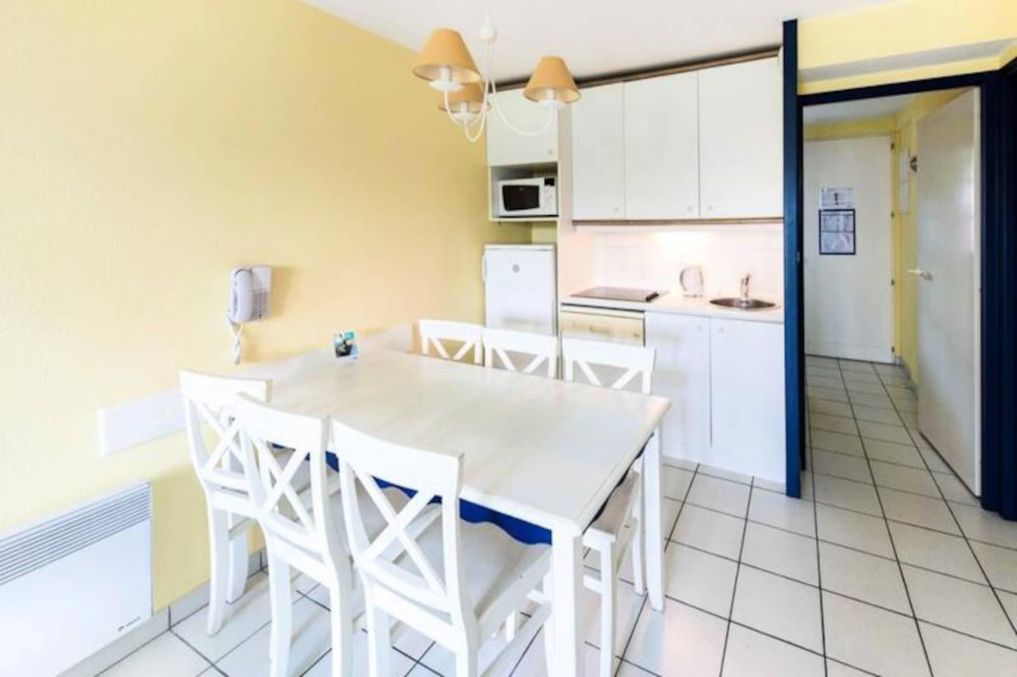 Denne hyggelige lejlighed, beliggende på en 90 hektar stor ejendom, kan komfortabelt rumme op til 6 gæster. Det har en stue med to sovesofaer (en med en trille), et kabineområde med køjesenge og et soveværelse med en dobbeltseng. Yderligere faciliteter omfatter et fladskærms-tv, opbevaringsplads og en møbleret terrasse. Kæledyr er tilladt i visse boliger mod et ekstra gebyr. Gratis udækket parkering er tilgængelig for gæster. Der opkræves et obligatorisk slutrengøringsgebyr. Boligen er ideelt beliggende kun 2,5 km fra Veillon-stranden, let tilgængelig til fods, på cykel eller via shuttle-service. Omgivet af fyrreskove kan gæsterne nyde naturskønne gå- og cykelture. Området byder på en bred vifte af aktiviteter, herunder to 18-hullers golfbaner, tennis, minigolf og adskillige vandsportsaktiviteter. I nærheden kan besøgende udforske caféer, et pizzeria, bageri og en bar/isbar. Lejligheden har et fuldt udstyret køkkenområde åbent til stuen, ideel til at tilberede måltider. Badeværelset har badekar og separat toilet. Gæsterne vil også have adgang til tre swimmingpools, en vandrutsjebane og et soppebassin, der er tilgængeligt i sommersæsonen. Wifi-adgang er tilgængelig mod et ekstra gebyr, og sengelinned og håndklæder kan leveres mod et ekstra gebyr.