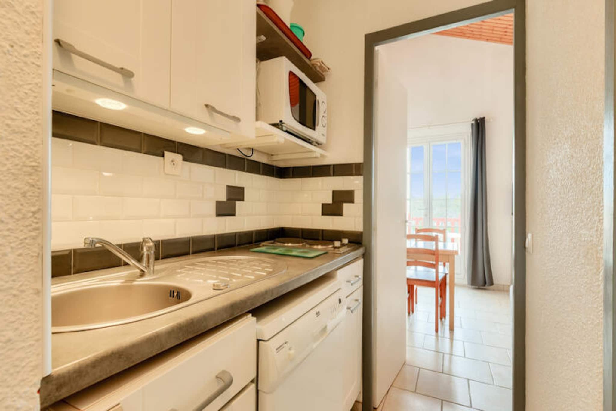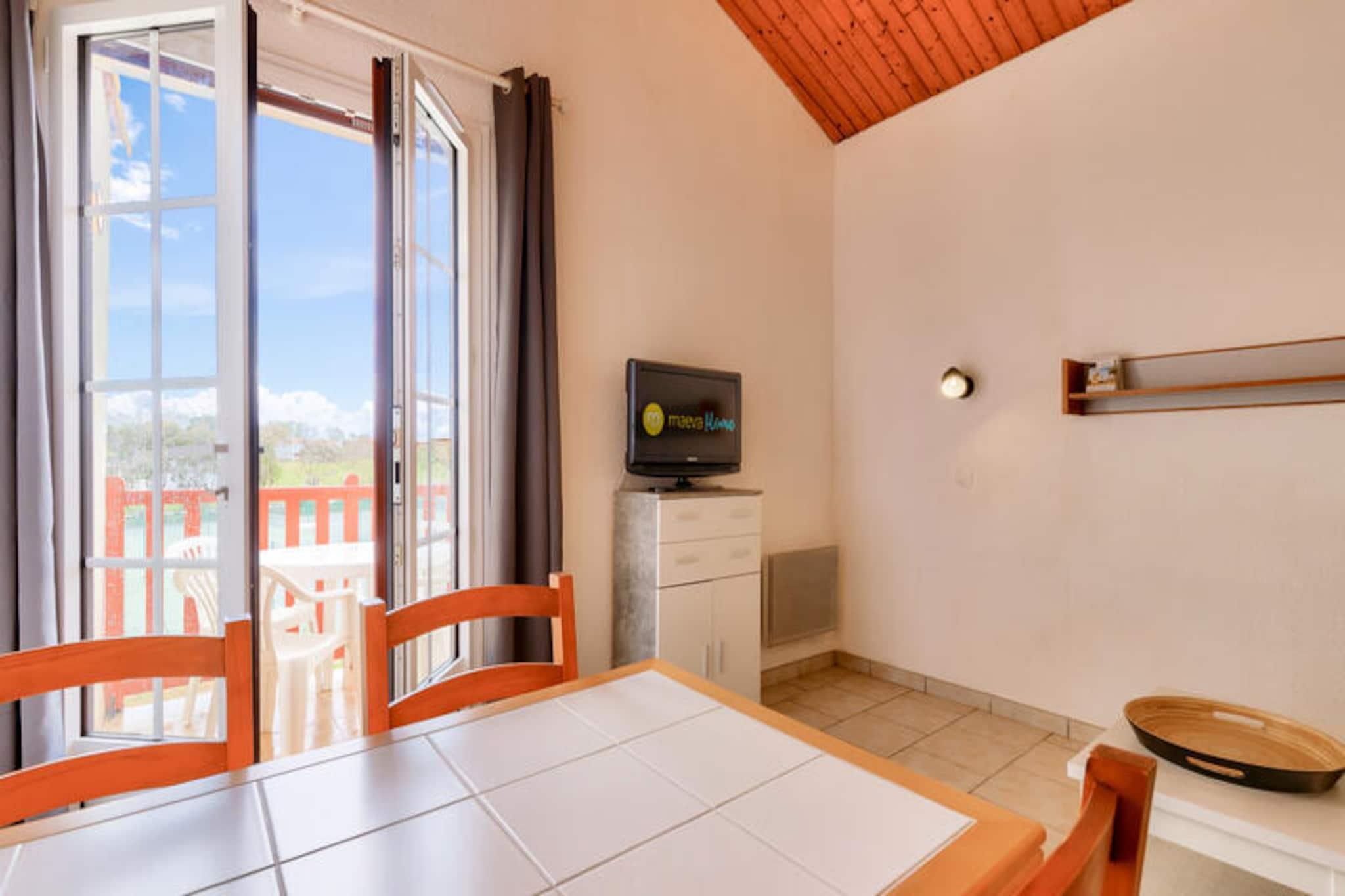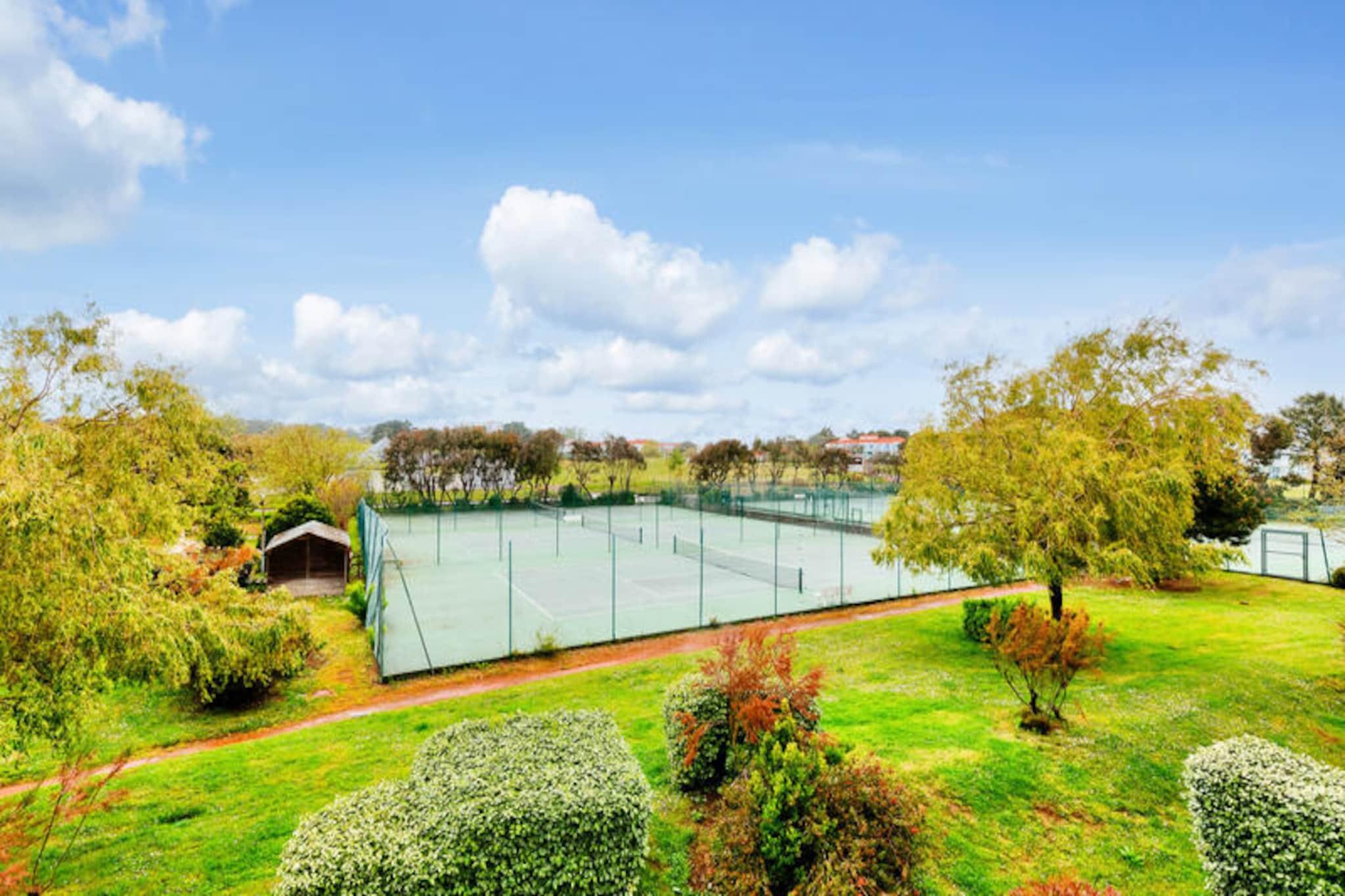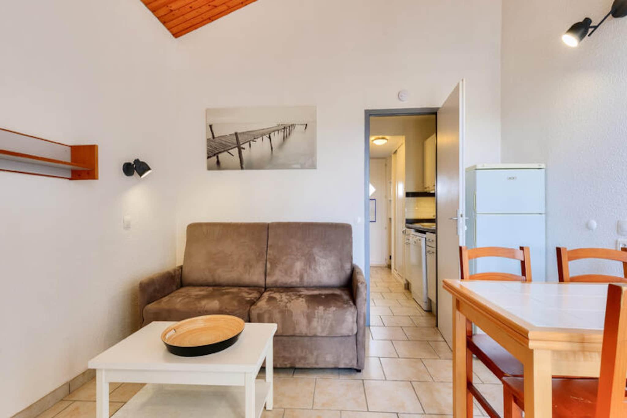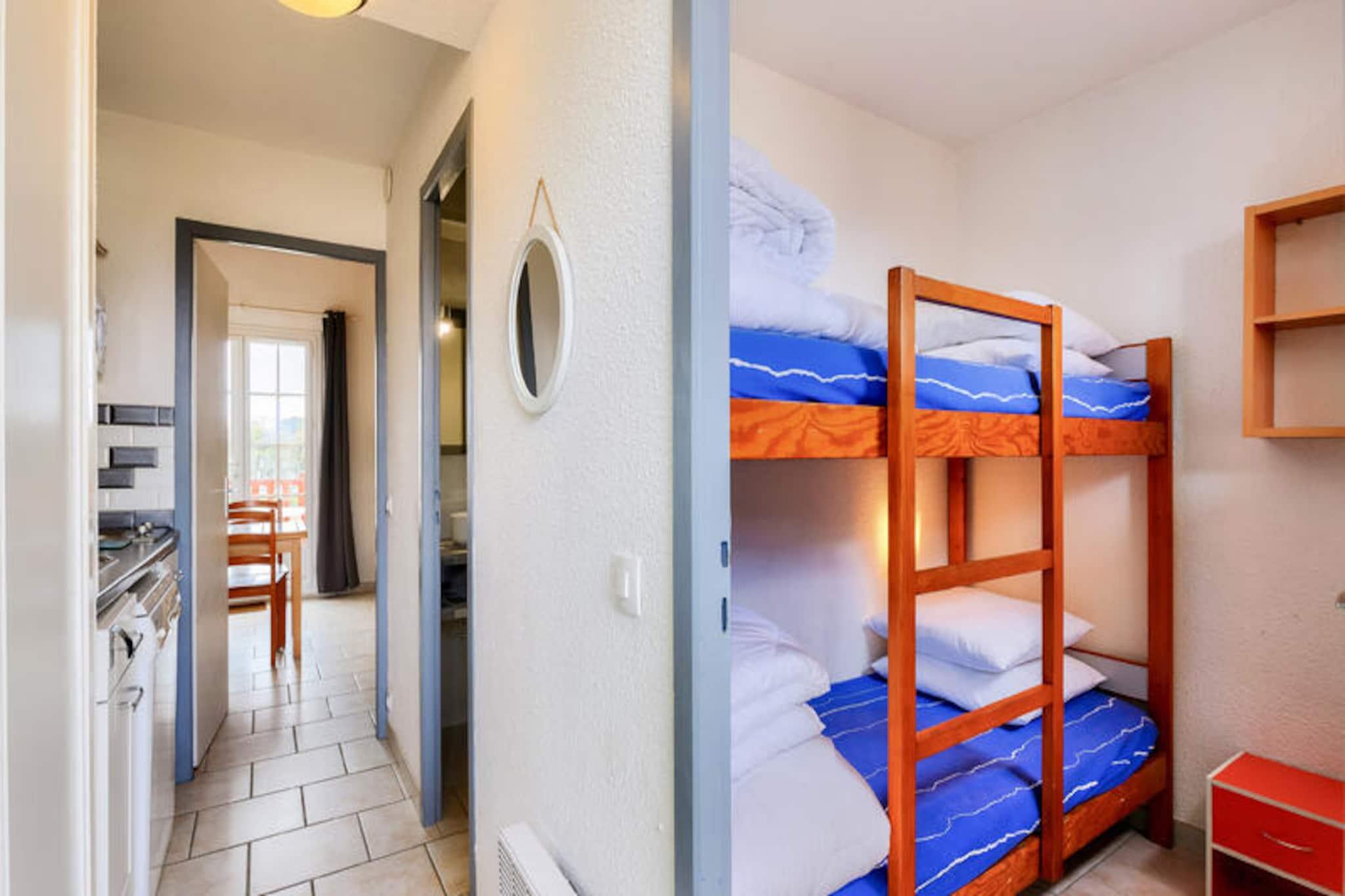 Denne charmerende lejlighed tilbyder et behageligt ophold for familier eller små grupper, og byder på en stue med en sovesofa, et kabineområde med køjesenge og et badeværelse med bruser. Ejendommen kan rumme op til fire personer og er udstyret med væsentlige faciliteter såsom et tv og et sofabord. Balkonen giver en fredfyldt udsigt over golfbanen, hvilket skaber fredelige omgivelser til at slappe af. Kæledyr er tilladt i udvalgte overnatningssteder, og der kan forekomme yderligere gebyrer. Et babysæt er tilgængeligt efter anmodning, og linned og håndklæder er tilgængelige mod et tillægsgebyr. Slutrengøring er obligatorisk og skal betales ved ankomsten. Lejligheden er ideelt beliggende i hjertet af landsbyen, i gåafstand fra forskellige attraktioner, herunder golfbaner og sportsaktiviteter. Det er kun 500 meter fra havet og mindre end 500 meter fra lokale virksomheder. Området byder på adskillige udendørs aktiviteter, herunder vandreture, golf og tennis, samt muligheder for at nyde den naturlige skønhed i den omkringliggende fyrreskov. Den nærliggende strand ligger kun 2,5 km væk, let tilgængelig via en shuttle eller til fods. Lejligheden har et fuldt udstyret køkken, hvor gæsterne kan tilberede måltider, samt et separat toilet for ekstra bekvemmelighed. Boligen tilbyder gratis parkering, og gæsterne kan nyde adgang til opvarmede swimmingpools og et vandområde med rutsjebaner og soppebassiner. Yderligere faciliteter inkluderer Wi-Fi (mod et ekstra gebyr), et tv og forskellige fritidsmuligheder såsom minigolf og tennis.