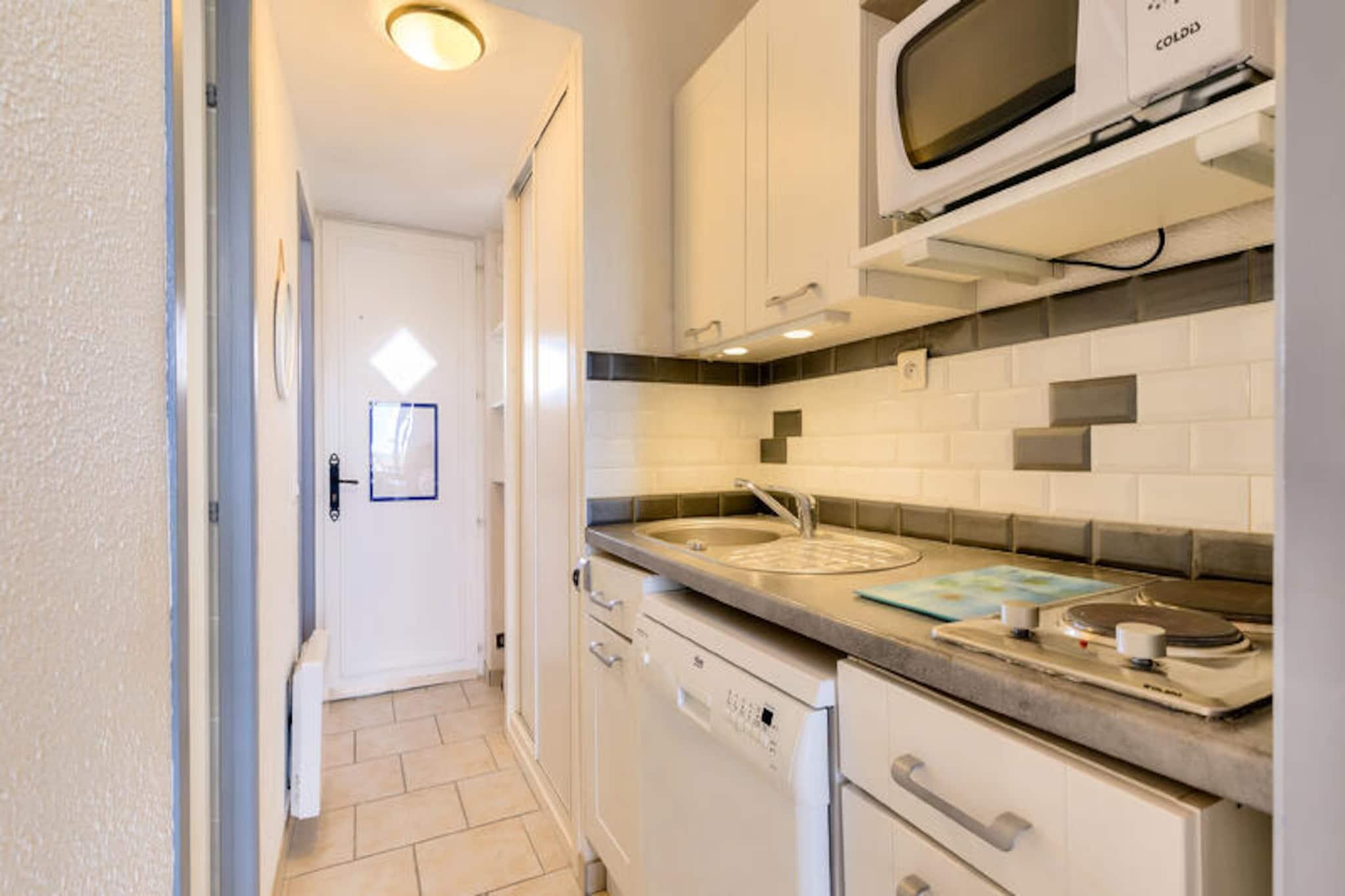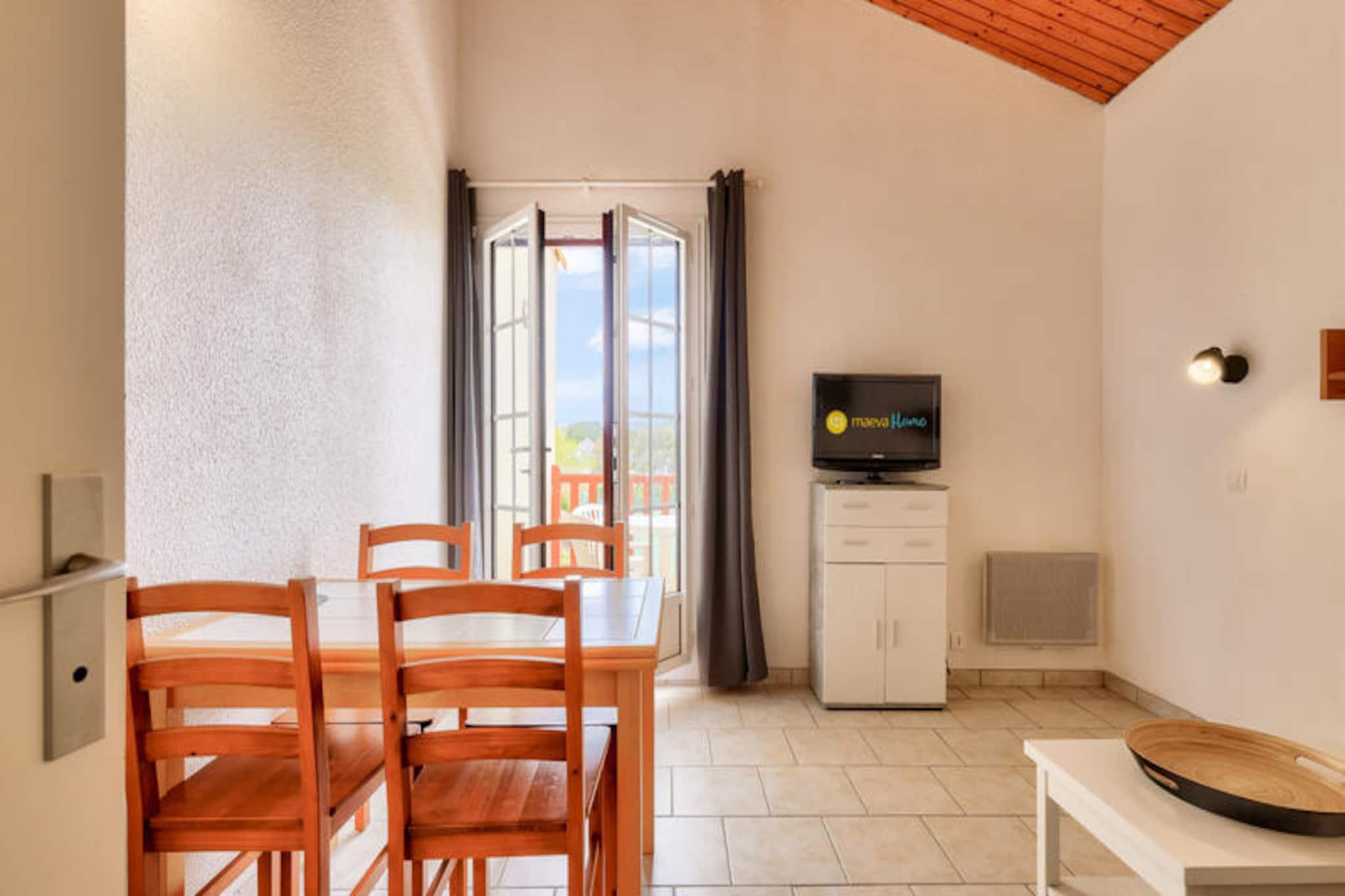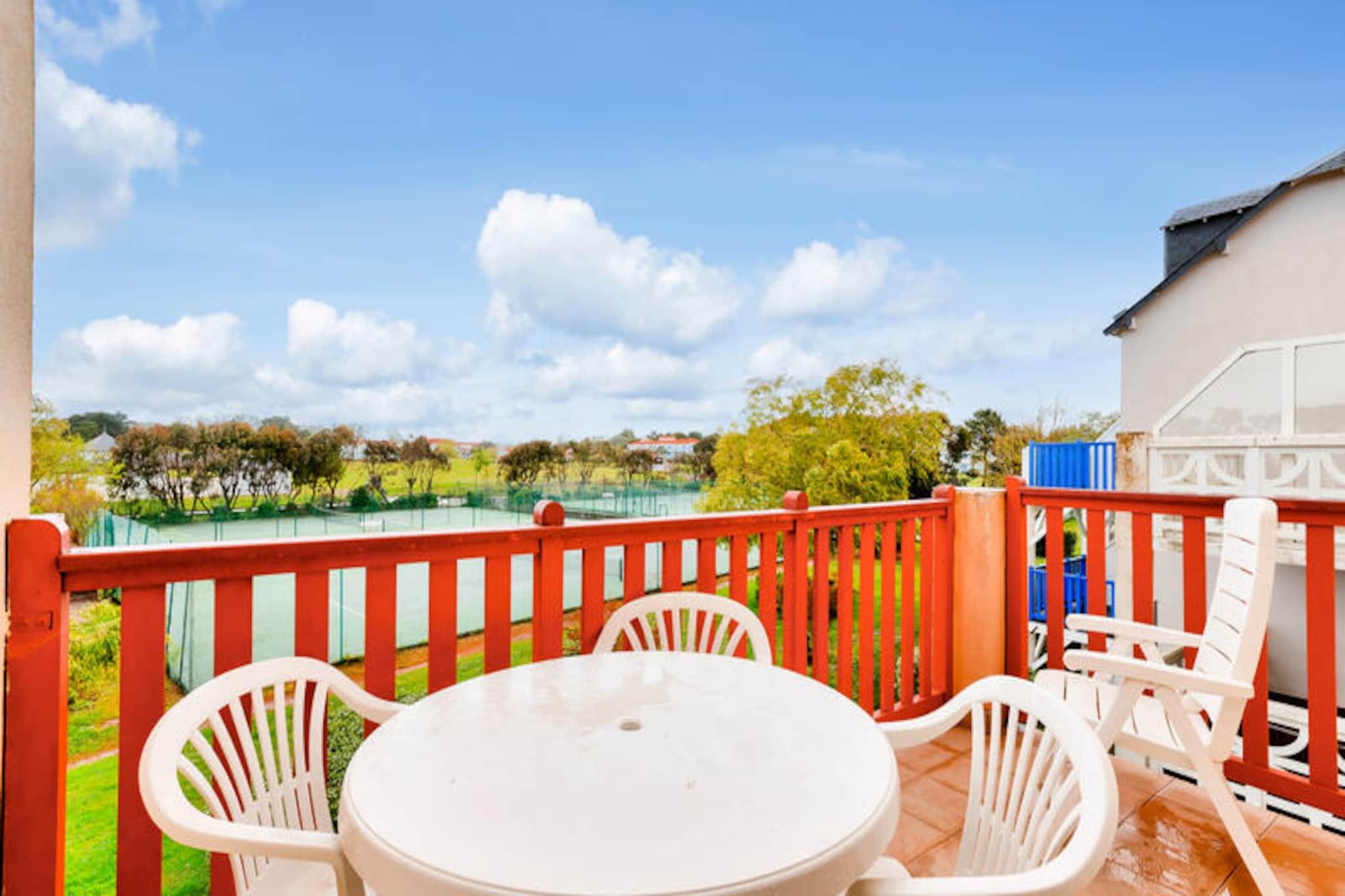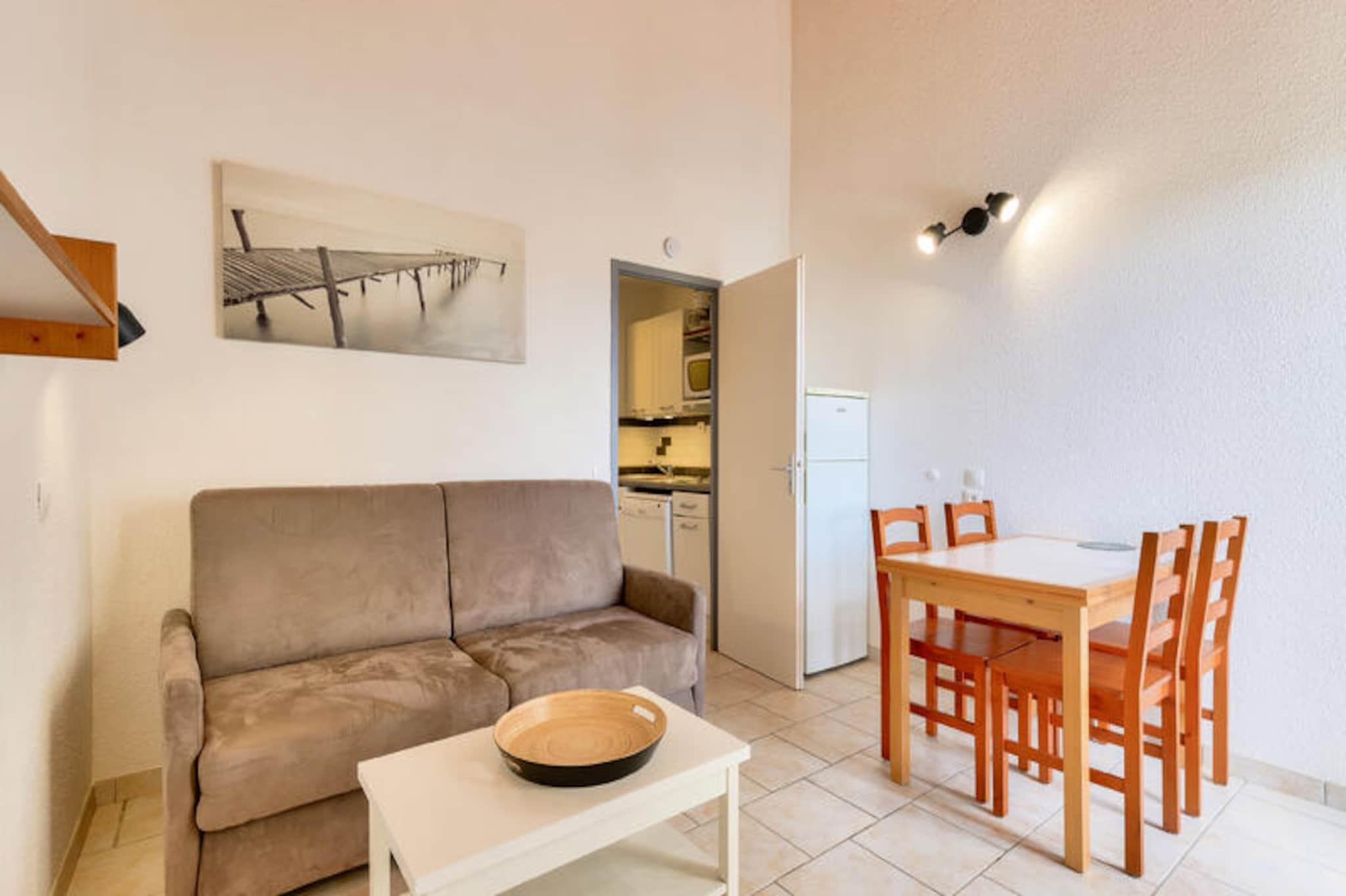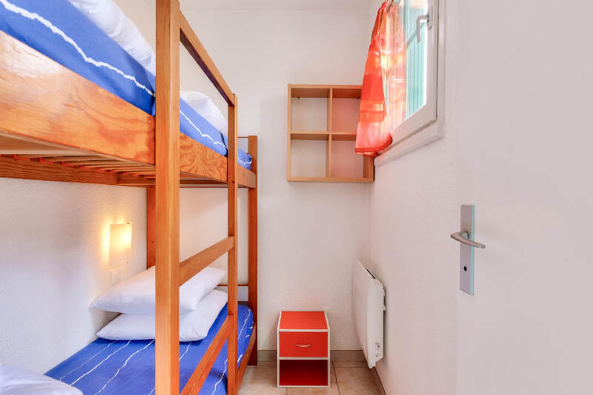 Denne charmerende lejlighed tilbyder et behageligt ophold for familier eller små grupper, og byder på en stue med en sovesofa, et kabineområde med køjesenge og et badeværelse med bruser. Ejendommen kan rumme op til fire personer og er udstyret med væsentlige faciliteter såsom et tv og et sofabord. Balkonen giver en fredfyldt udsigt over golfbanen, hvilket skaber fredelige omgivelser til at slappe af. Kæledyr er tilladt i udvalgte overnatningssteder, og der kan forekomme yderligere gebyrer. Et babysæt er tilgængeligt efter anmodning, og linned og håndklæder er tilgængelige mod et tillægsgebyr. Slutrengøring er obligatorisk og skal betales ved ankomsten. Lejligheden er ideelt beliggende i hjertet af landsbyen, i gåafstand fra forskellige attraktioner, herunder golfbaner og sportsaktiviteter. Det er kun 500 meter fra havet og mindre end 500 meter fra lokale virksomheder. Området byder på adskillige udendørs aktiviteter, herunder vandreture, golf og tennis, samt muligheder for at nyde den naturlige skønhed i den omkringliggende fyrreskov. Den nærliggende strand ligger kun 2,5 km væk, let tilgængelig via en shuttle eller til fods. Lejligheden har et fuldt udstyret køkken, hvor gæsterne kan tilberede måltider, samt et separat toilet for ekstra bekvemmelighed. Boligen tilbyder gratis parkering, og gæsterne kan nyde adgang til opvarmede swimmingpools og et vandområde med rutsjebaner og soppebassiner. Yderligere faciliteter inkluderer Wi-Fi (mod et ekstra gebyr), et tv og forskellige fritidsmuligheder såsom minigolf og tennis.