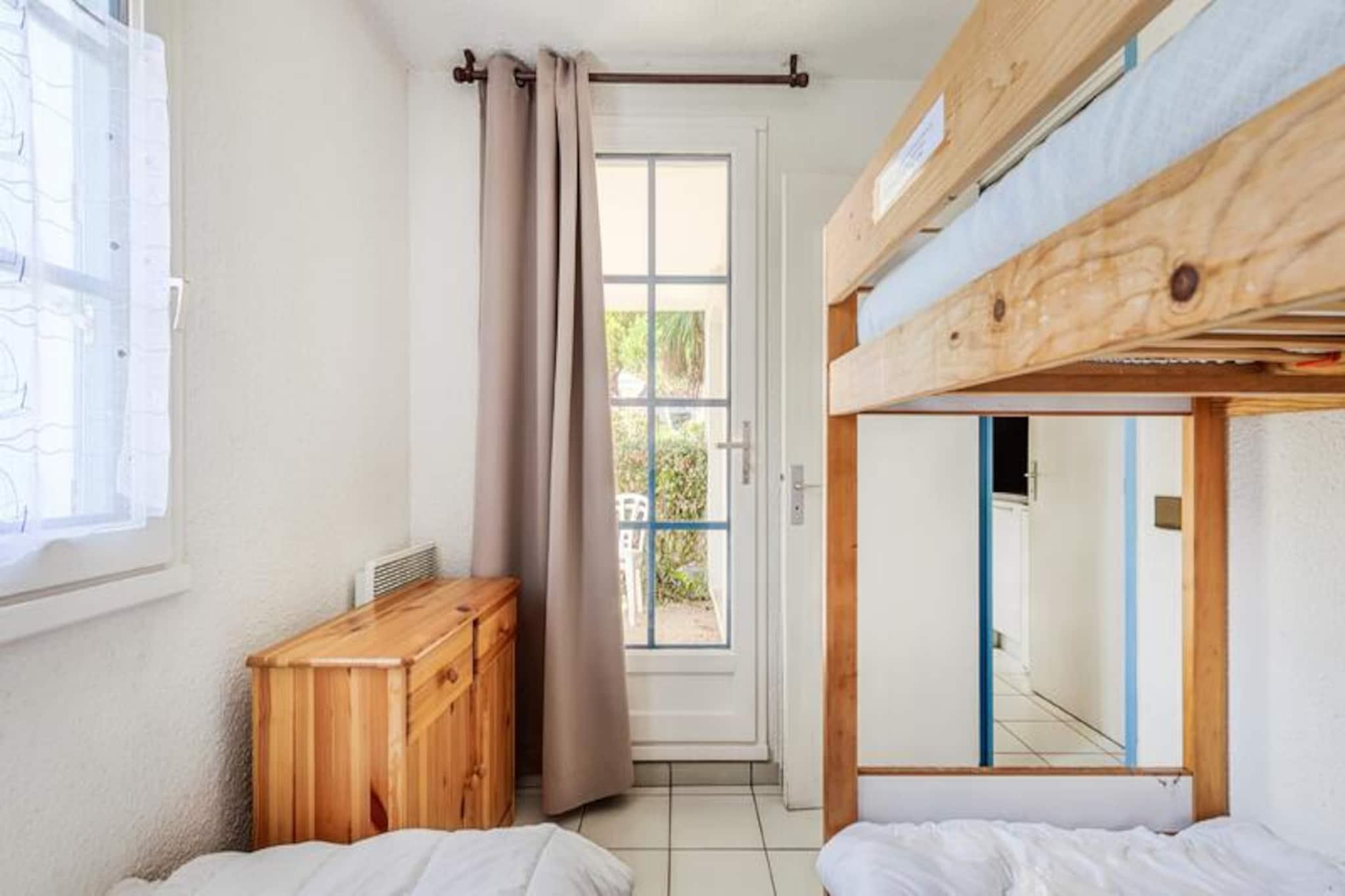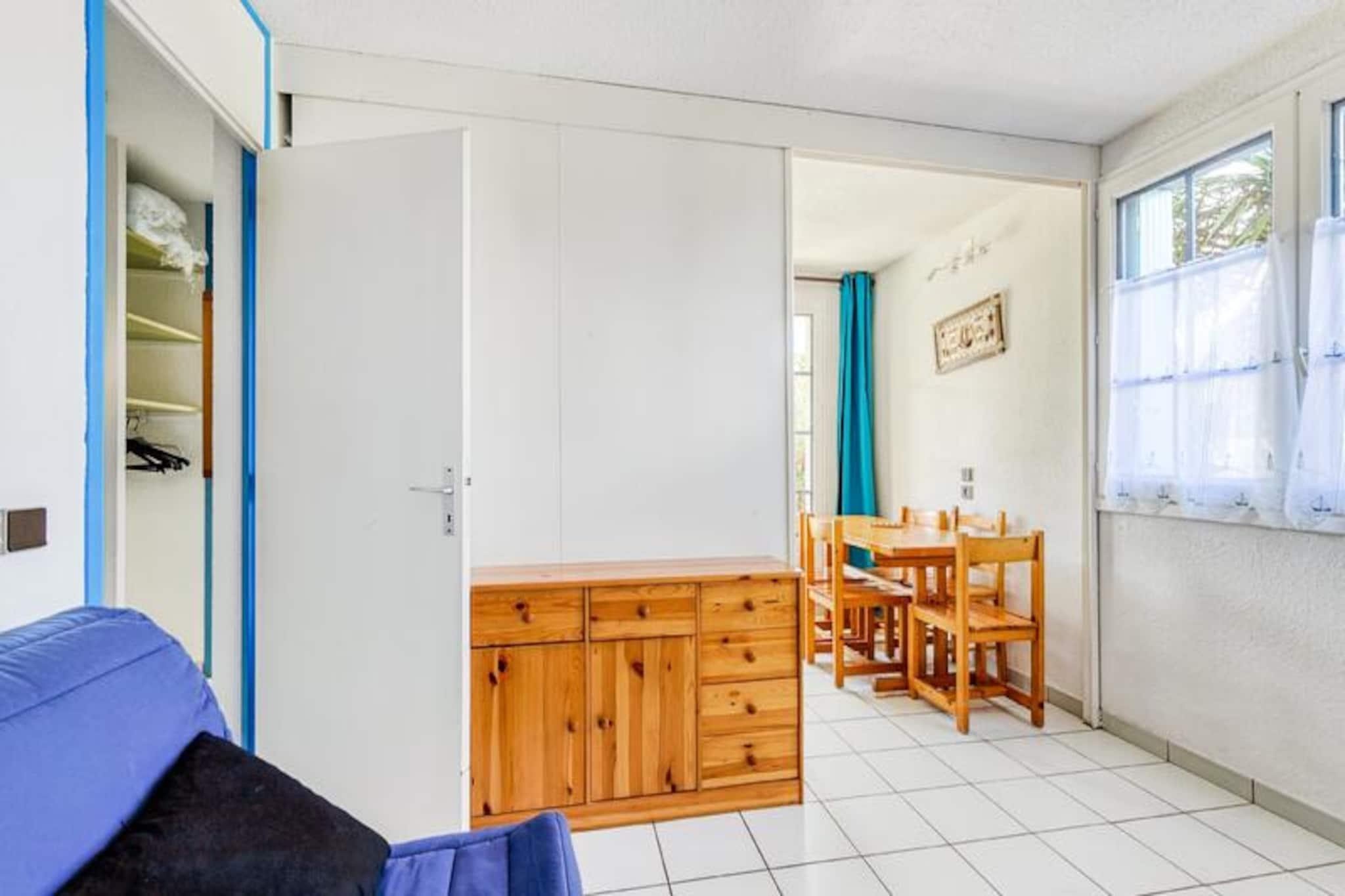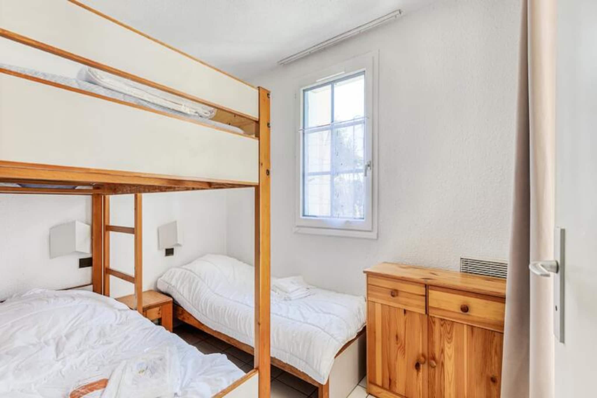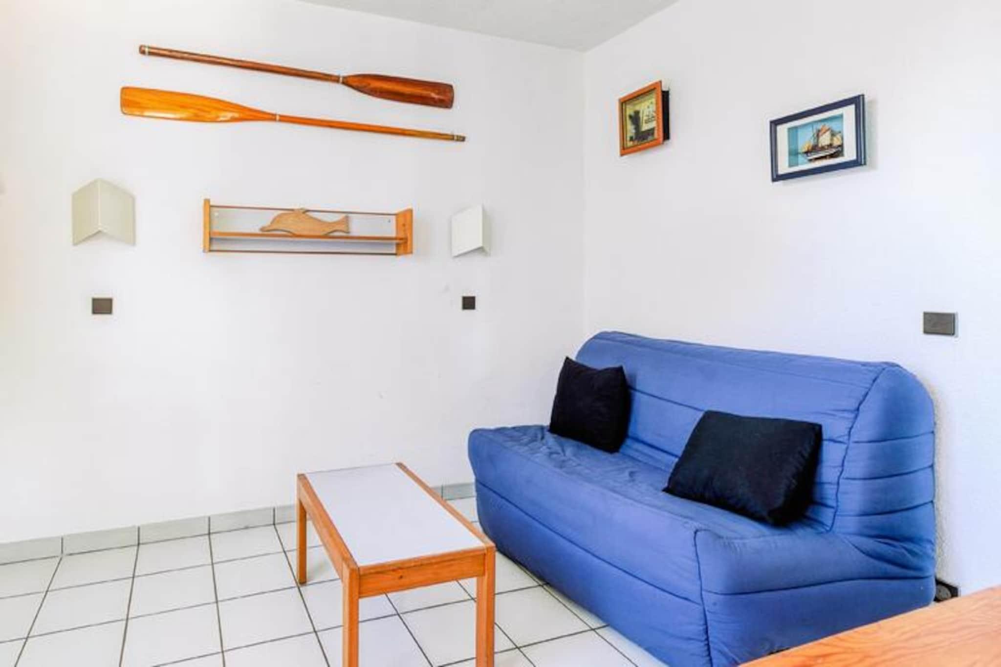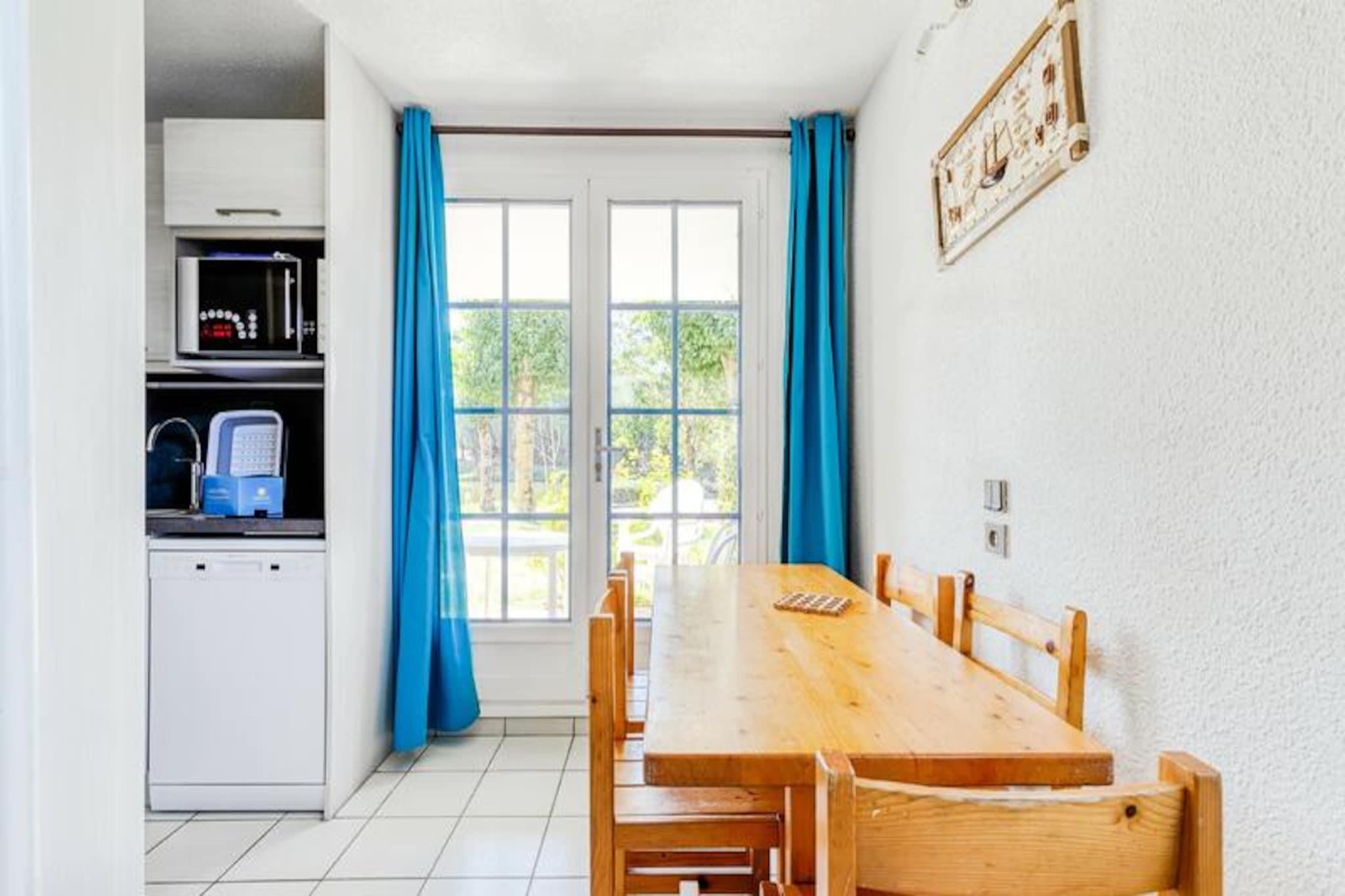 Denne hyggelige lejlighed i stueetagen kan rumme op til 5 gæster, med en komfortabel stue med en sovesofa, spiseplads til 5 og et soveværelse med en enkeltseng og køjesenge. Den private sydvendte terrasse er perfekt til udendørs afslapning. Kæledyr er velkomne (ekstra gebyrer), og lejligheden tilbyder gratis udækket parkering. Et babysæt er tilgængeligt efter anmodning, og WiFi tilbydes mod et tillægsgebyr. Beliggende i Vendée-regionen tilbyder boligen nem adgang til havet, enten til fods eller på cykel gennem en fyrreskov eller med transport til Veillon-stranden. Gæsterne kan nyde nærliggende attraktioner såsom to 18-hullers golfbaner, tennis og minigolf. Faciliteterne på stedet inkluderer et pizzeria, bageri og isbar, og lokale butikker er tæt på til daglige behov. Lejligheden har et halvåbent køkken til hjemmelavet mad, et badeværelse med badekar og separat toilet samt masser af opbevaringsplads. Med sit velholdte, funktionelle design sikrer den et behageligt ophold. Yderligere tjenester såsom sengelinned, håndklæder og slutrengøring er tilgængelige mod et gebyr.